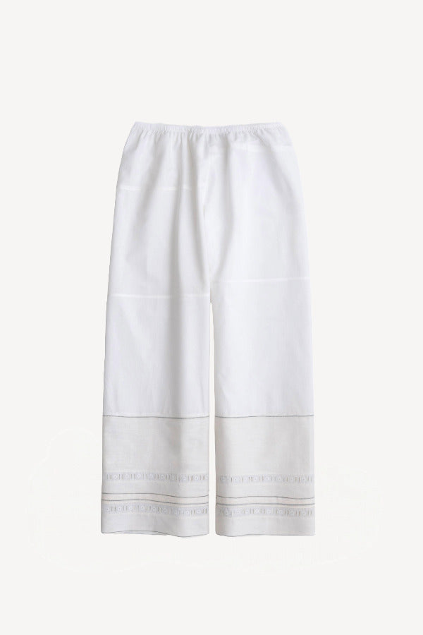 Dosa's Patched Pants with Blue Line in Rice are a cotton drawstring pant with vintage lace at the bottom.