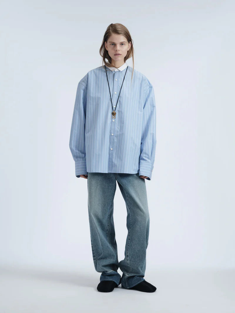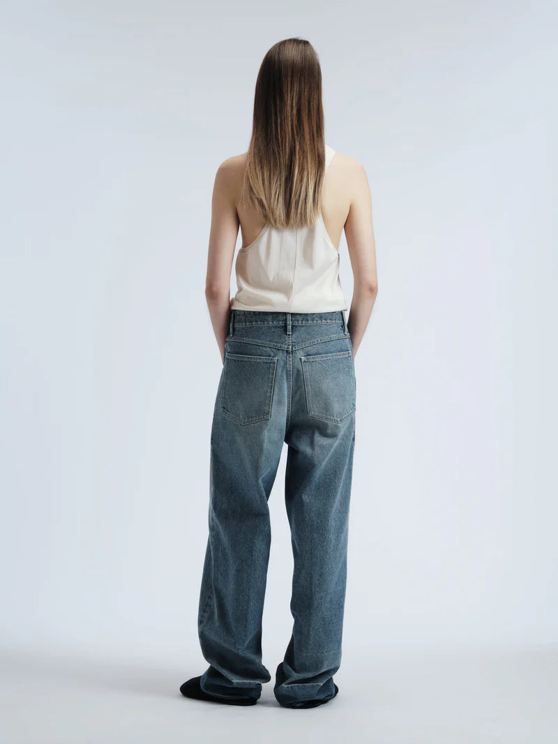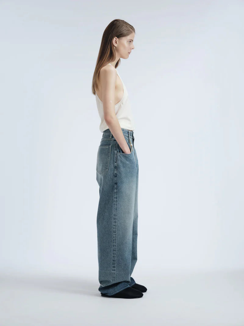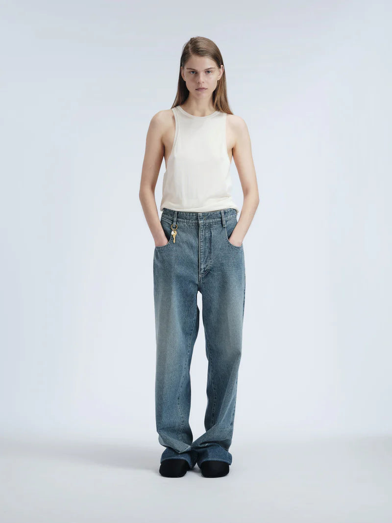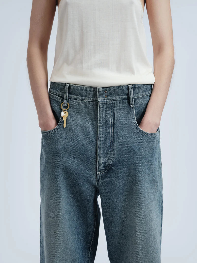 INFO Wide leg jeans in blue Japanese washed denim. The jeans are cut for a relaxed boyish fit. They feature a contrast hem in a dark blue wash and a key-charm with an engraved Carven brass key and single baroque pearl at the waist