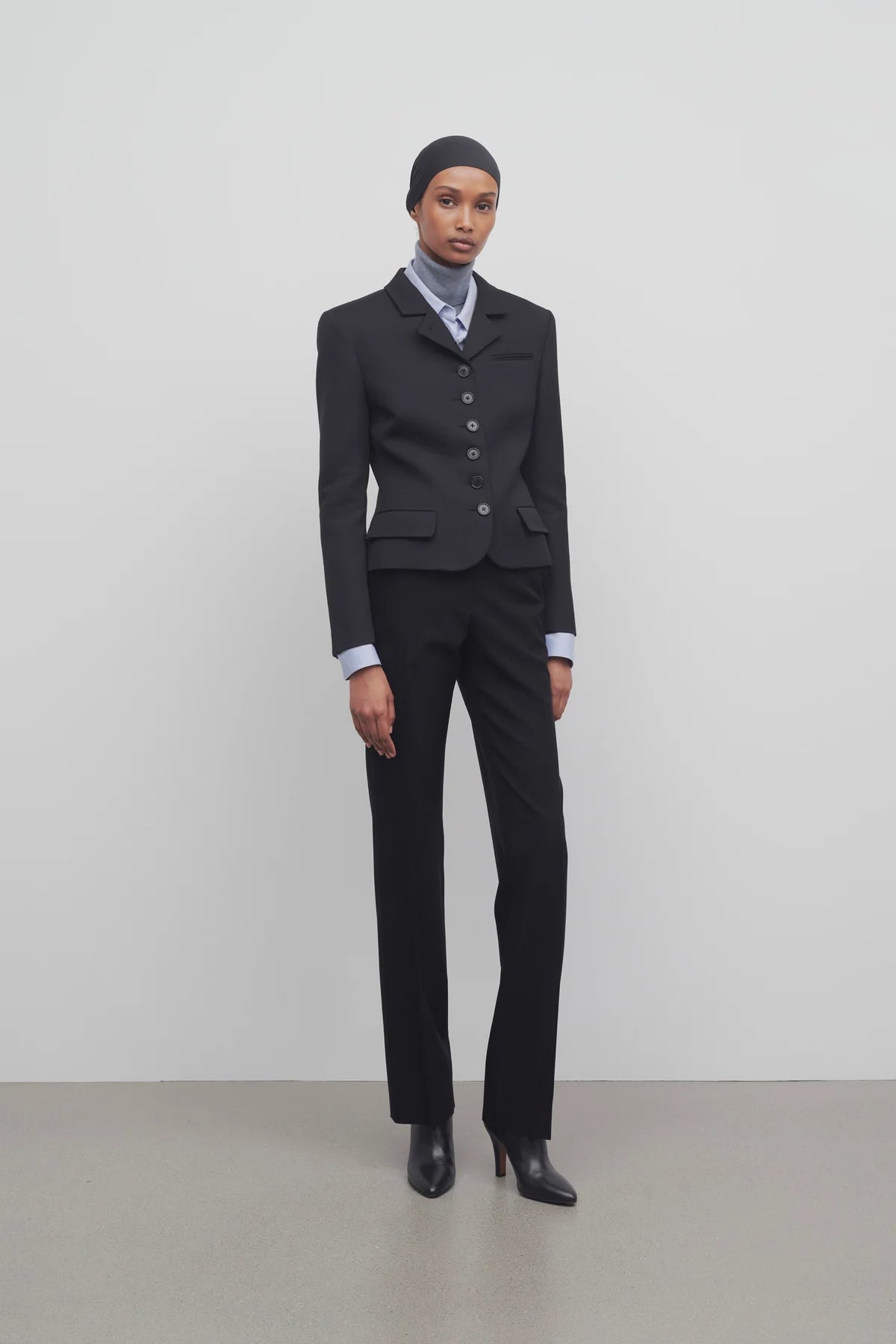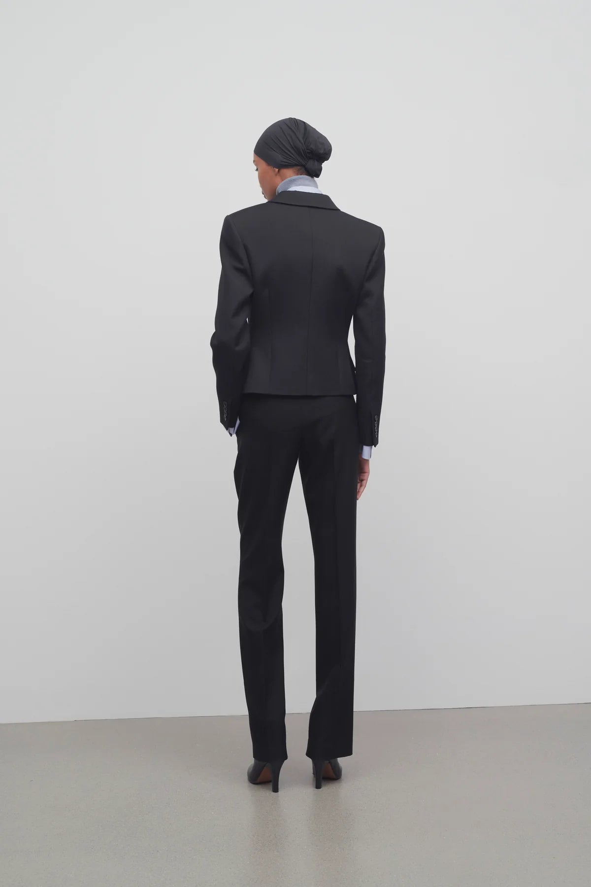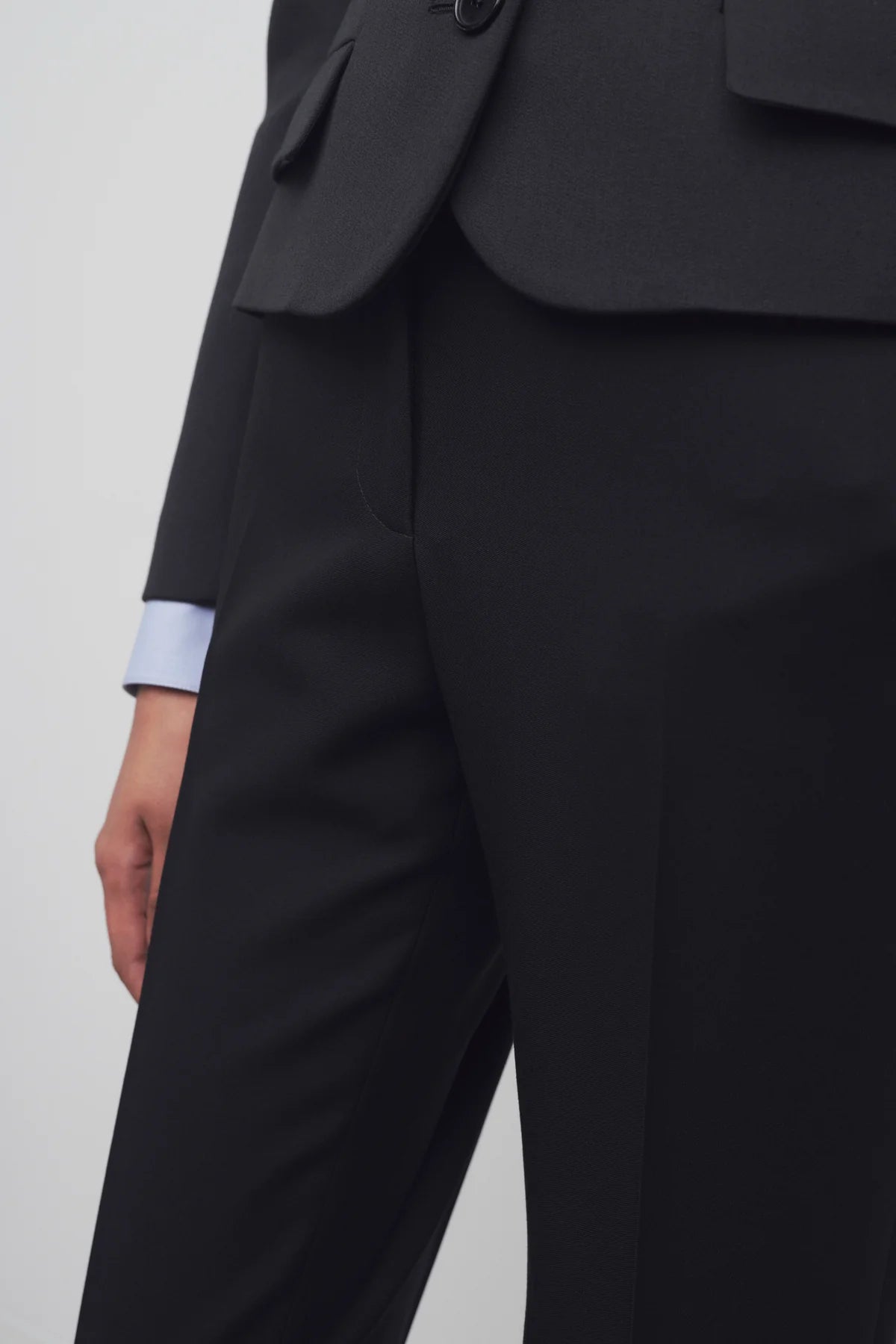 Jesse Pant in Wool Long, mid-rise tailored pant in Japanese wool with pressed front and back creases, tailored waistband construction, and side slash and back besom pockets. |