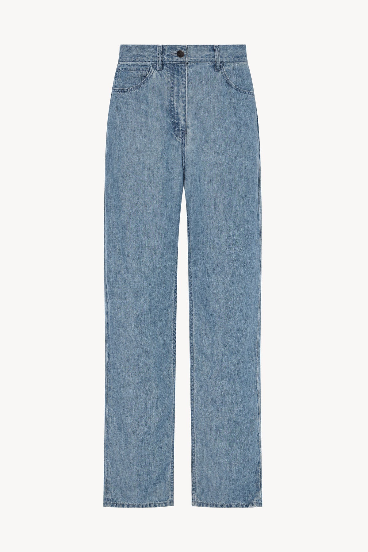 Mid-rise jean in soft linen denim with relaxed fit, tonal topstitching, and classic 5-pocket construction.