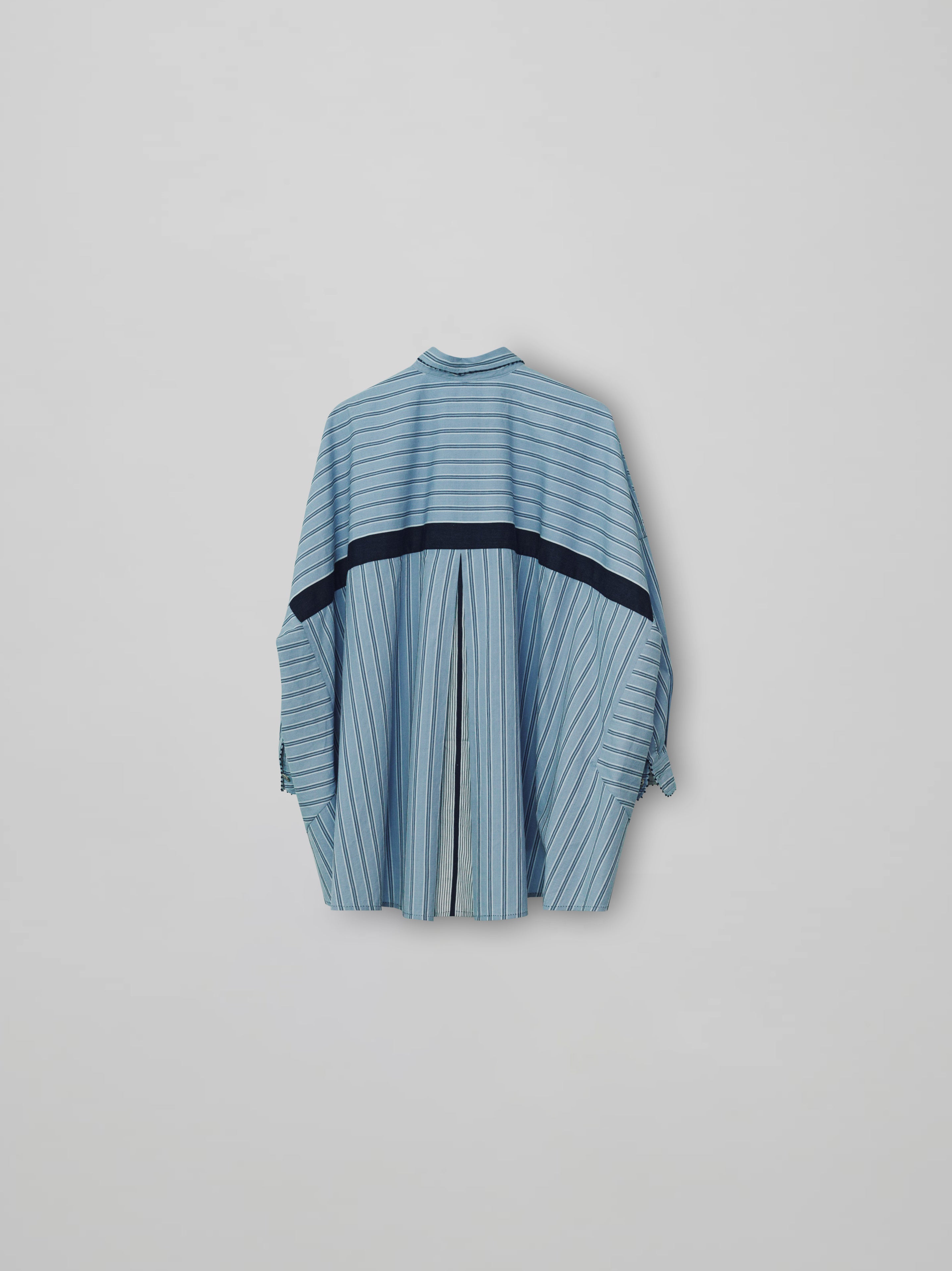 PERO oversized shirt in lightweight blue striped cotton, featuring mixed vertical and horizontal panels, a contrast back yoke with pleated center back, and subtle hand embroidery at the cuffs and hem.