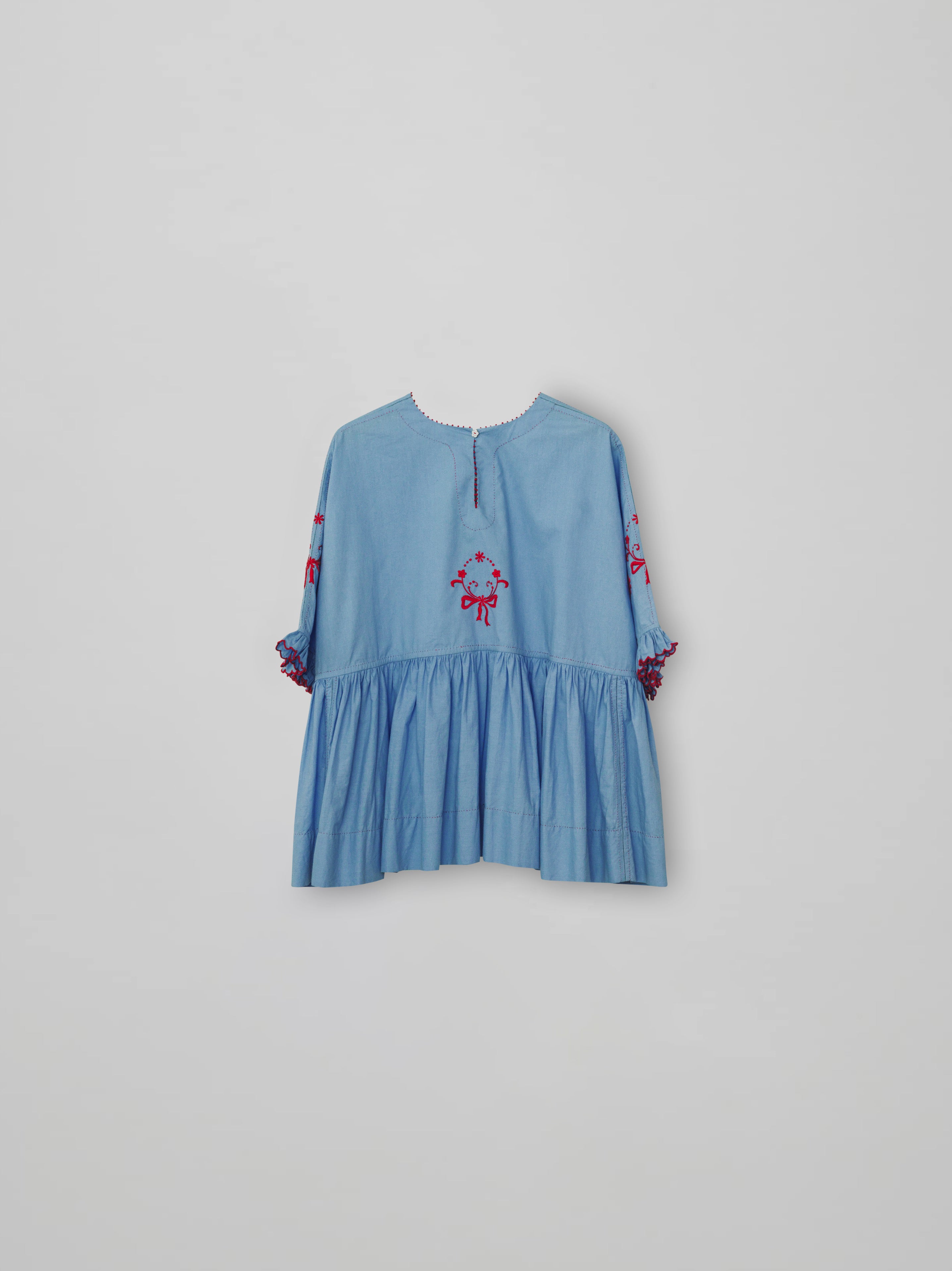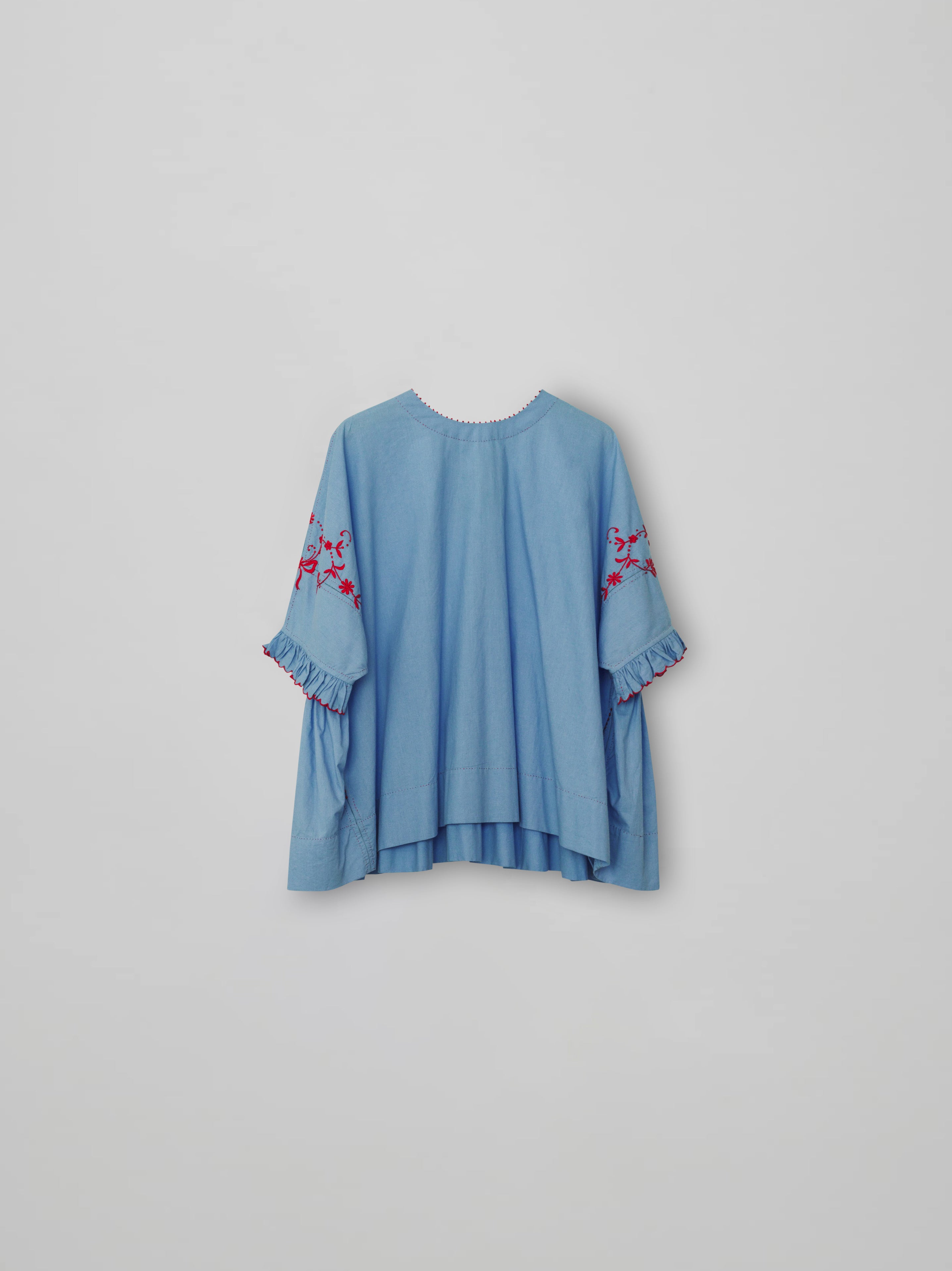 PERO Top is a sky-blue cotton jersey tee featuring a classic crew neck, short sleeves, and red embroidery details. The relaxed, slightly cropped silhouette offers a clean, effortless aesthetic.