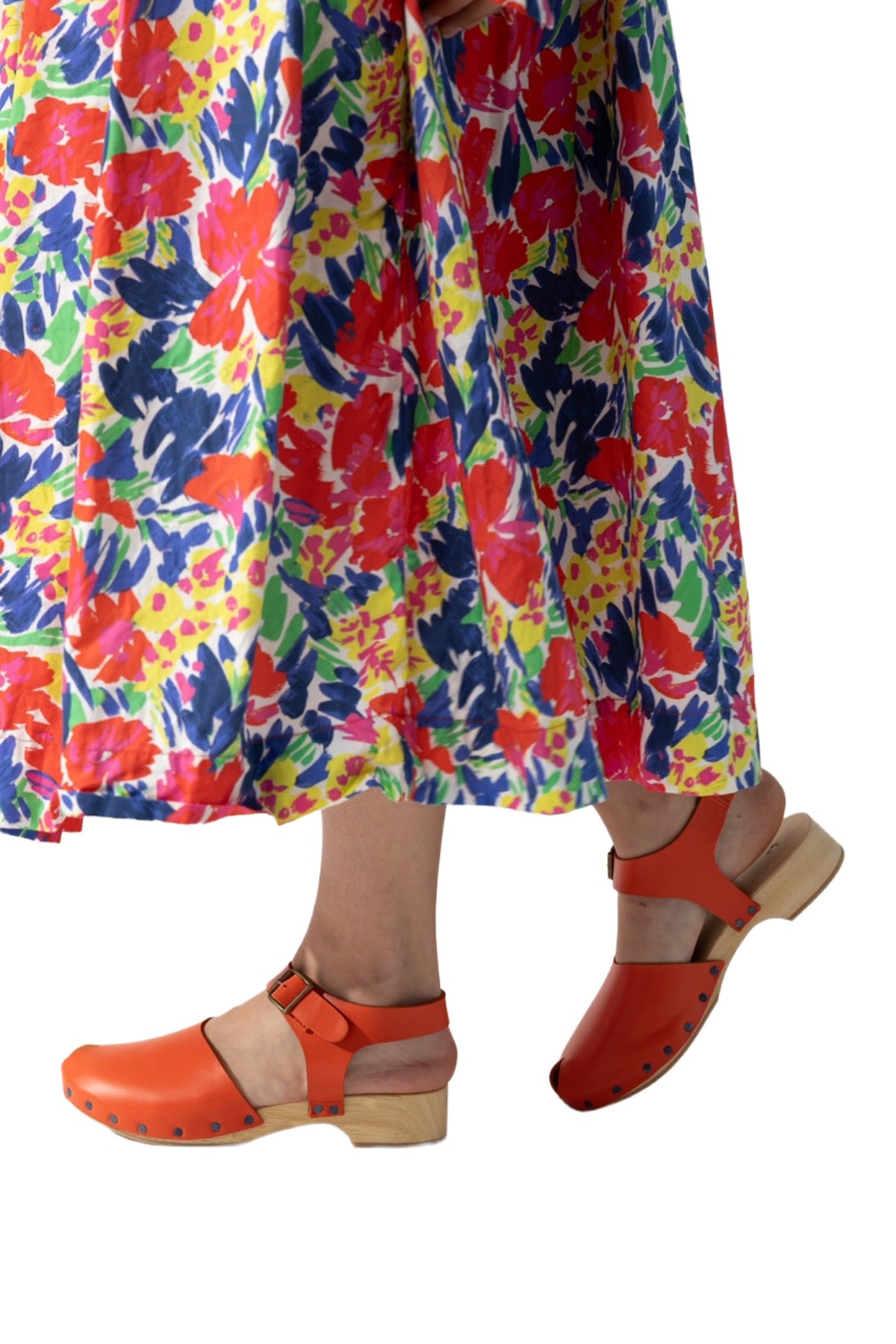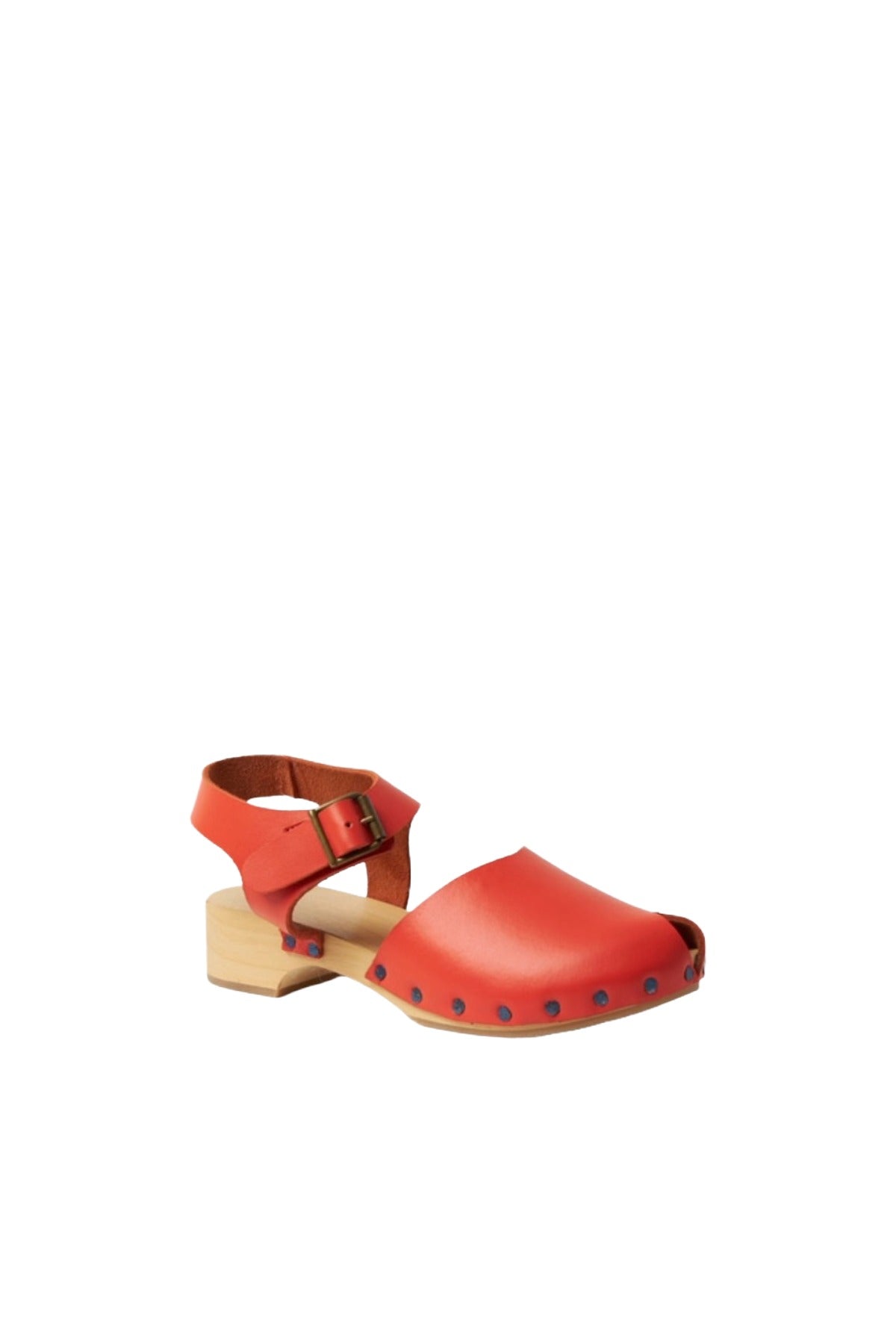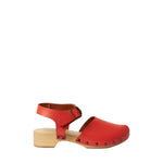 Orange heeled clog from Daniela Gregis with upper buckle, almond toe and wooden sole with heel.