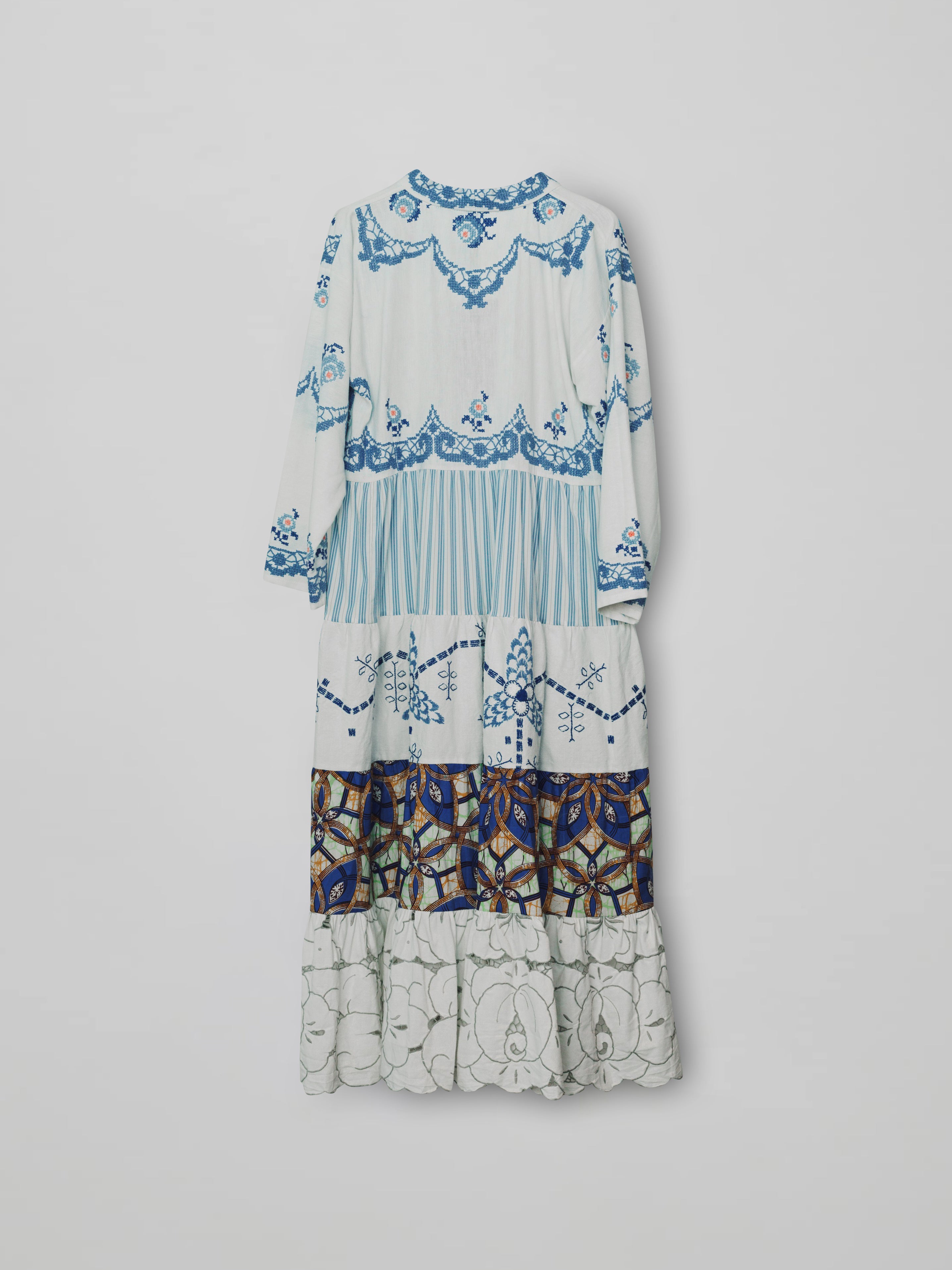 Rianna + Nina OOAK New Kimono Emb Jacket one-of-a-kind long dress crafted from vintage textiles. Features blue floral embroidery, striped midsection, and a tiered skirt with batik and floral prints. Finished with long embroidered sleeves.