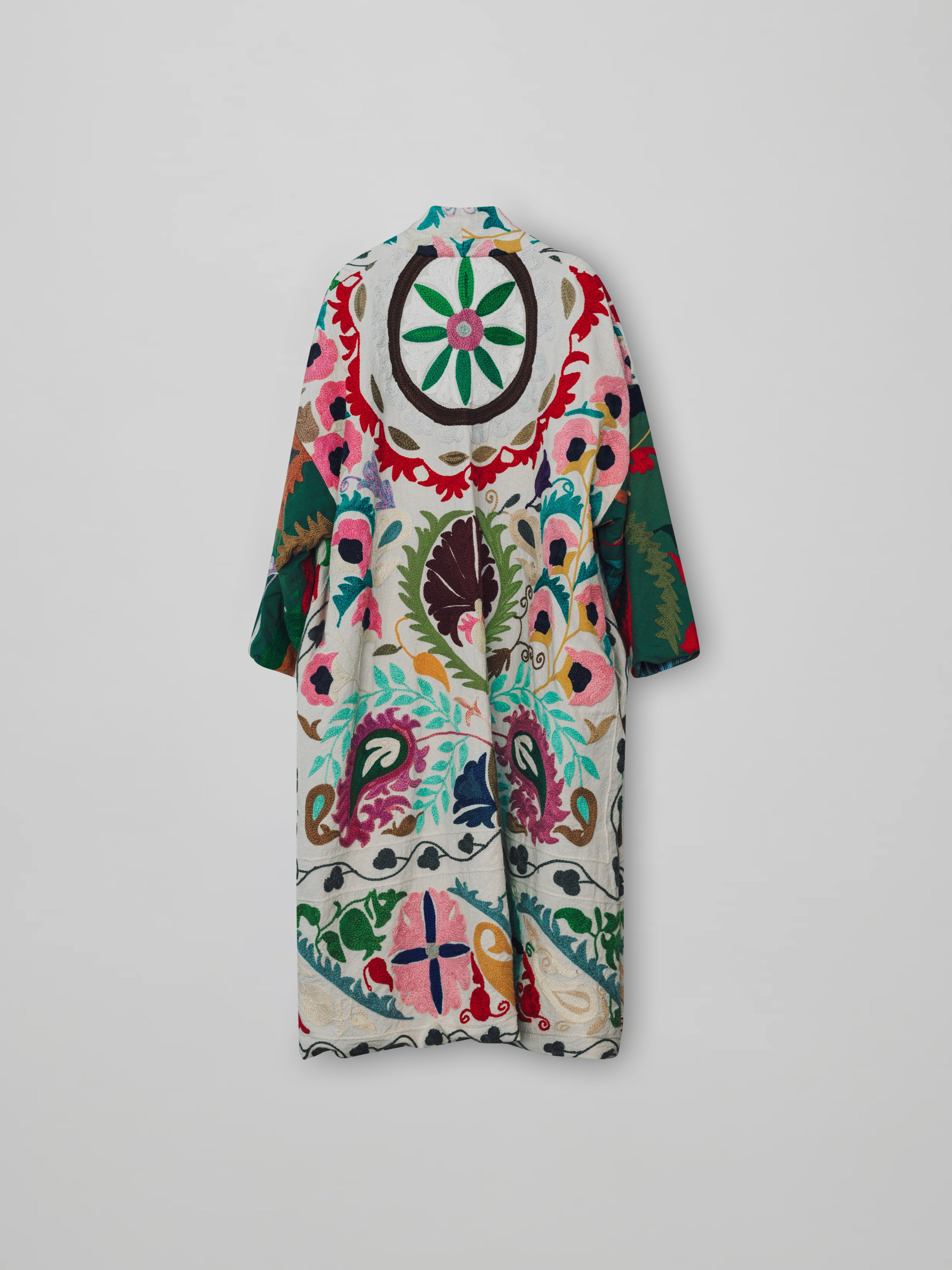 Rianna + Nina OOAK Reversible Souzani Coat is a one-of-a-kind coat crafted from hand-embroidered vintage Uzbek suzani textiles. Fully reversible, with one side showcasing vibrant florals and animal motifs on a cream background, and the other side featuring rich jewel-toned geometrics. Mid-calf length with wide sleeves and a relaxed silhouette.