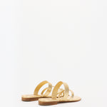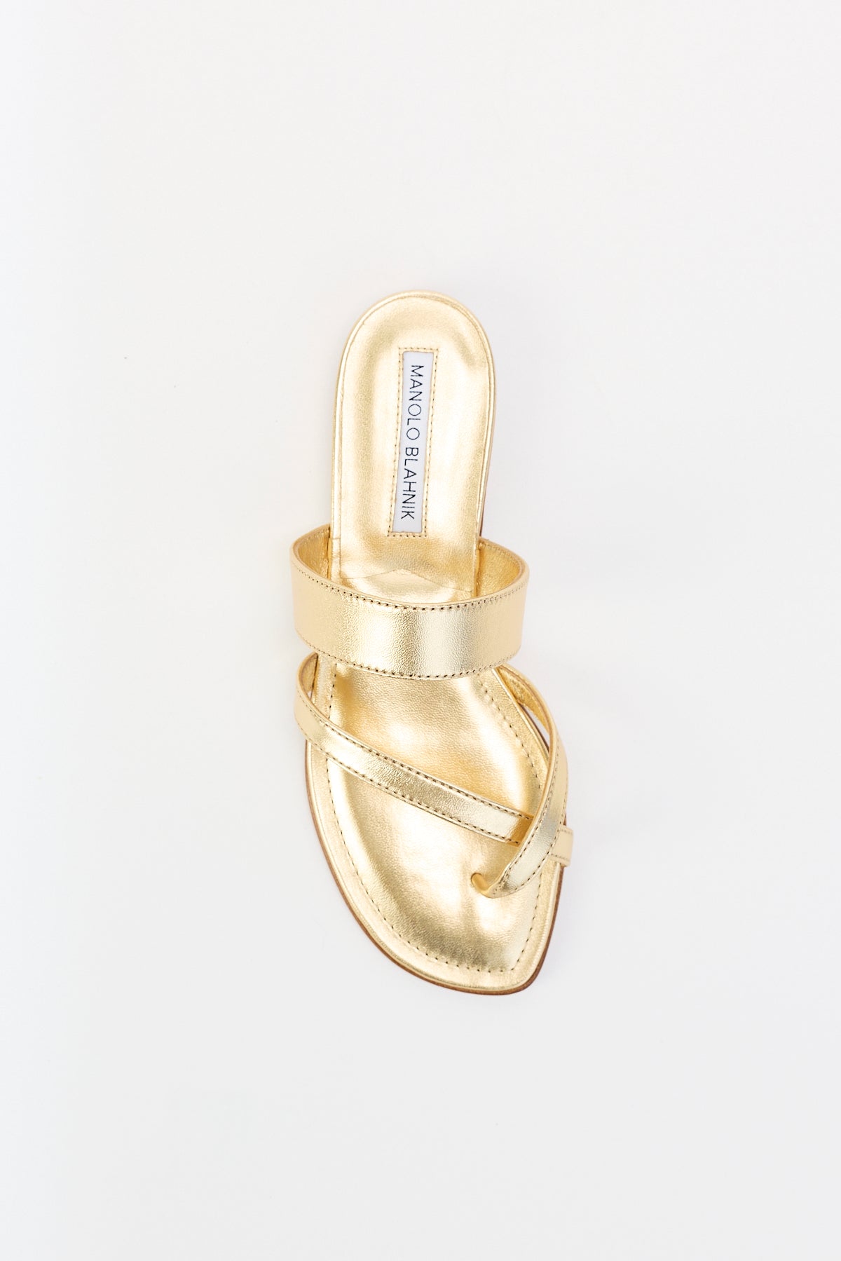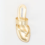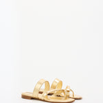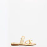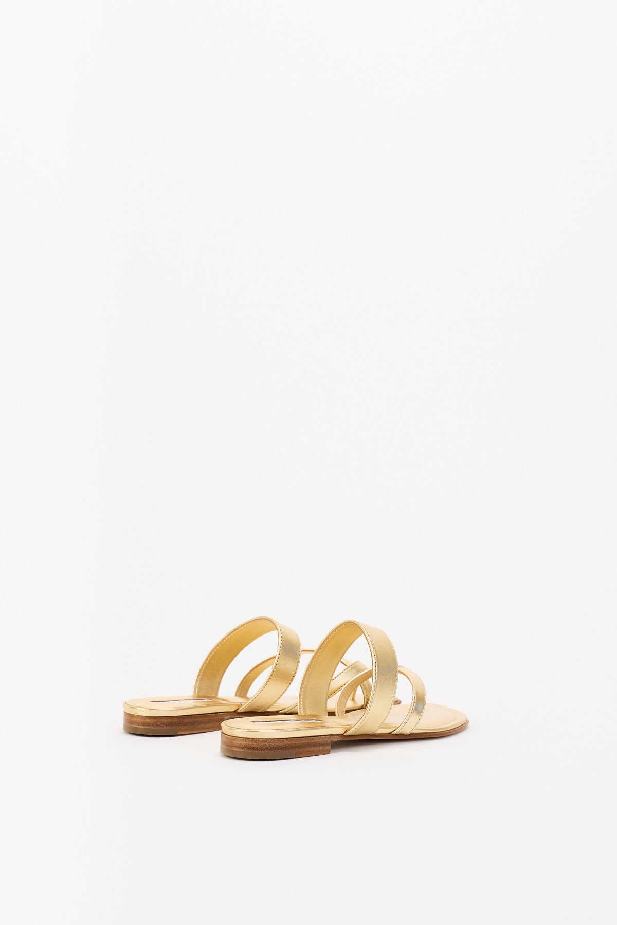 Gold nappa leather open toe flat sandals featuring crossover front straps with toe stem, instep strap and flat stacked heel.