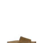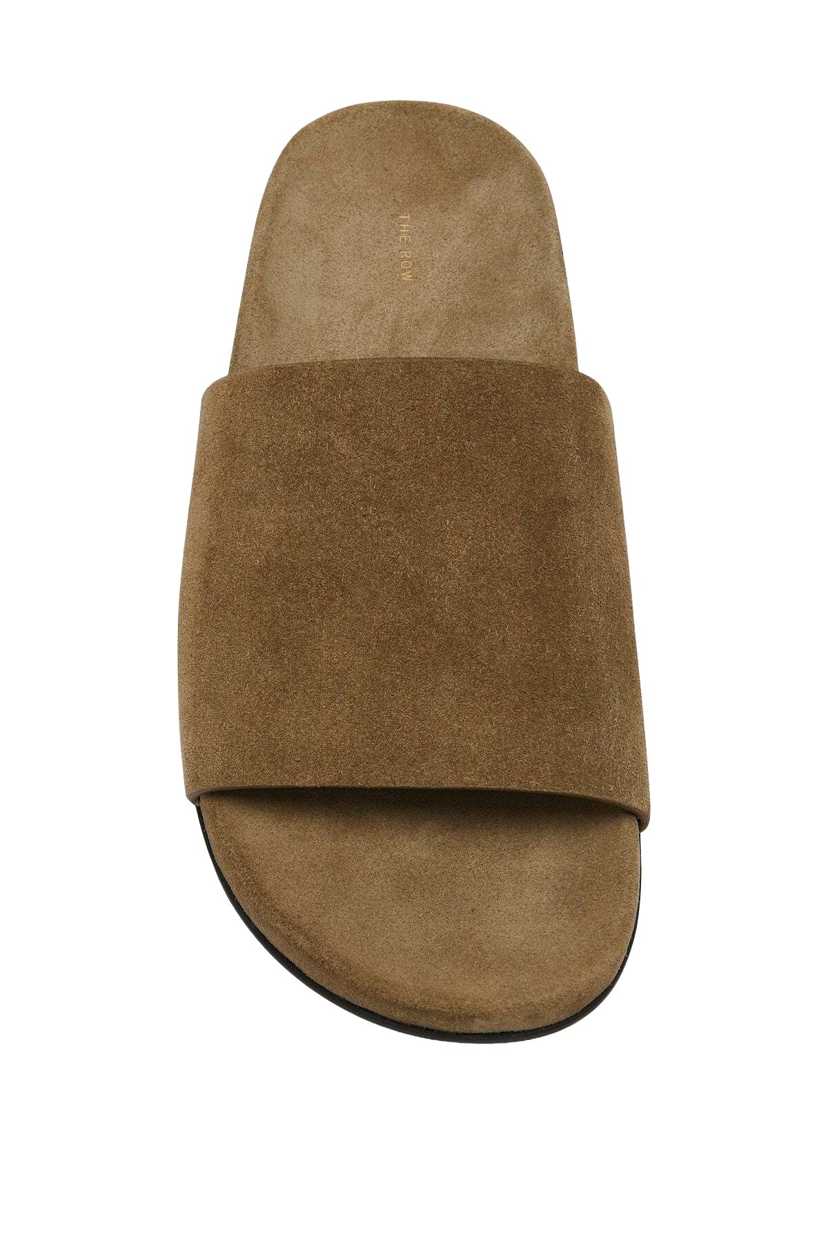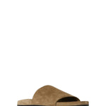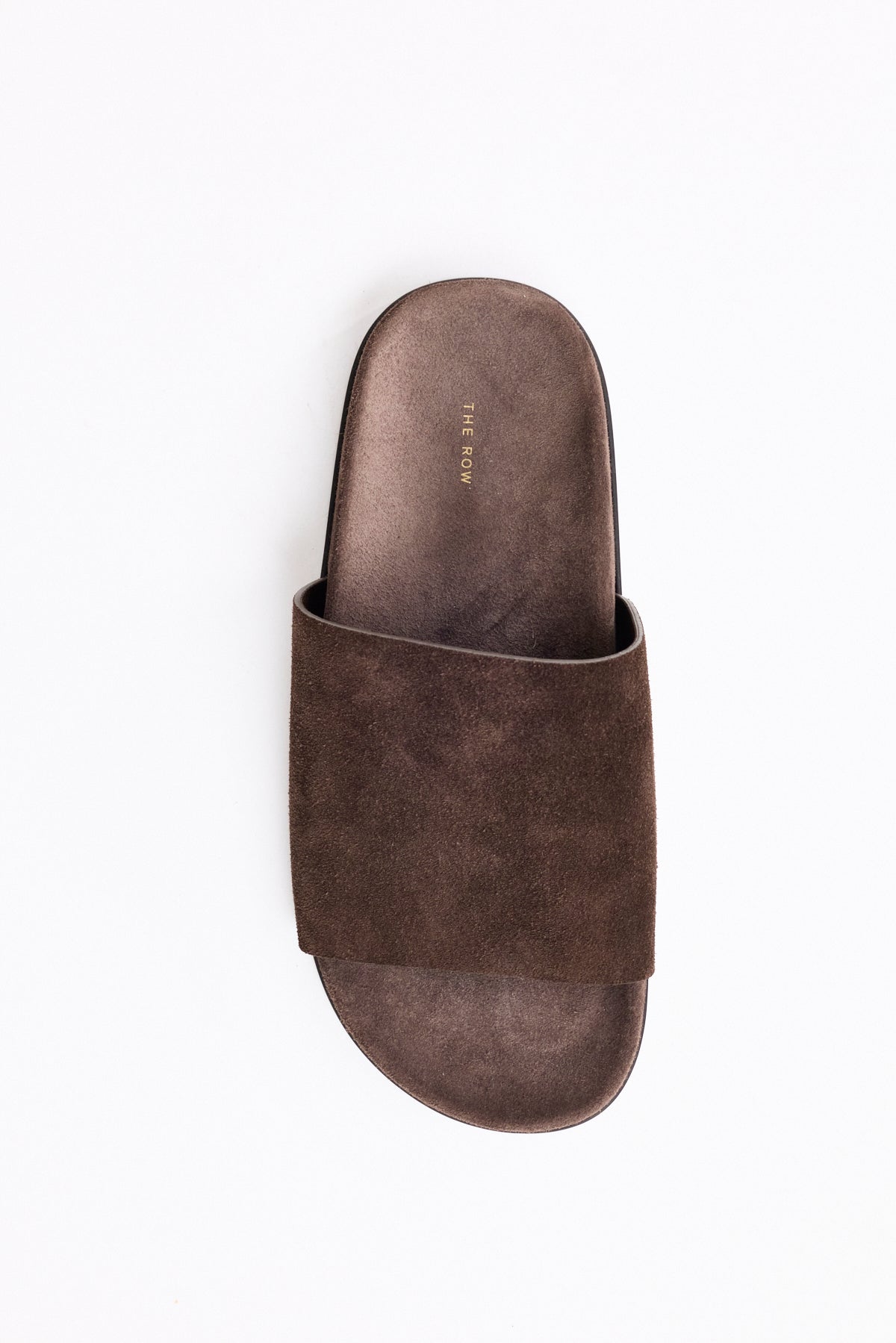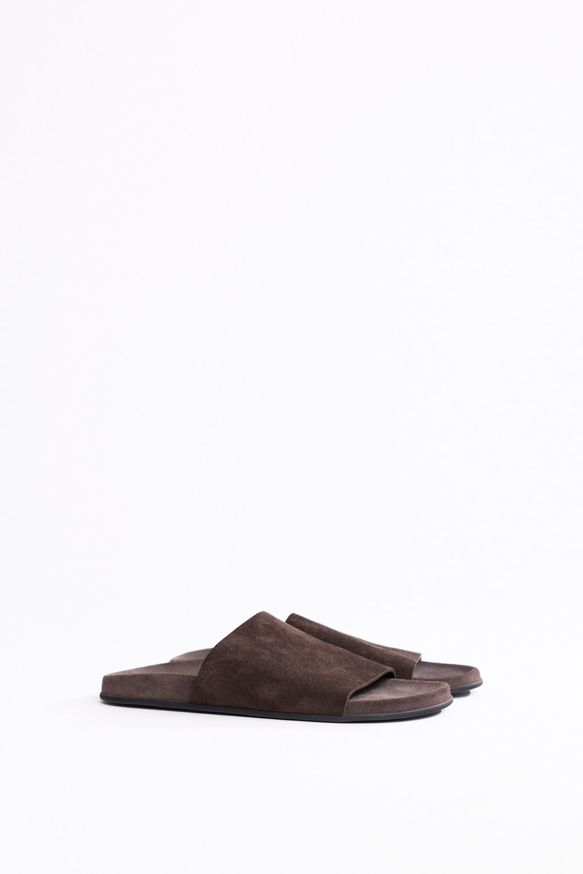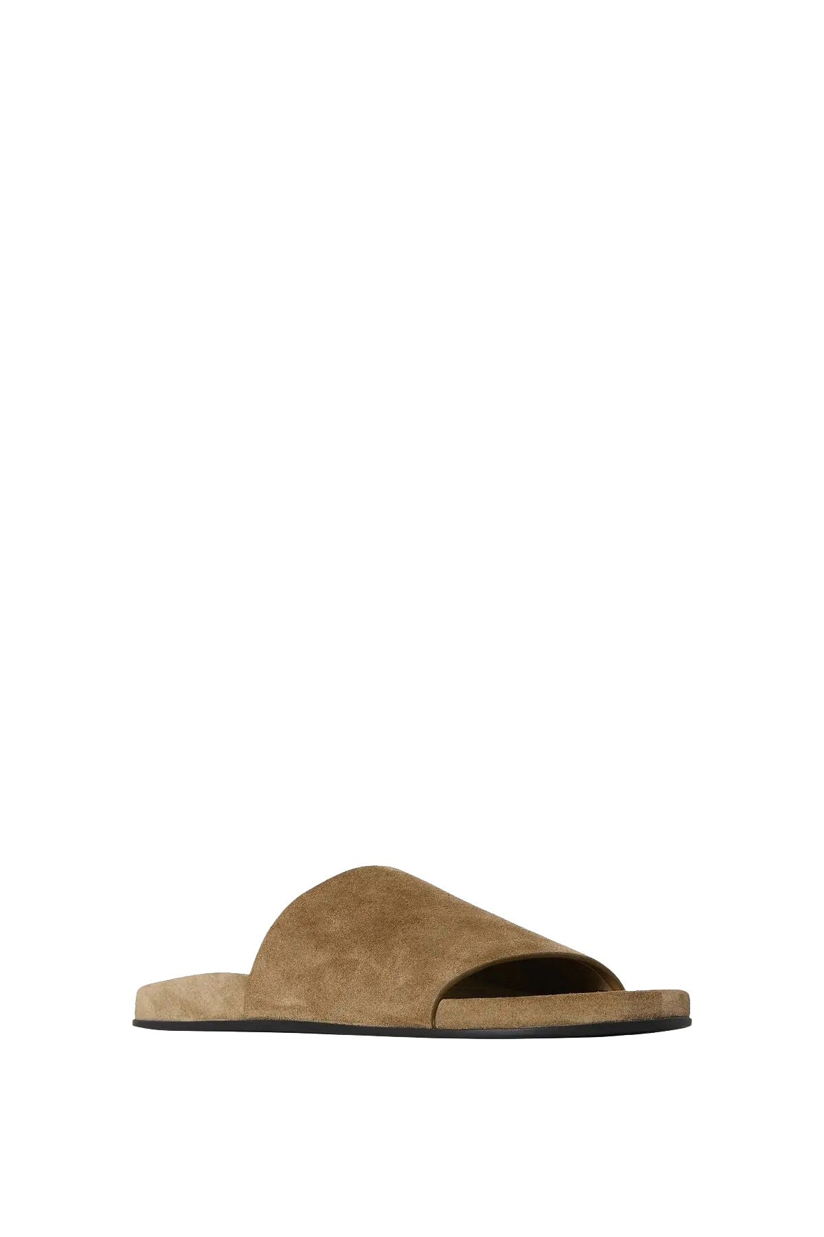 Flat slip-on sandal in soft calfskin suede with contoured footbed and rubber sole.