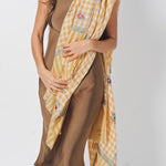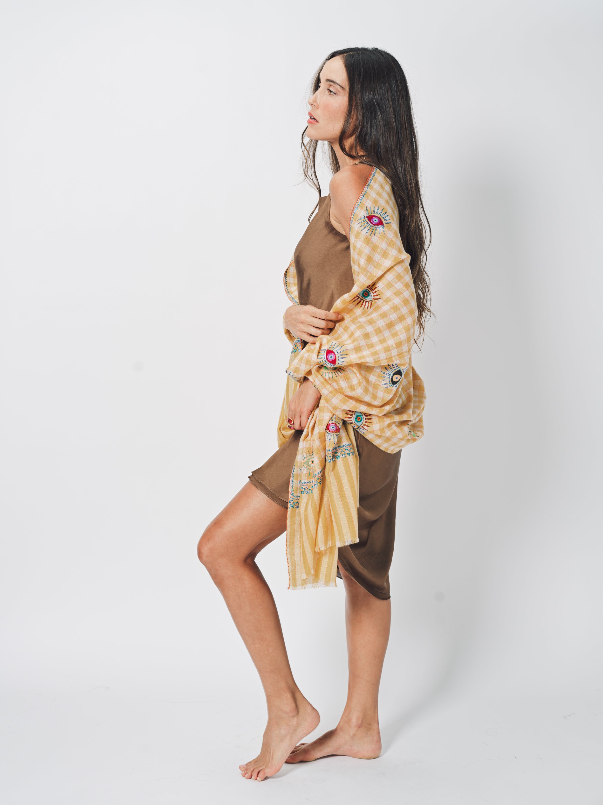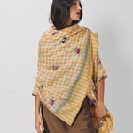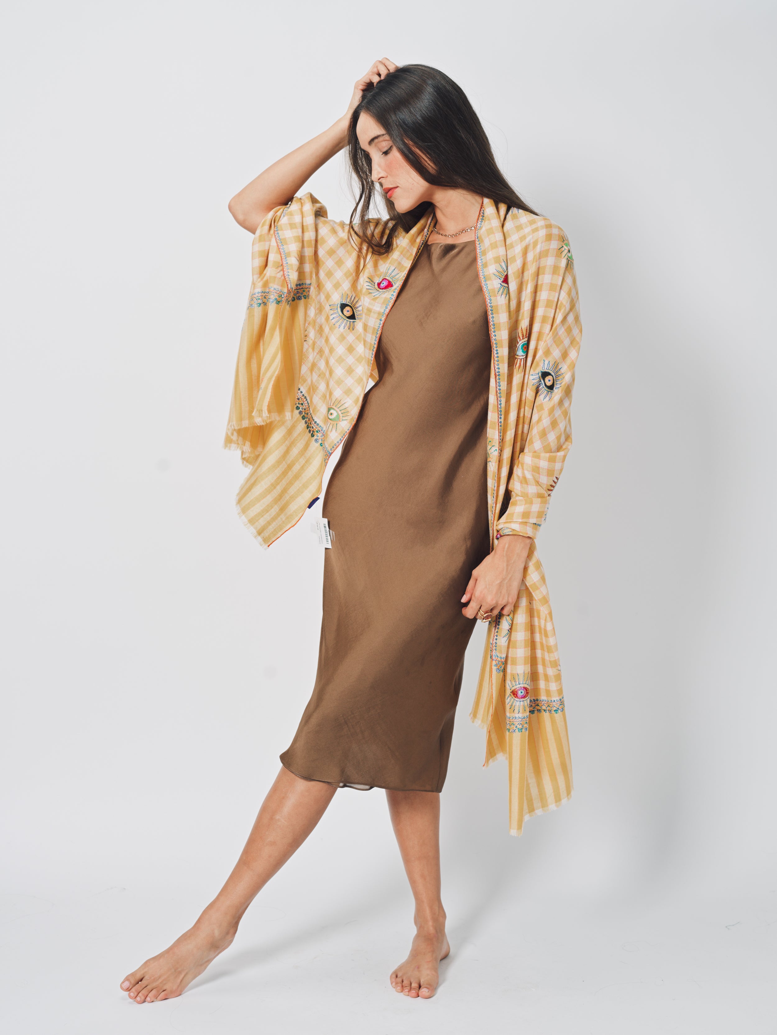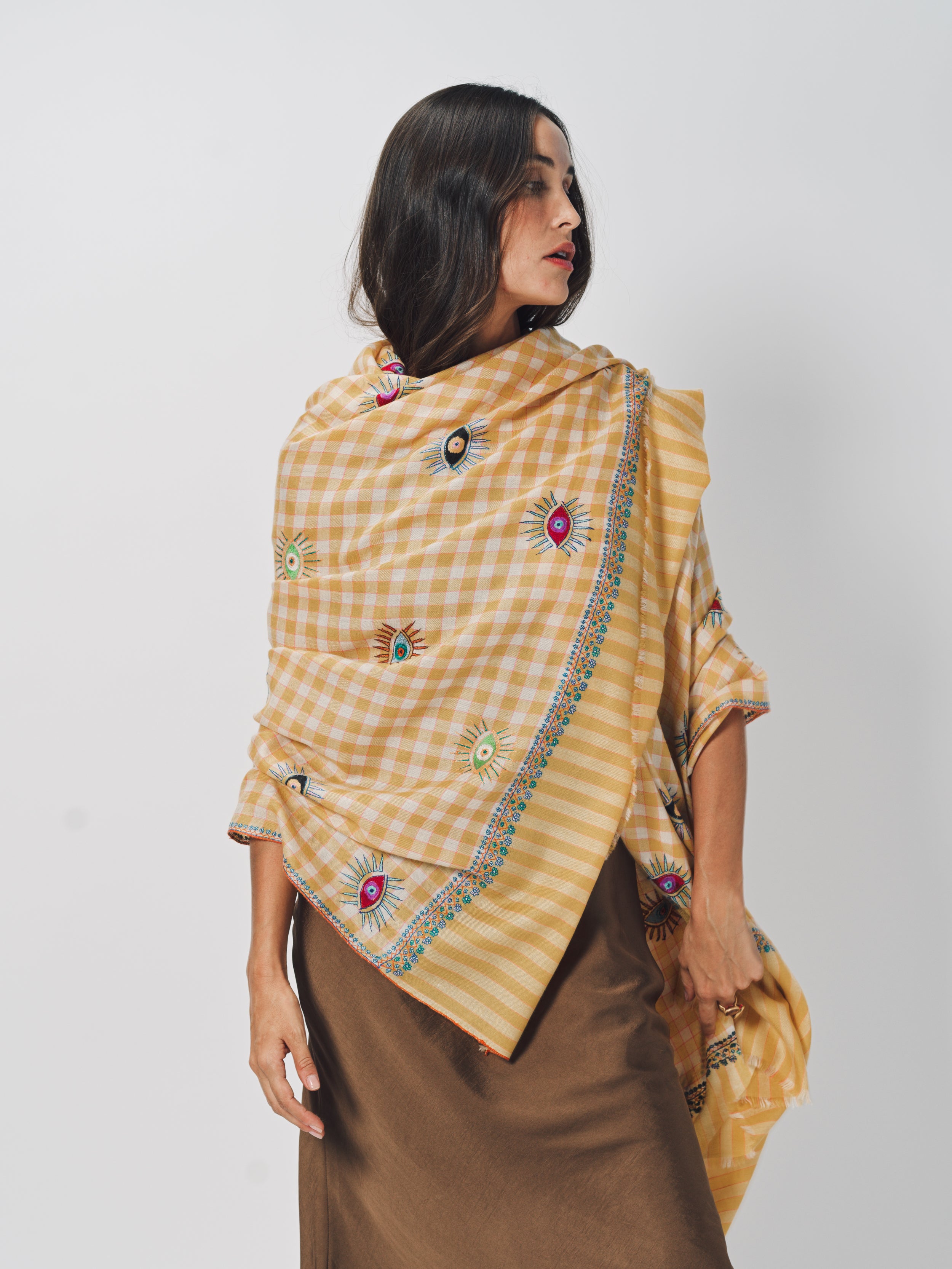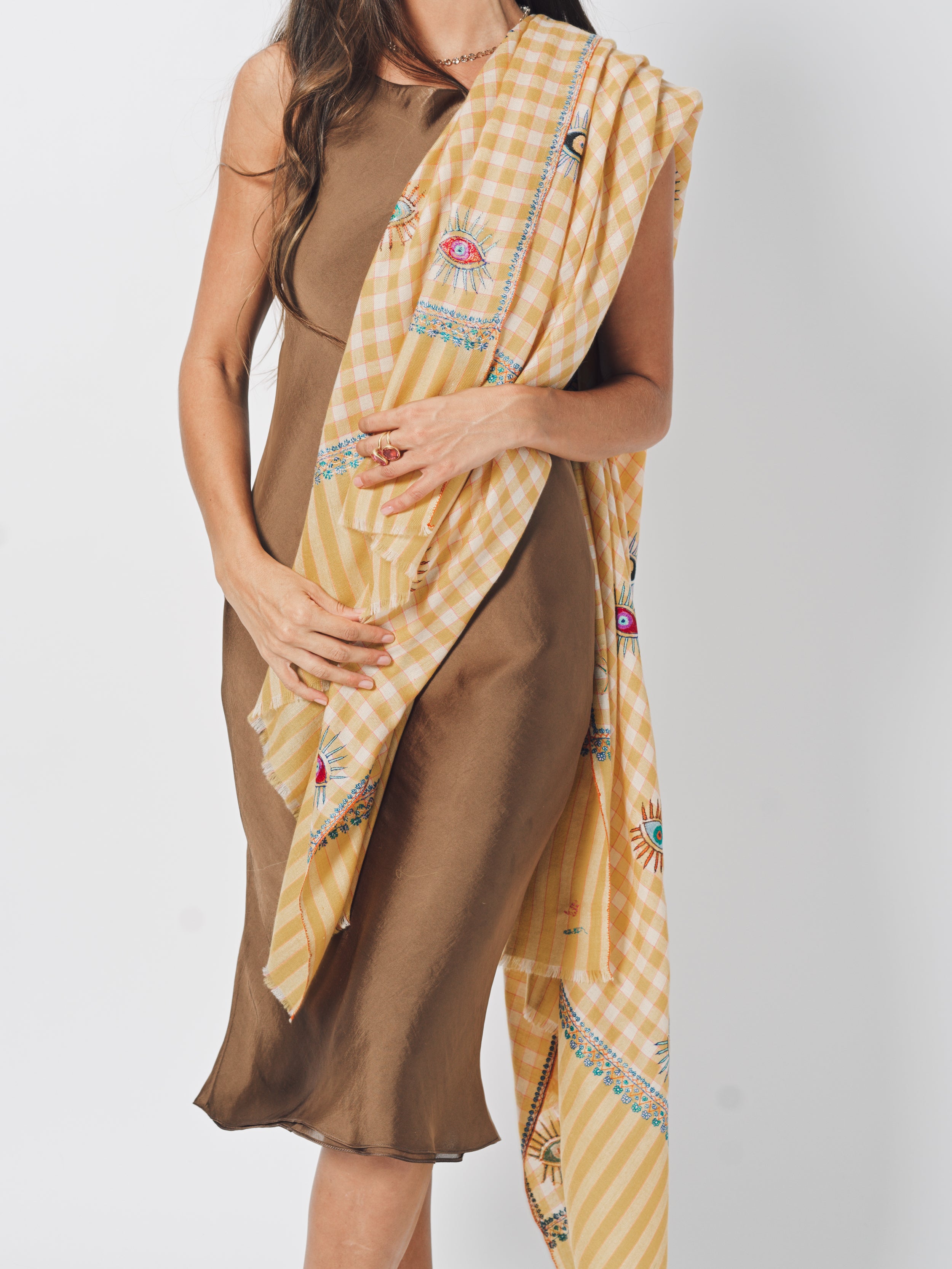 Yaser Shaw Embroidered Shawl in Cashmere - Ivory/Yellow Checkered Eyes