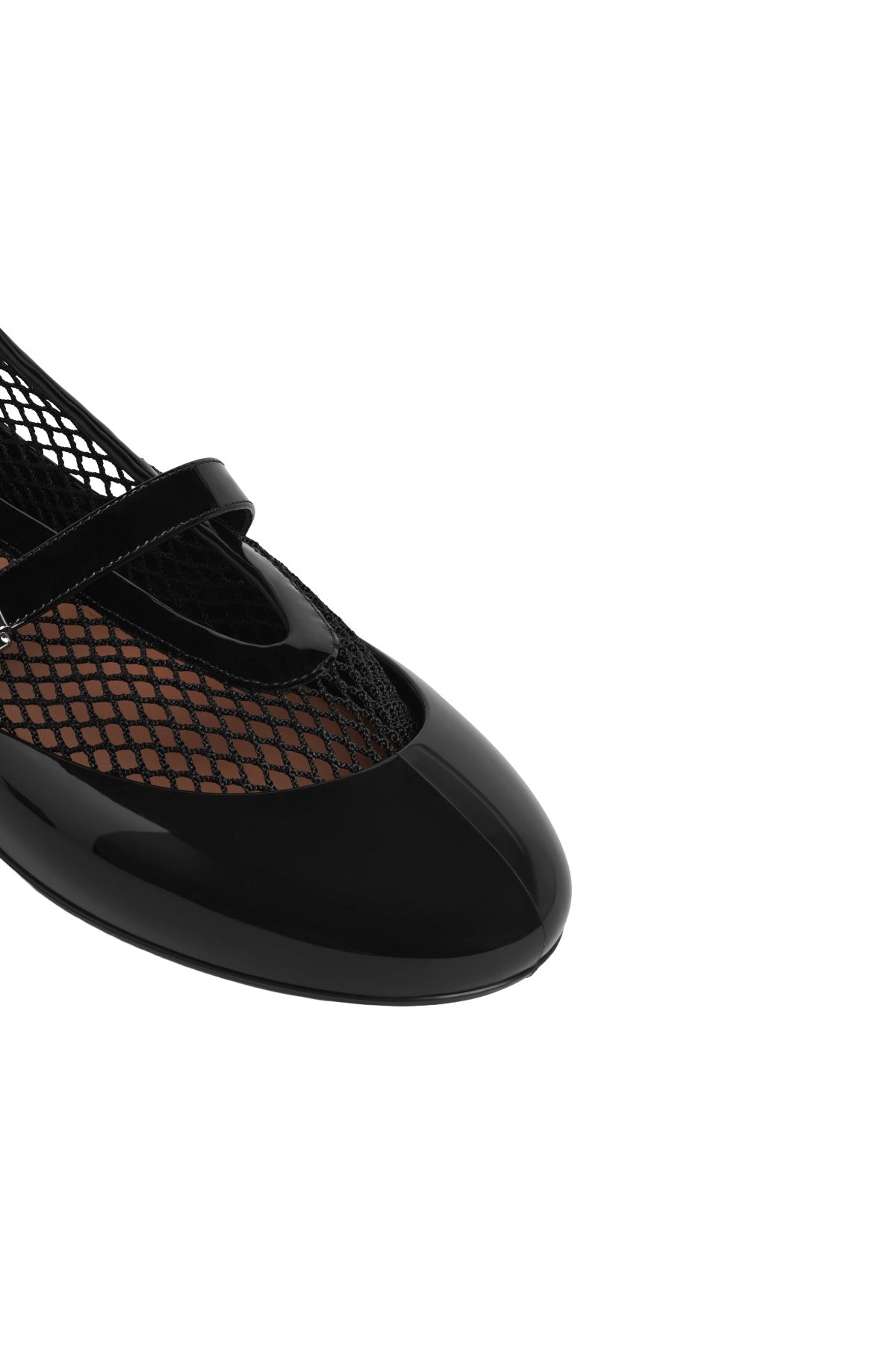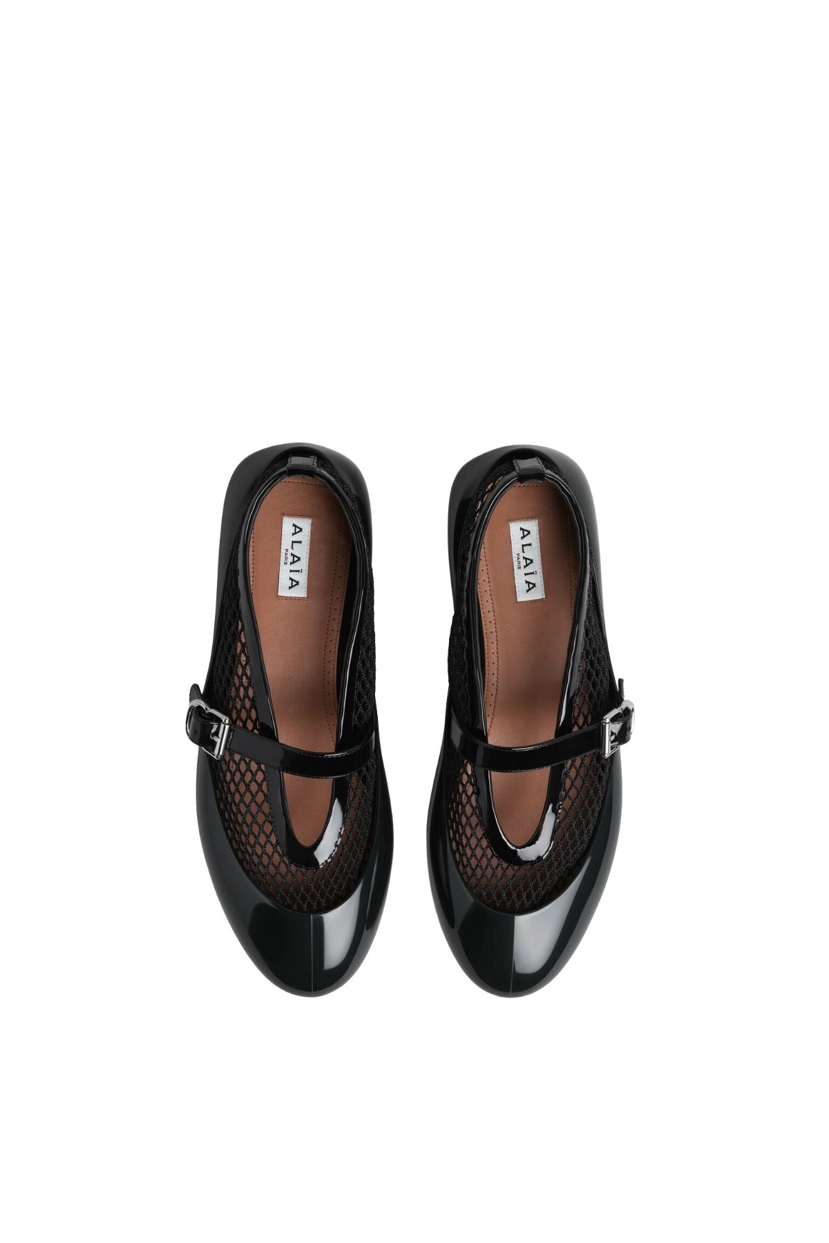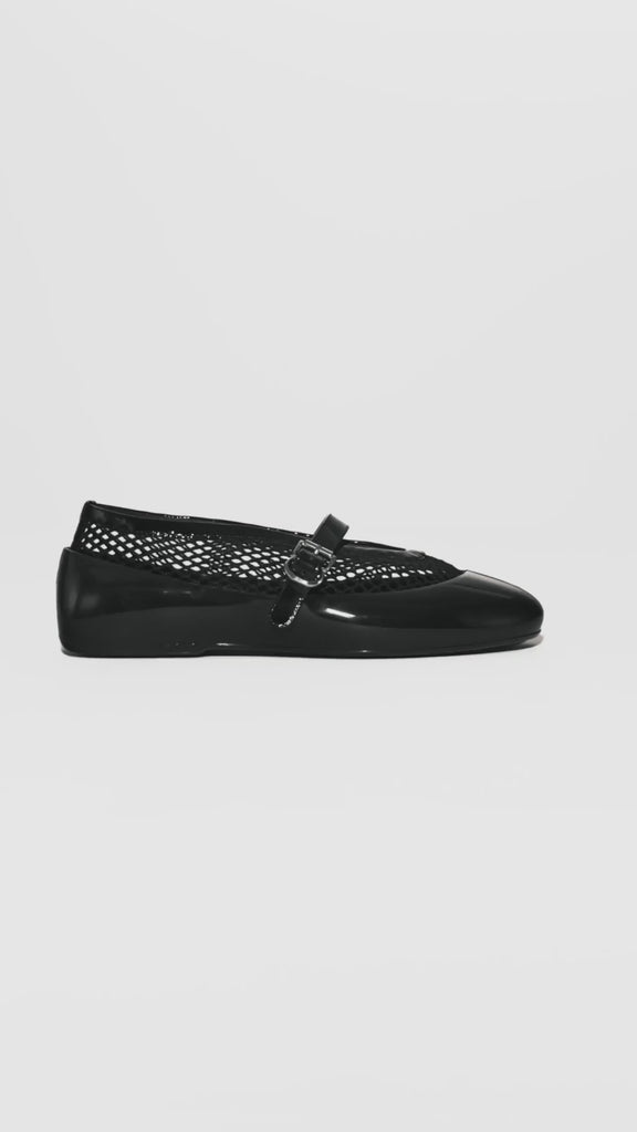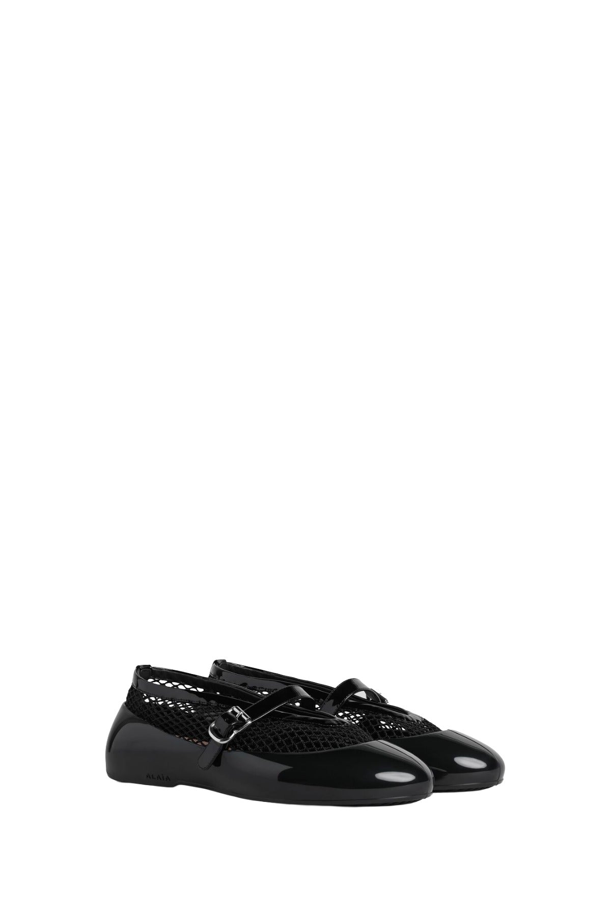 Alaia Ballet Flats in Fishnet with Rubber Overshoes are part of the Winter Spring 26 Collection. Signature Alaïa ballet flats reimagined with innovative removable rubber overshoes, offering versatile styling for any occasion. The iconic silhouette features a delicate fishnet textile paired with lustrous patent calfskin, accented by a refined buckle strap across the vamp. Shiny rubber overshoes provide protection and a bold aesthetic shift, allowing you to transition seamlessly from refined elegance to contemporary edge. Meticulously crafted in Italy, these flats combine Alaïa's heritage of precision tailoring with functional design. The interchangeable overshoes extend the life of your investment while delivering two distinct looks in one exceptional pair.
