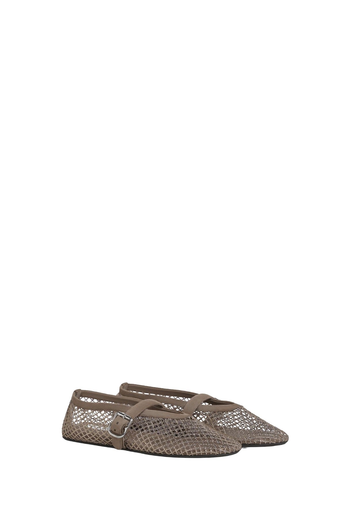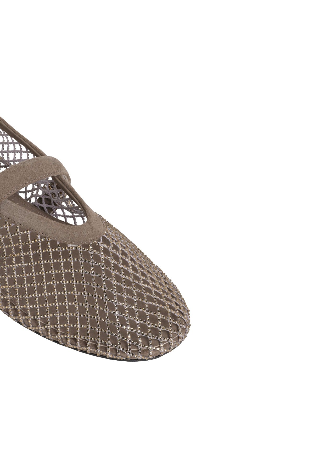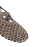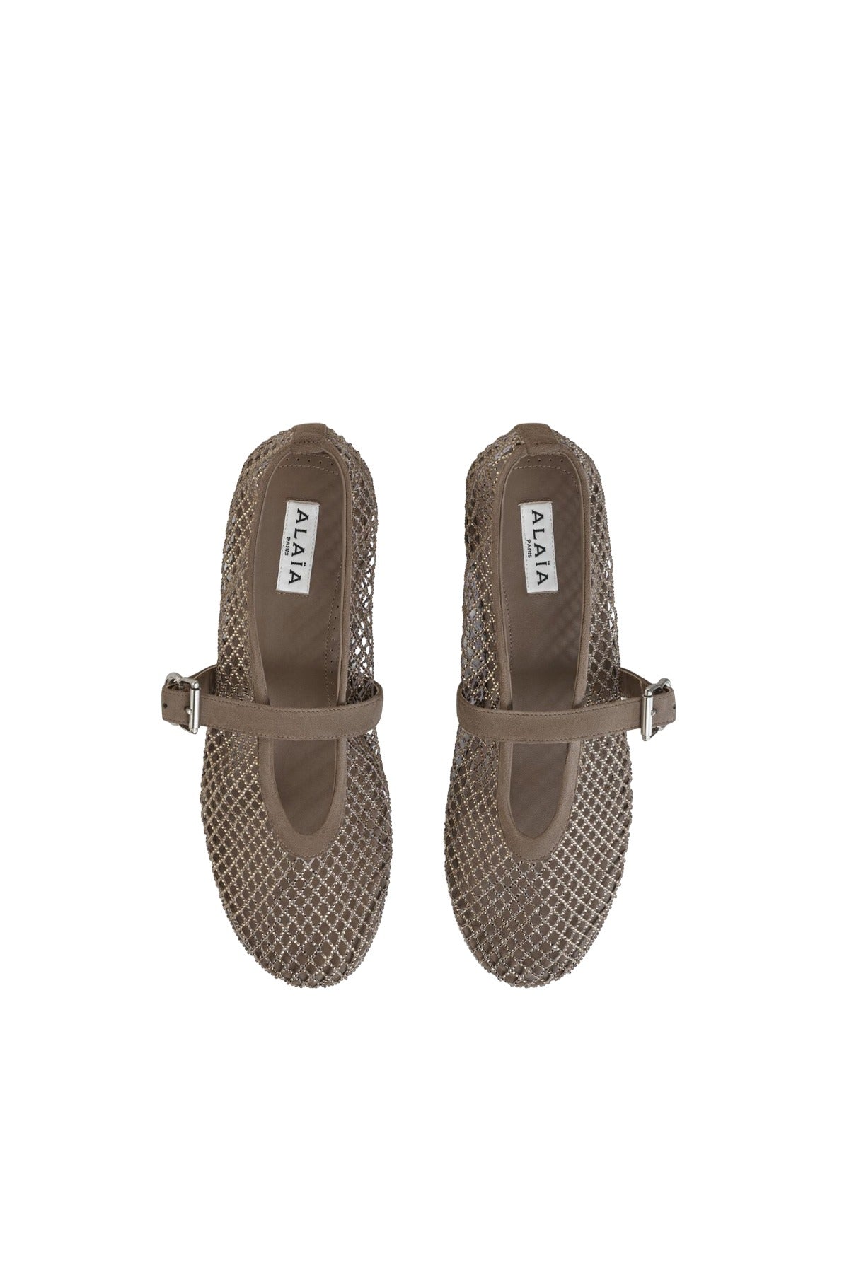 Alaia Ballet Flats in Strass Fishnet are part of the Winter Spring 26 Collection. Signature Alaïa ballet flats draw inspiration from classical Japanese footwear, reimagined with contemporary luxury craftsmanship. These flats feature a distinctive buckle strap across the top for secure fit and refined aesthetic appeal. The upper combines delicate fishnet textile embellished with strass crystals and supple suede goatskin, creating visual depth and tactile sophistication. A durable rubber sole provides everyday wearability without compromising the shoe's elegant silhouette. Handcrafted in Italy, these ballet flats represent the intersection of heritage design and modern luxury—ideal for those seeking understated elegance with distinctive character.