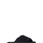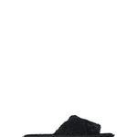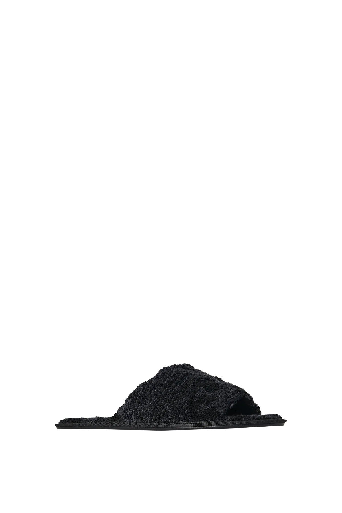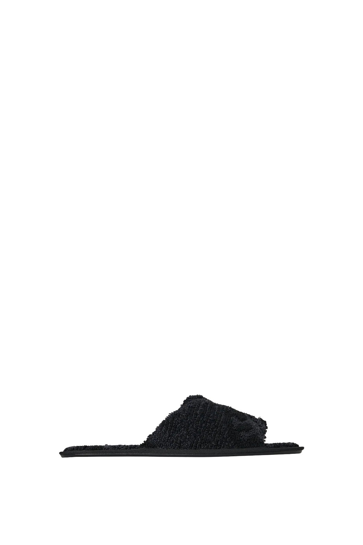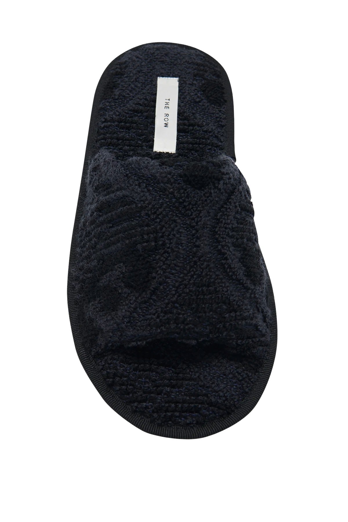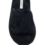 INFO House slipper in superfine silk arabesque with open-toe, slip-on construction, and leather sole for indoor-outdoor wear. |