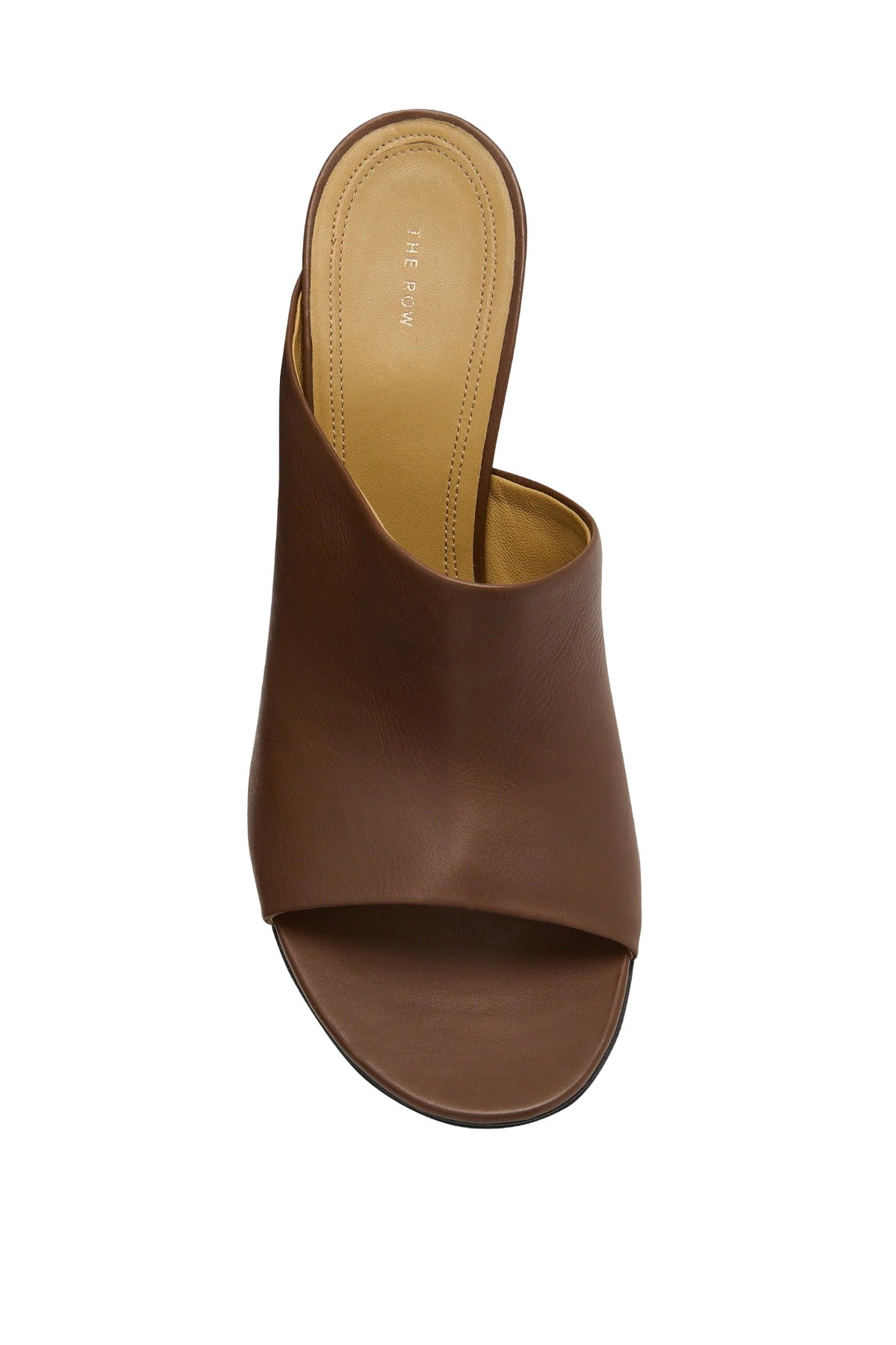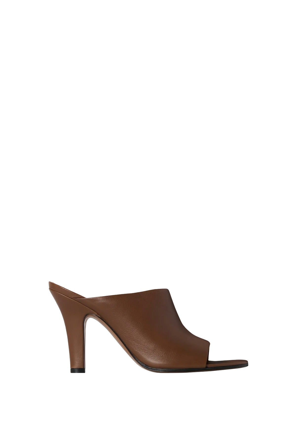 INFO Heeled mule sandal in soft calfskin leather with curved, asymmetrical vamp and nappa leather lining. |