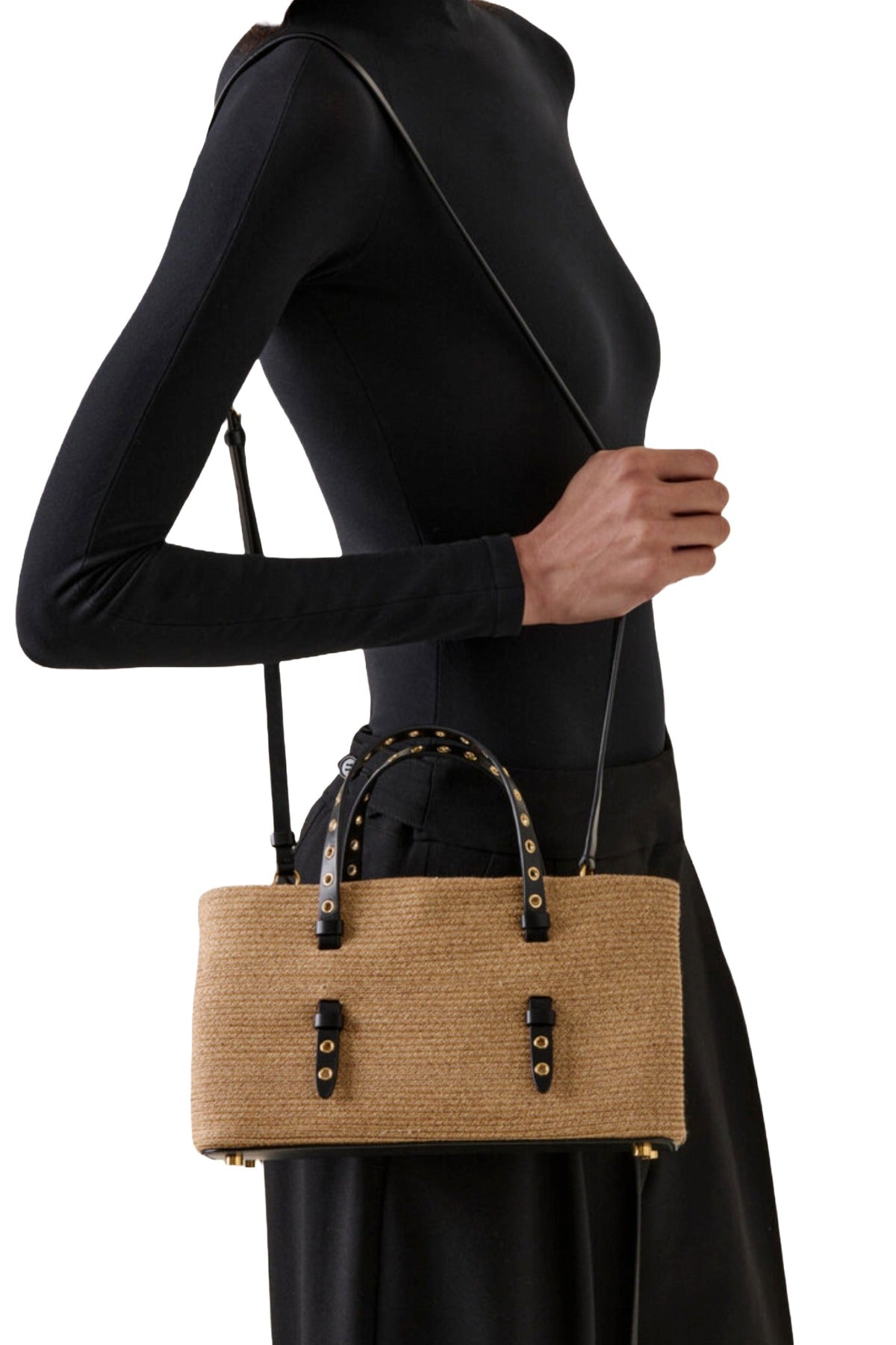 Azzedine Alaia is this east/west iteration of 'La Mina' has a straw effect woven from paper with grommet-detailed leather straps. Add the adjustable shoulder strap to style crossbody.