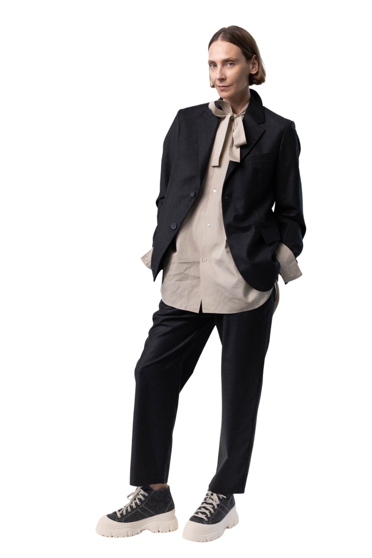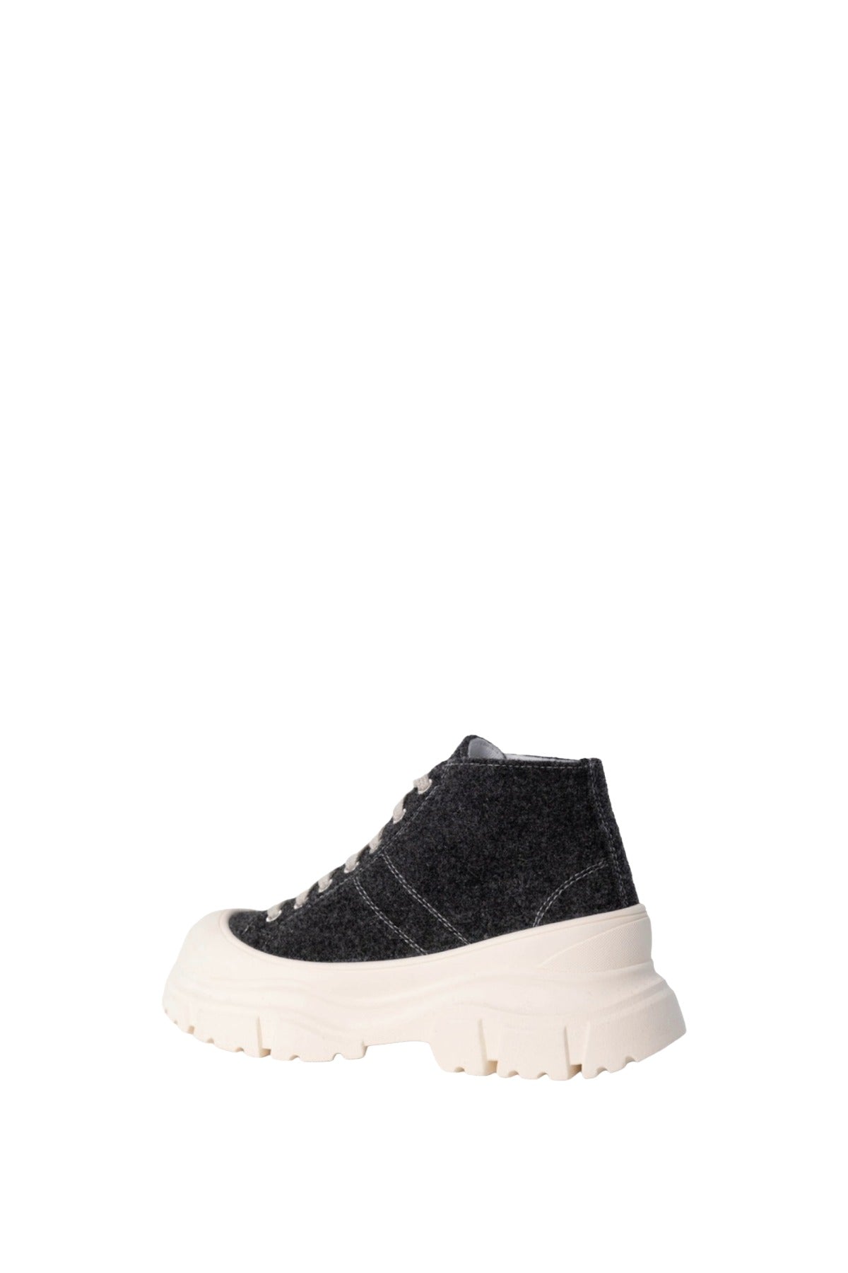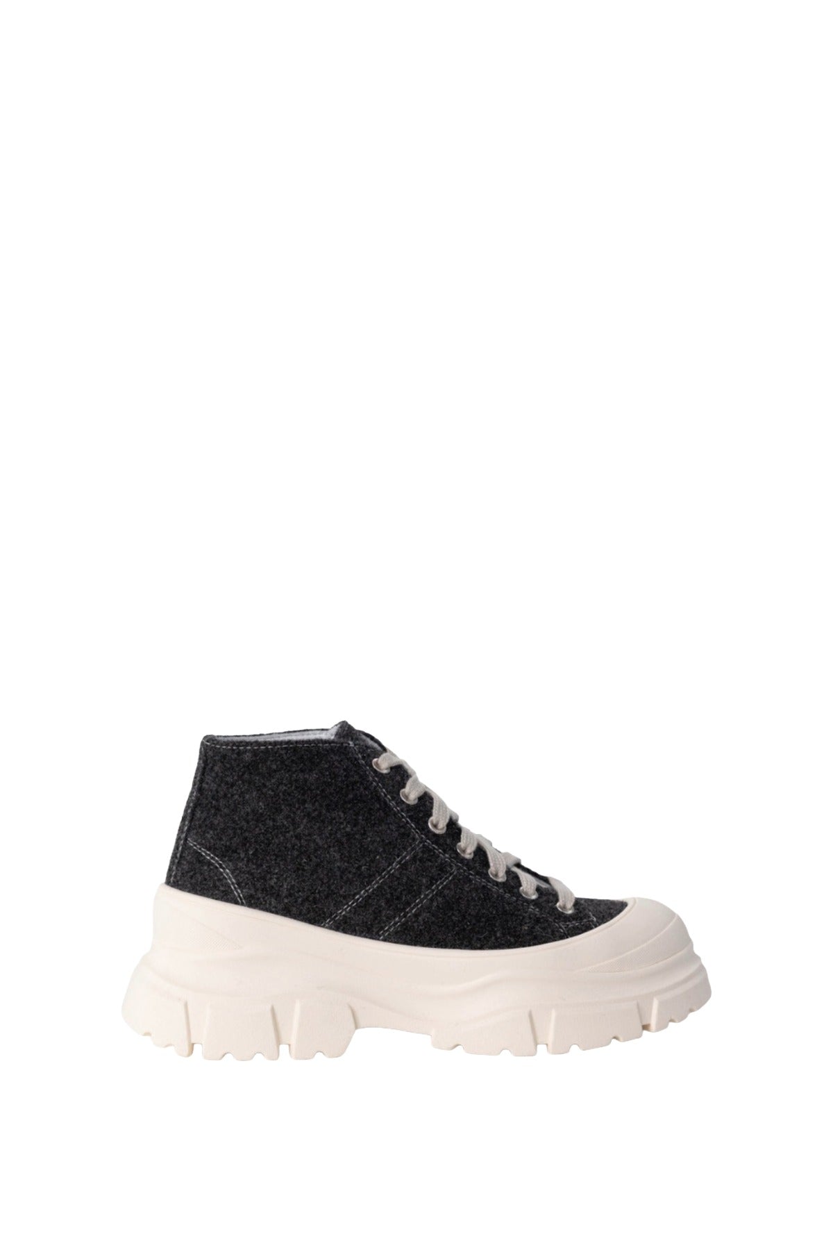 INFO Sofie D'hoore new low-top leather sneaker in cloud light grey with an off white grey rubber toecap and threaded sole. Comes with tonal cotton lacing. Detailed with stitching detail at sides and at back heel. Fully lined in leather with a cushioned in-sole. ankle high sneakers with chunky outsole |
