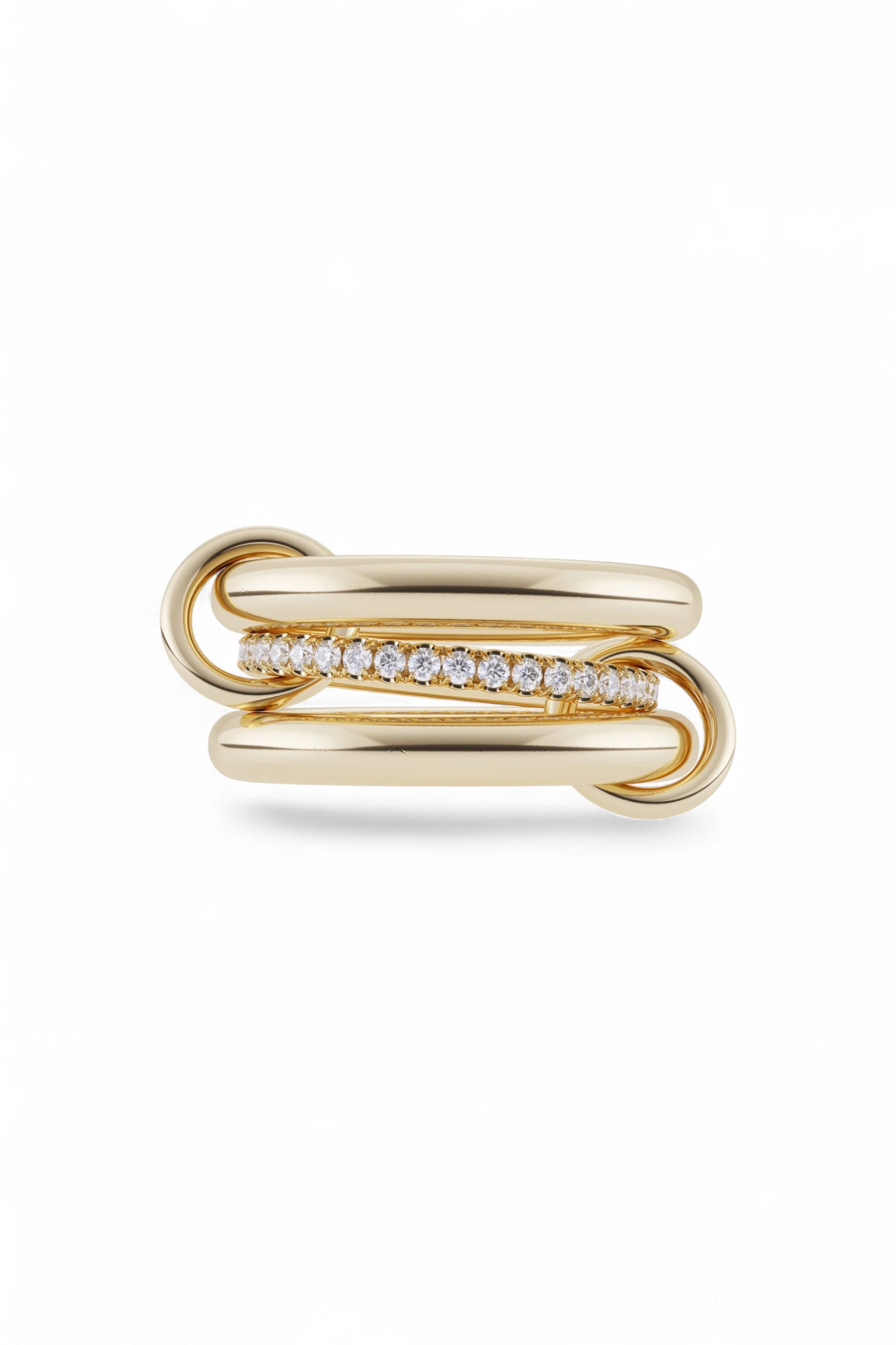 The iconic Libra ring by Spinelli Kilcollin embodies harmony and modern sculptural luxury. Handcrafted in Los Angeles, this modular design features three linked 18k yellow gold bands that may be worn stacked on a single finger or spread elegantly across three. A central band of brilliant pavé diamonds brings radiant balance to the fluid, orbital silhouette—an instantly recognizable signature of the house.