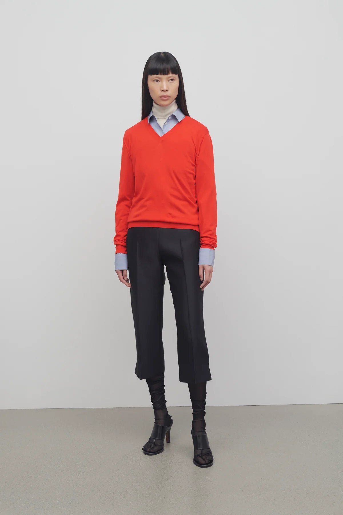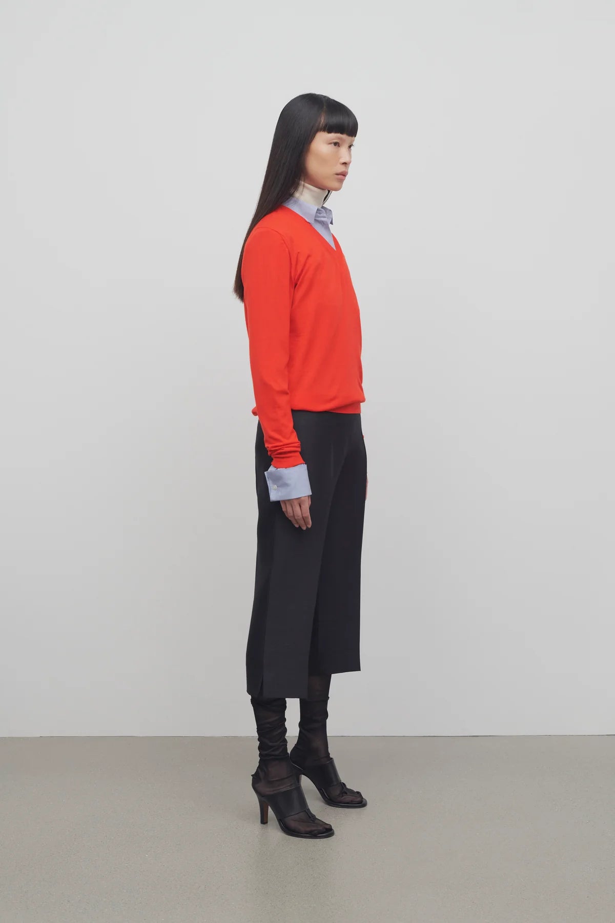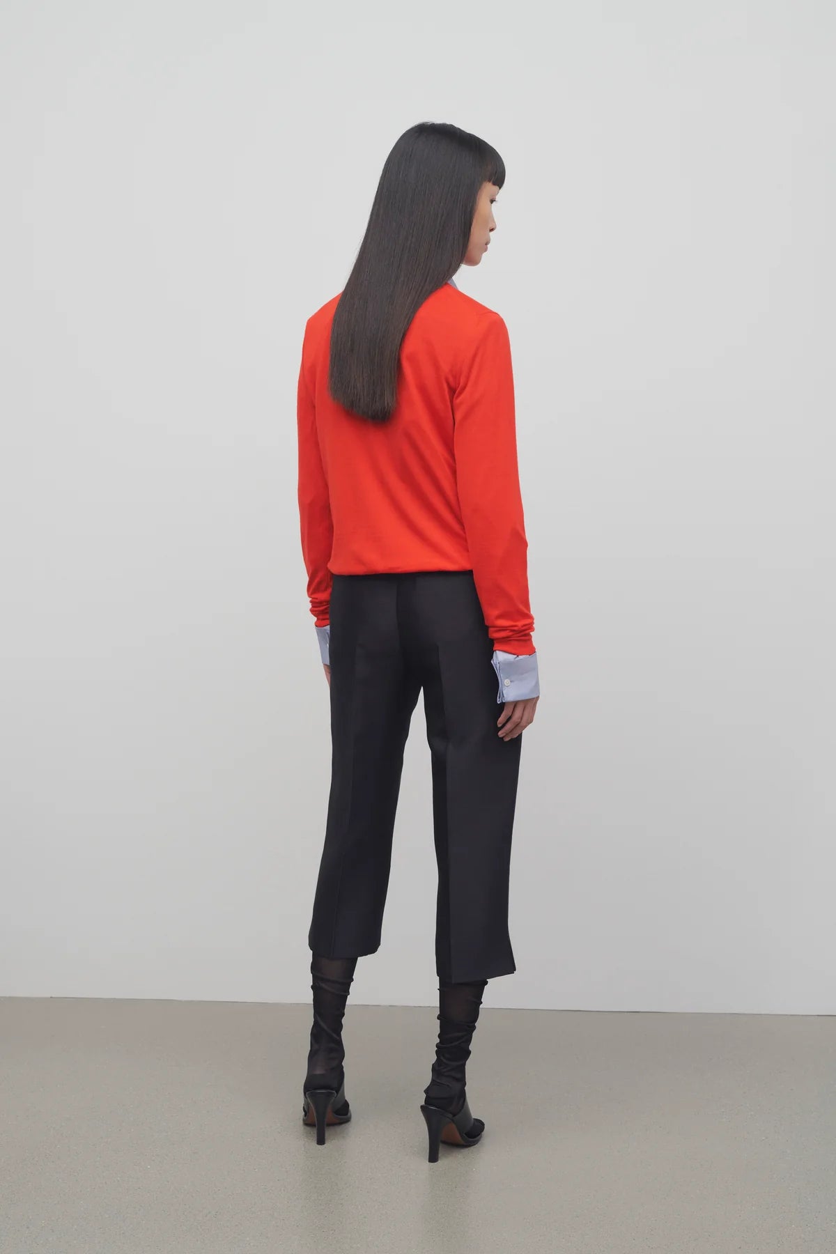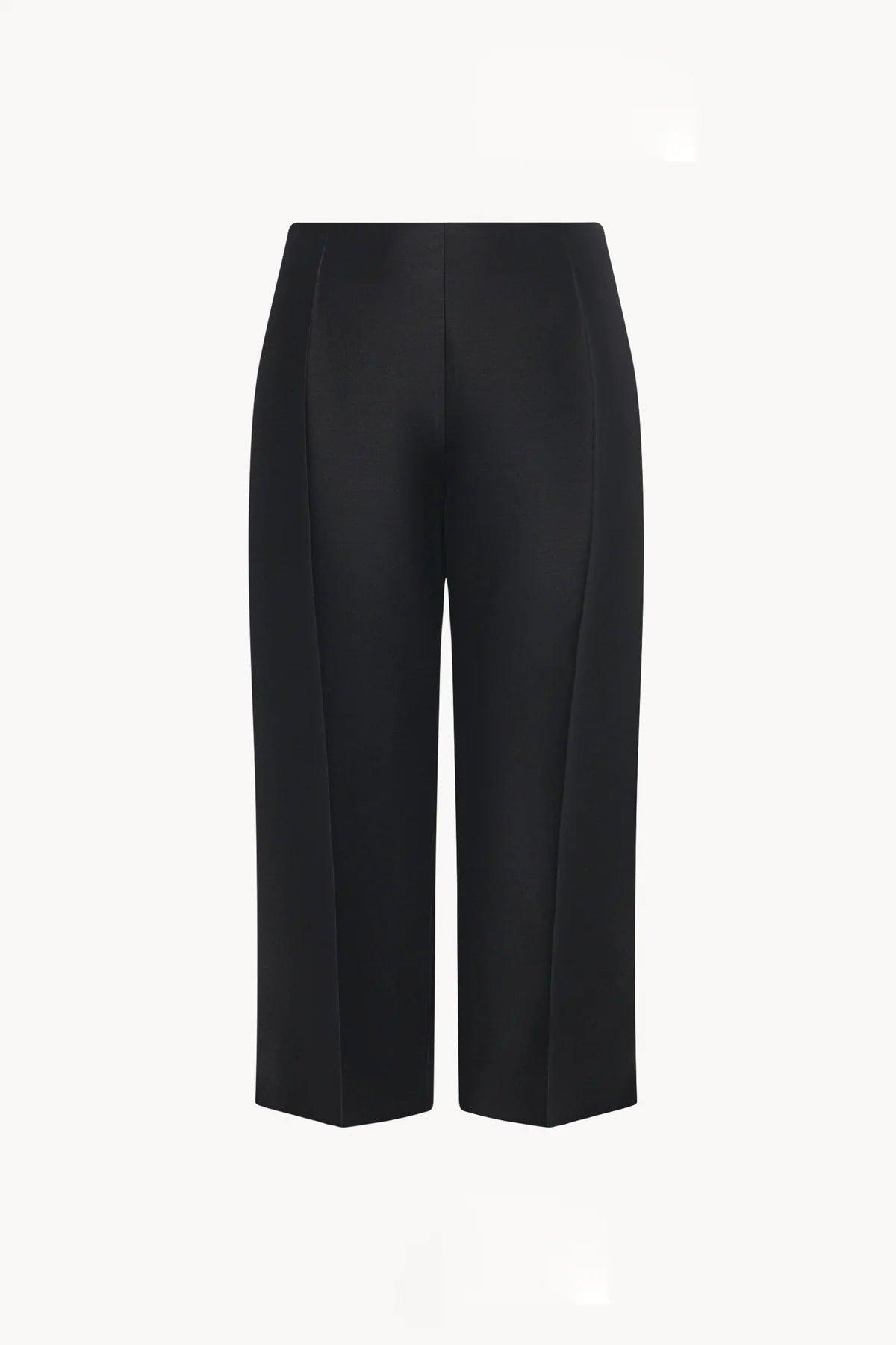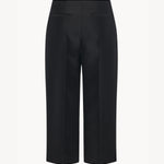 Adelie Pant in Wool and Silk Tailored capri pant in structured wool and silk with pressed front and back creases, side seam and back besom pockets, and classic hem with side slits. |