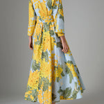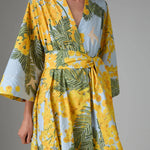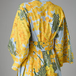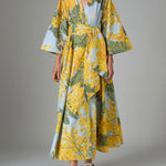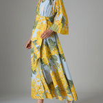 The Almudena dress is a global fusion of kaftan and kimono styles, creating a truly unique piece. Its dramatic volume combined with its effortless elegance may be worn in different situations. For Pre-spring 2025 Almudena has been crafted in a crispy cotton poplin digitally printed evoking a “Garden of Eden”, A lost paradise. The yellow /storm blue harmony is referring to French Riviera Garden full of blossomed mimosa trees.