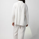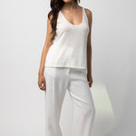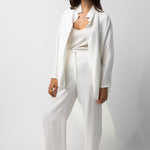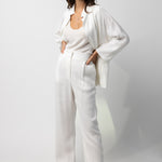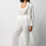 INFO High Waisted Pants from Dusan featuring zipper and button closure, double-pleated front, slant pockets, wide legs, and cropped fit. |