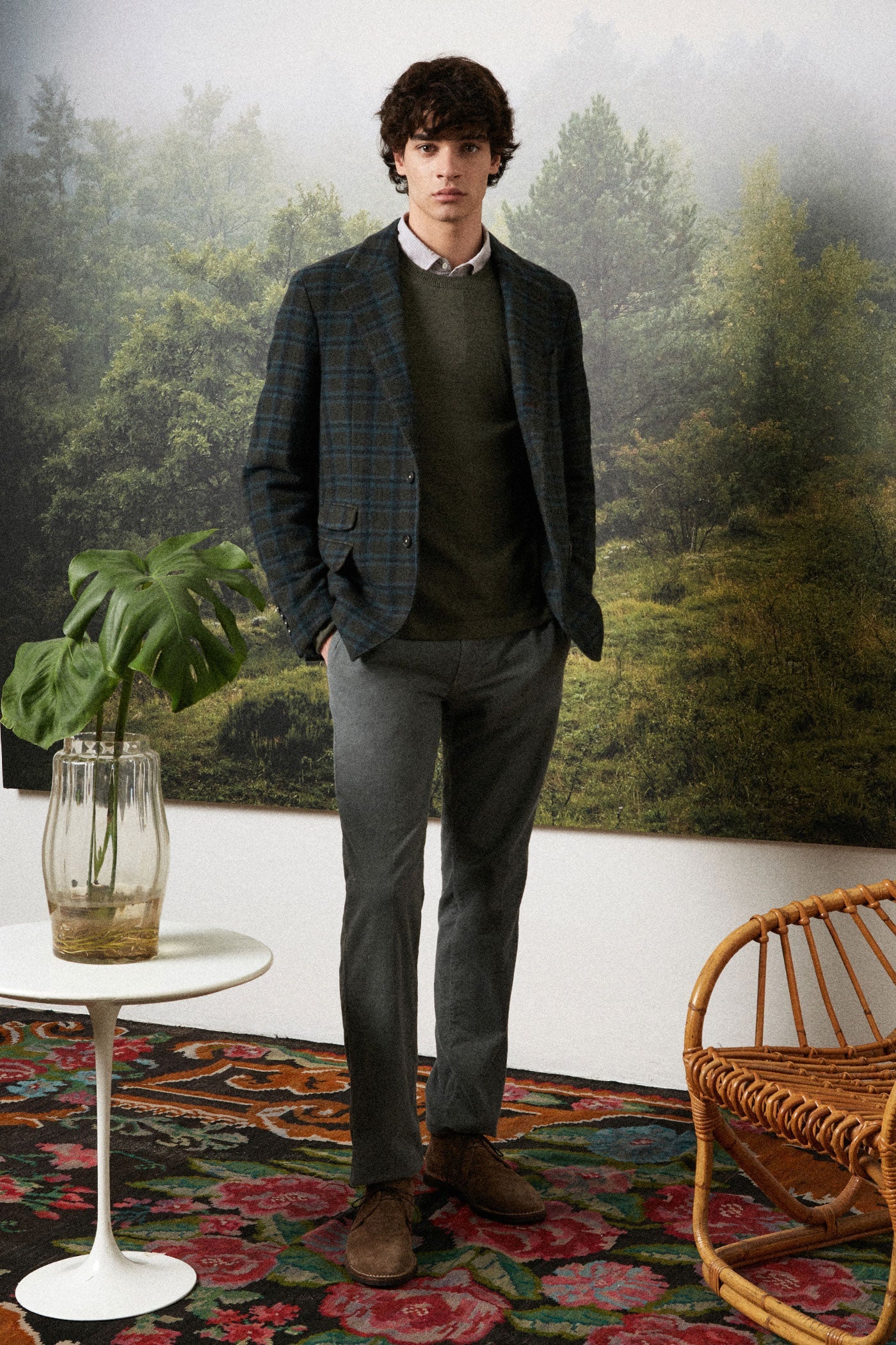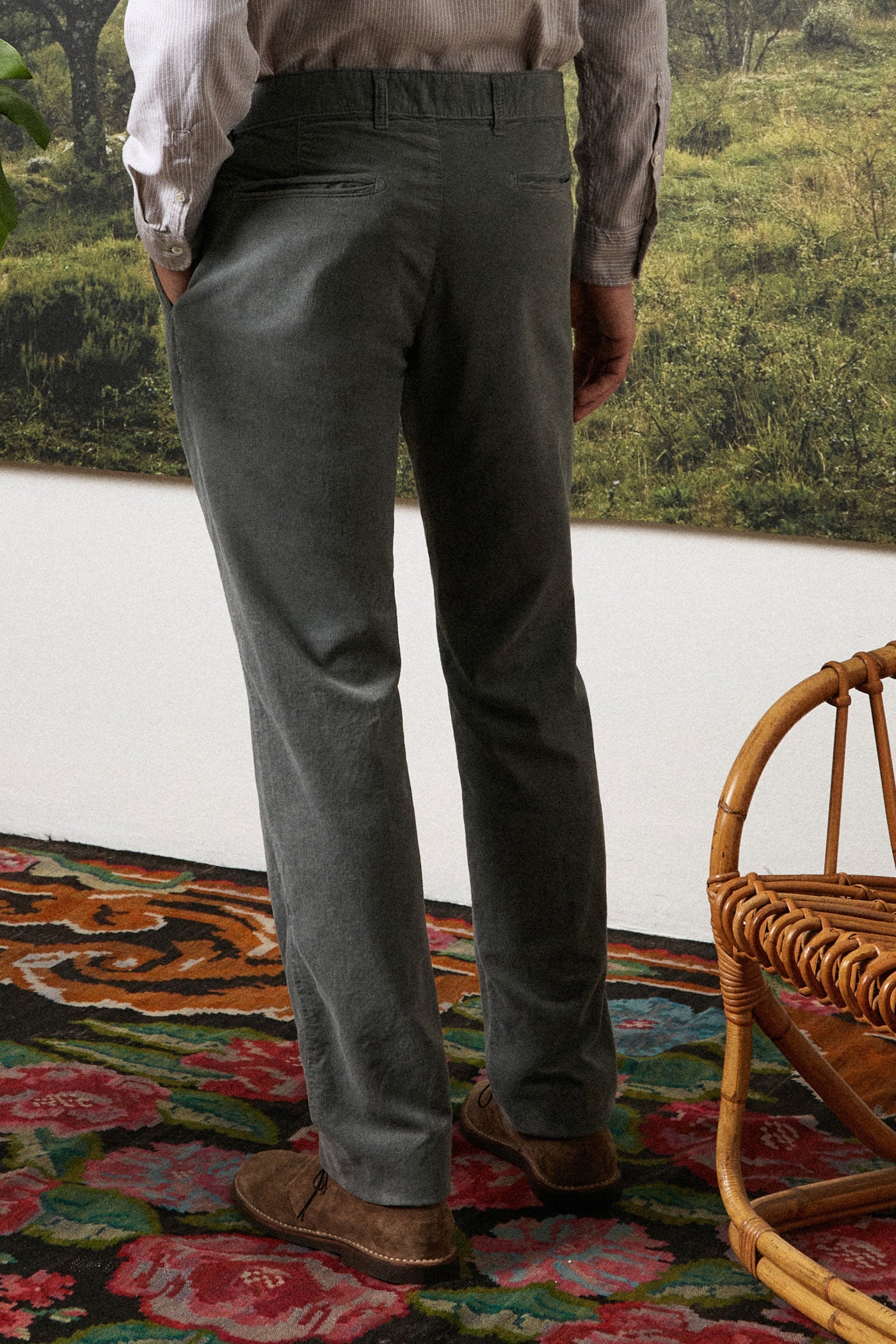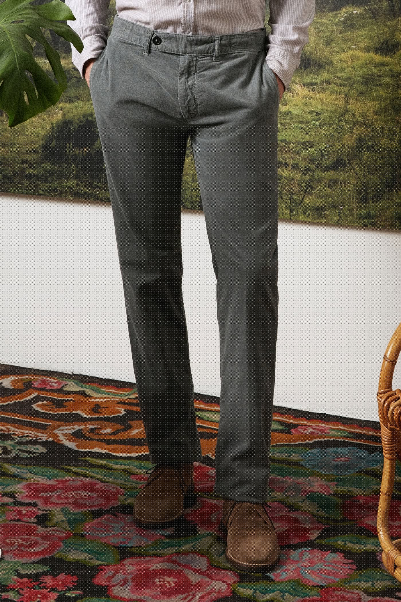 Regular slim fit flat front trousers. Tab-button closure + zip, rear fillet pockets. Made in cotton baby corduroy. Made in Italy.