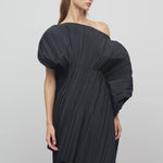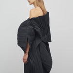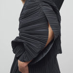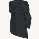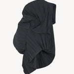 INFO Voluminous asymmetrical top in pleated matte poly wool with raw edge hem, side zip closure, and internal silk slip. |