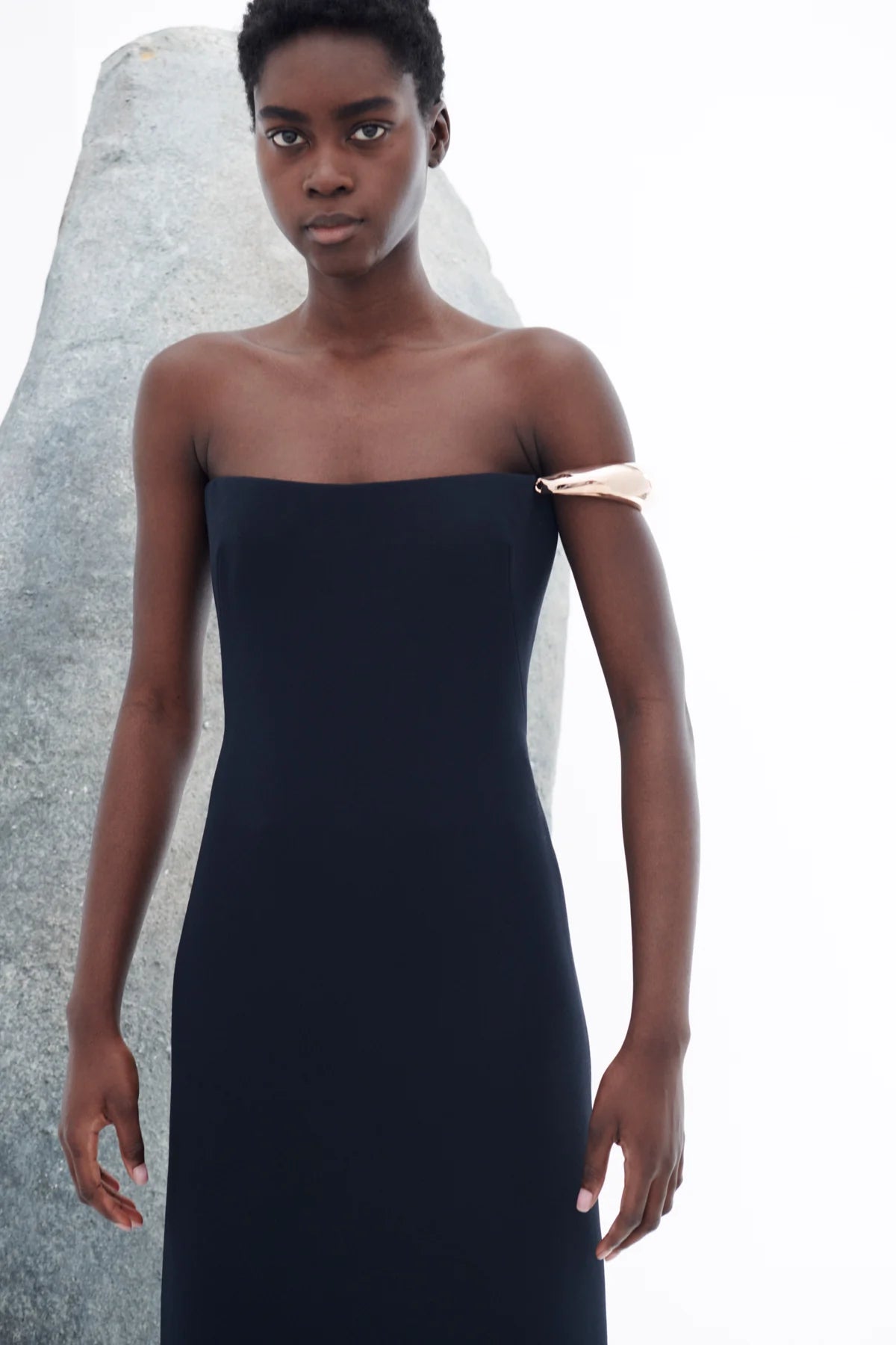 INFO The clean slim column form of the Anica strapless dress creates a flattering sharp ease in sponge wool crepe. Punctuated with a sculptural rose-gold upper armband. Complete with center-back skirt slit for ease of movement. Details:
