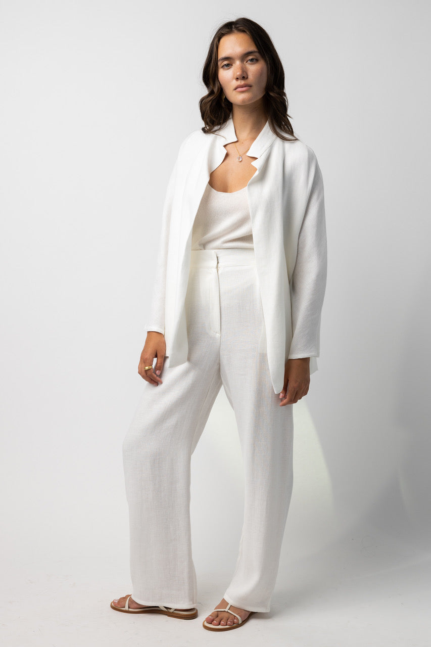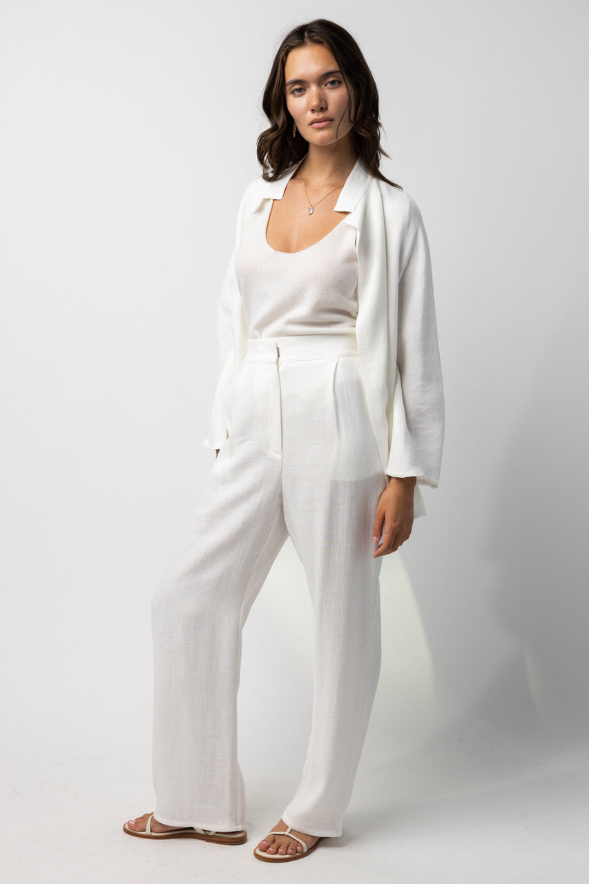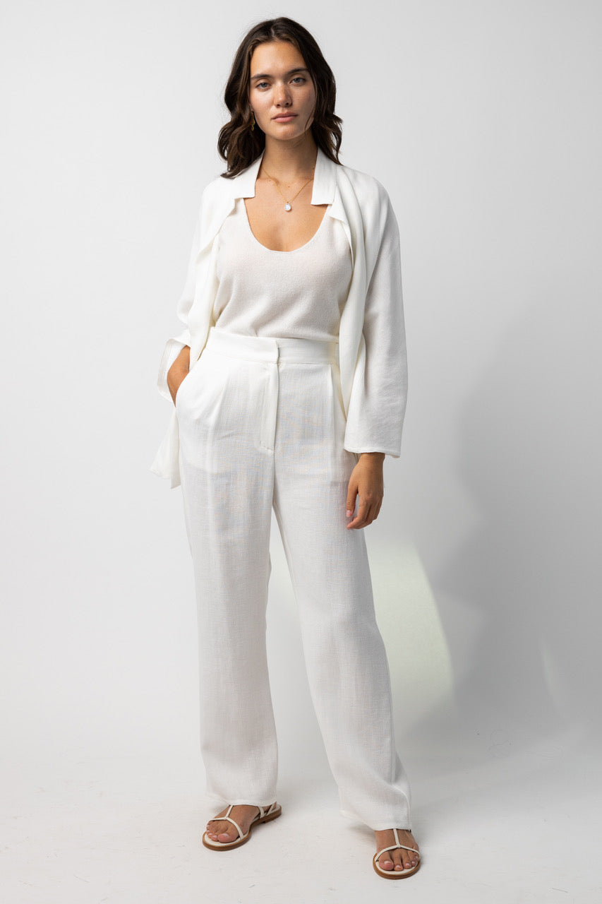 INFO High Waisted Pants from Dusan featuring zipper and button closure, double-pleated front, slant pockets, wide legs, and cropped fit. |