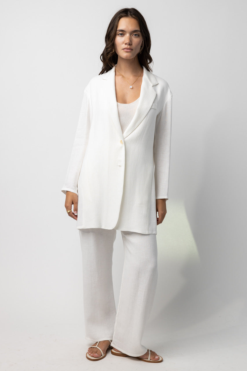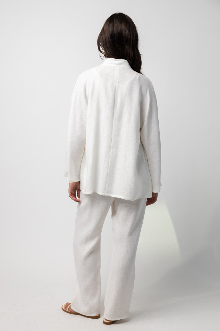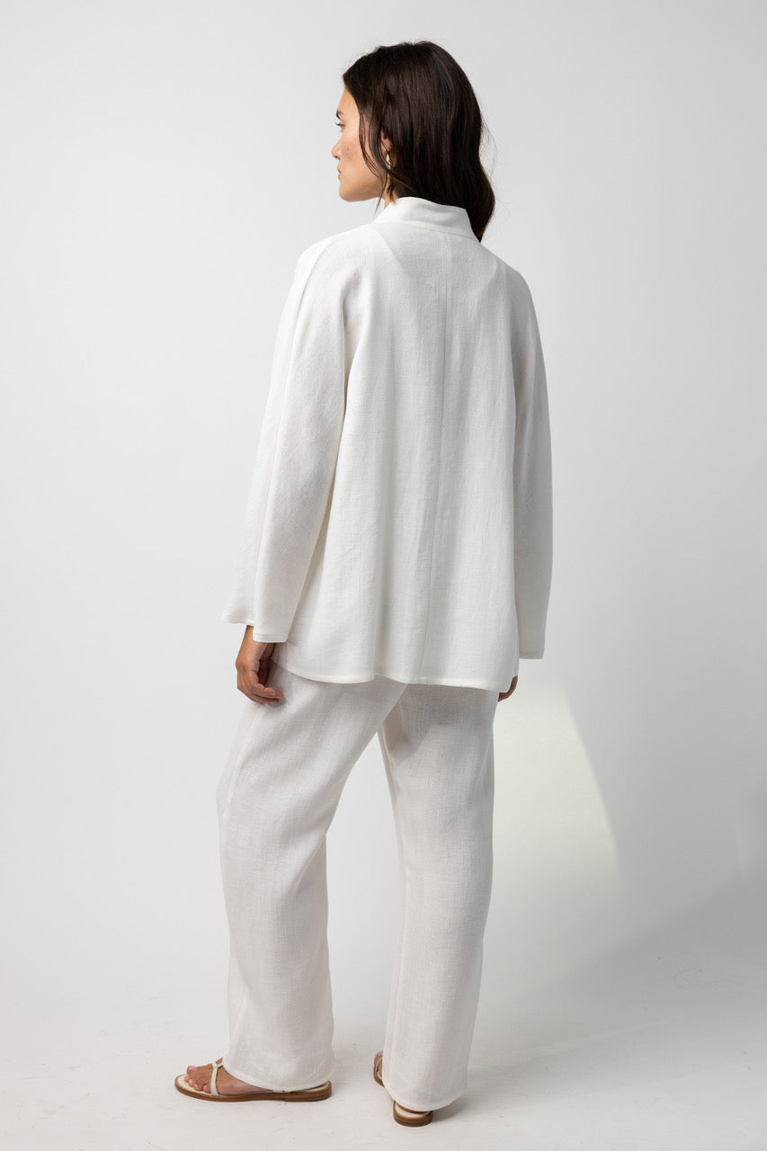 INFO High Waisted Pants from Dusan featuring zipper and button closure, double-pleated front, slant pockets, wide legs, and cropped fit. |