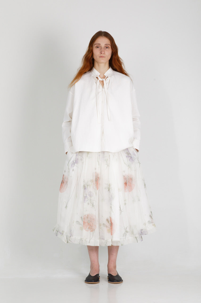 Solange Silk Organiza Skirt in Printed Floral School-uniform-inspired pleated midi skirt.Box pleats and gathers at the waistline, creating a voluminous silhouette. Elasticated waist, adjustable with inside drawstring. Concealed pouch pockets in the side seams. Crisp, silk organza, with a flower print inspired by natural, pressed flowers. Lined with soft, lightweight cotton fabric. Measurements Material : Printed Silk Organza Composition : 100% Silk Country of origin : Made in France |