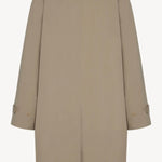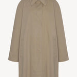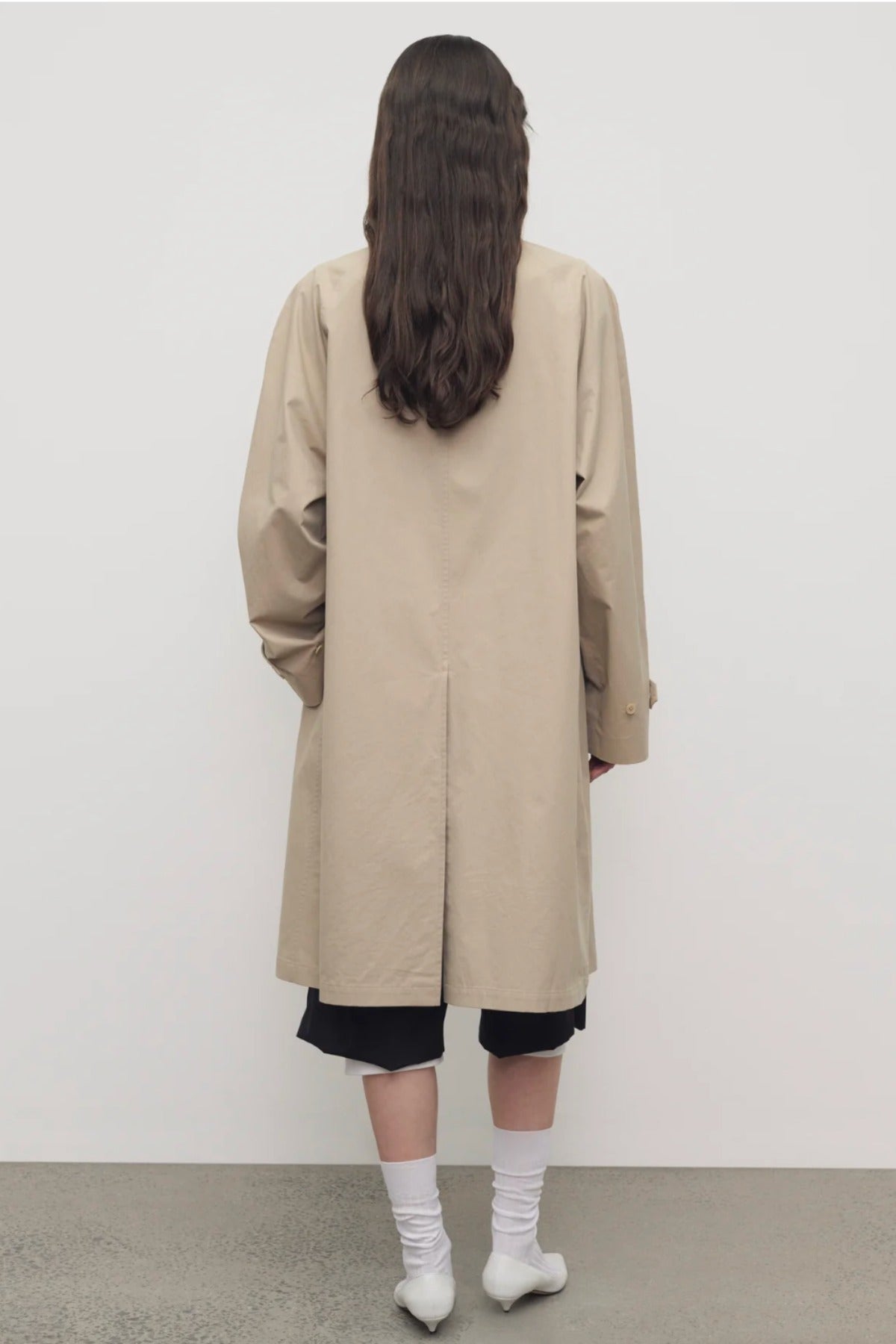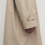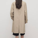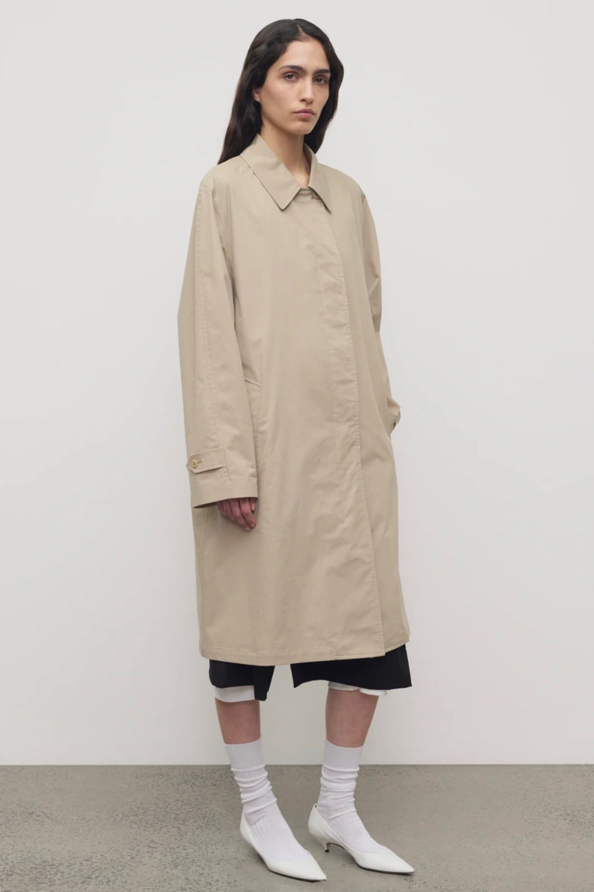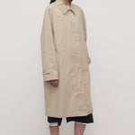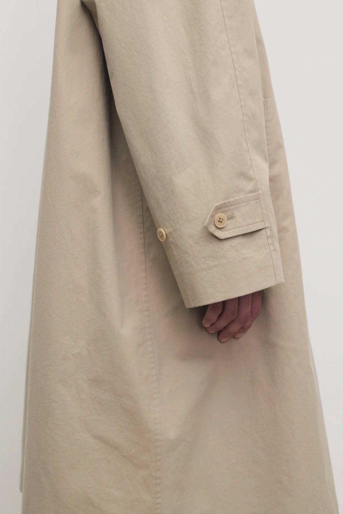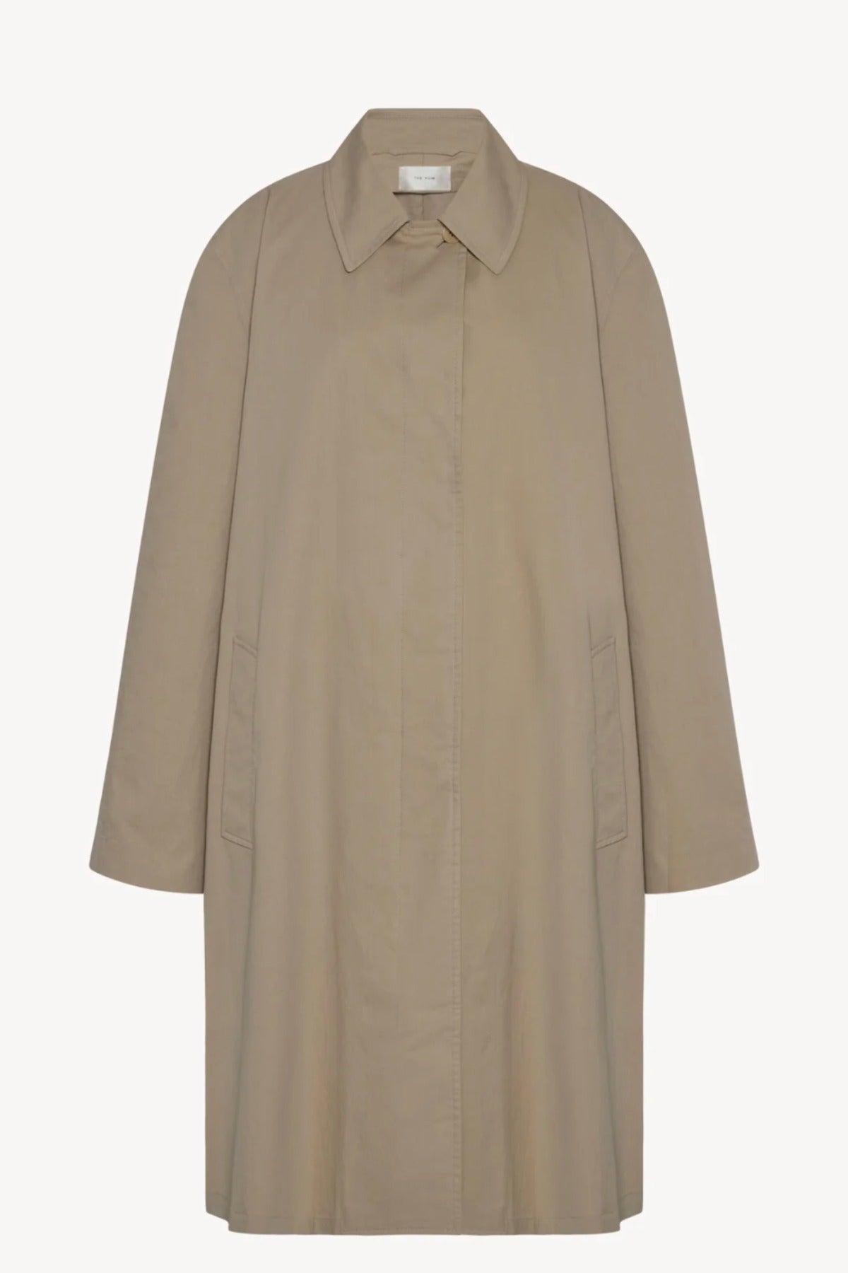 The Row Dayton Coat is part of the Spring 26 Collection. Single-breasted car coat in sanded Pima cotton with relaxed knee-length fit, raglan construction, slant welt pockets, and concealed front placket with button closure.