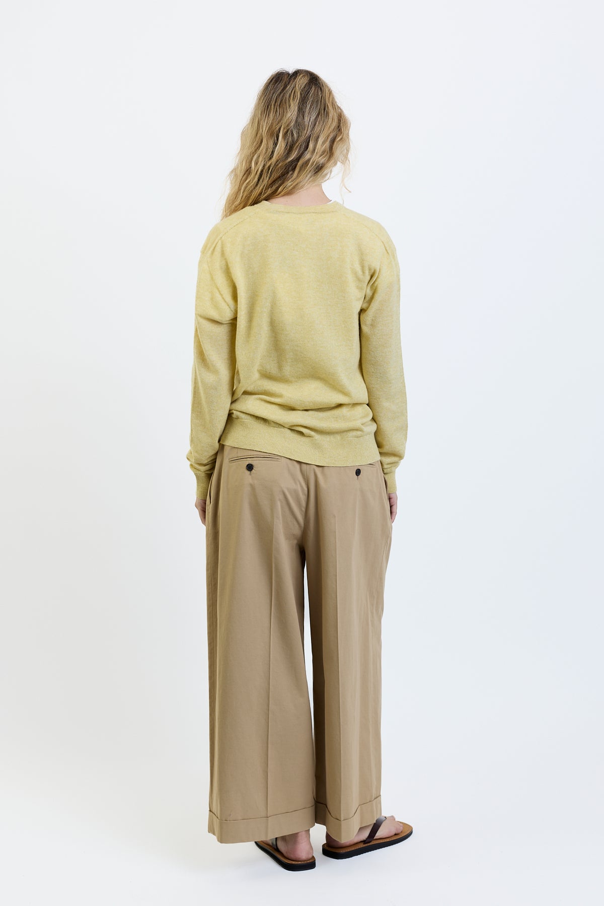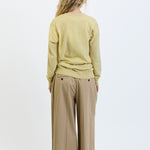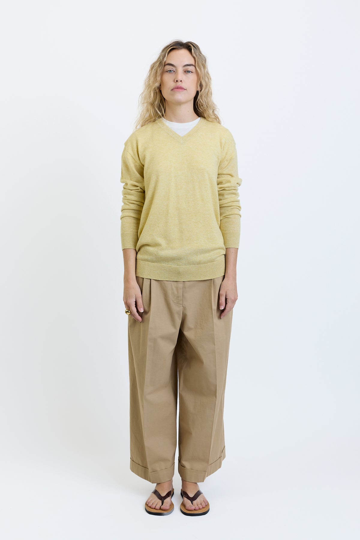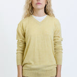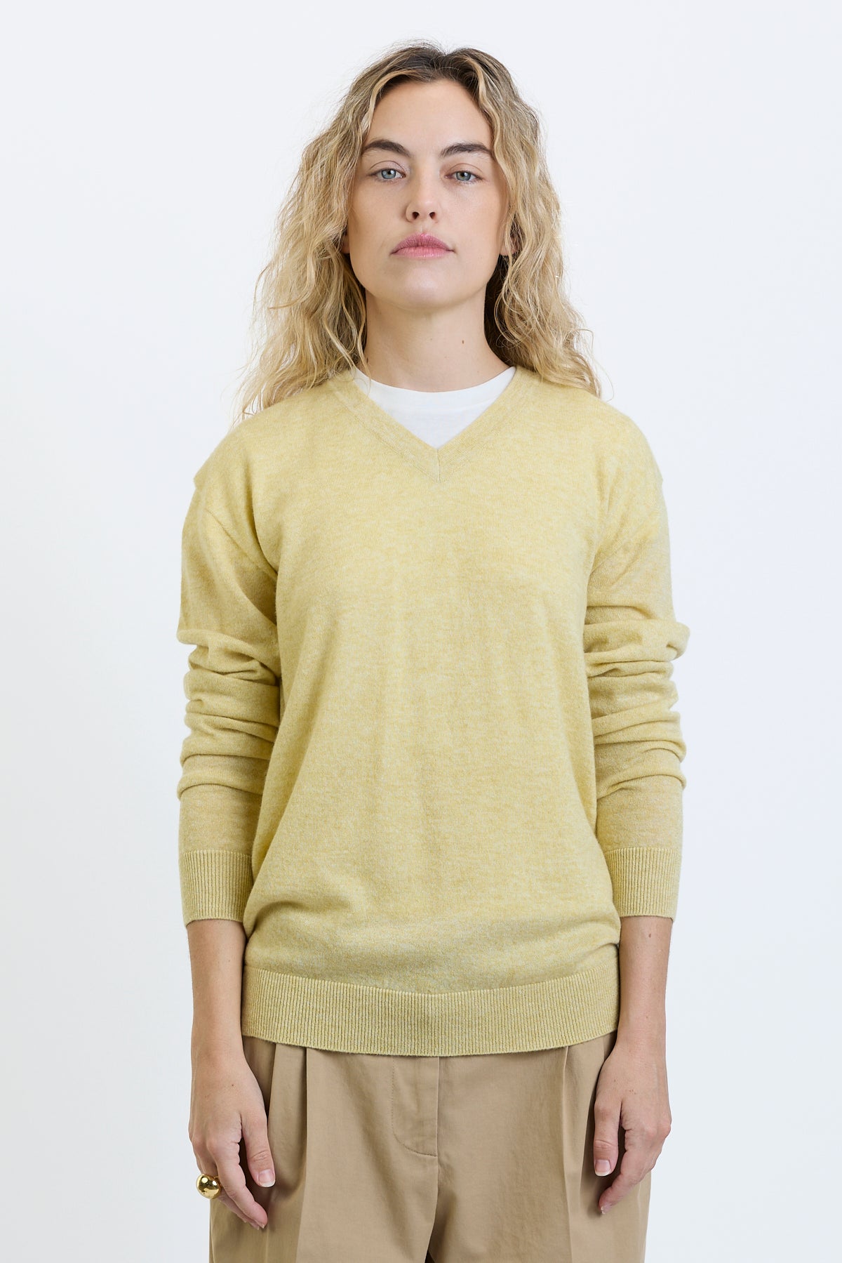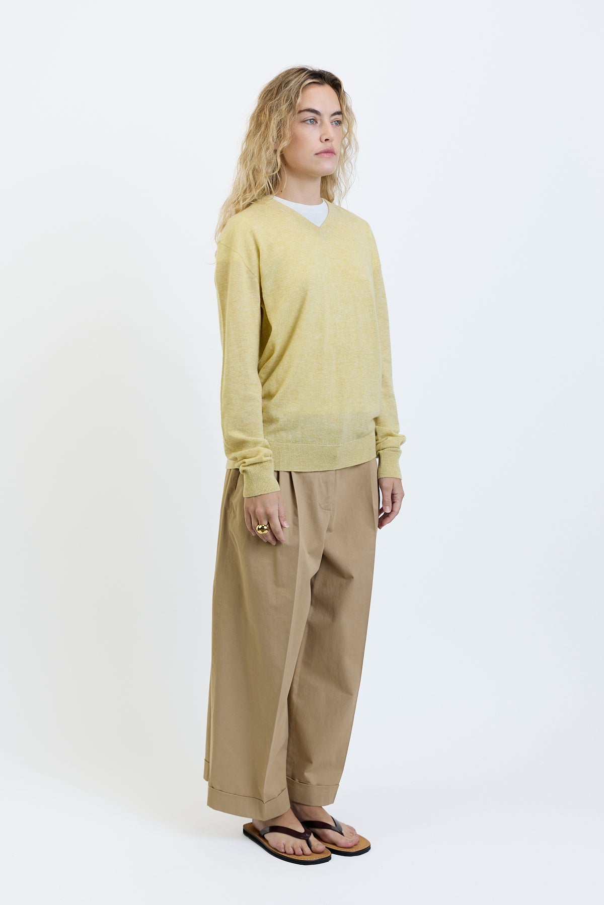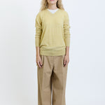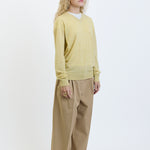 The Row Nian Top is part of the Spring 26 Collection. Long-sleeved v-neck sweater in fine Scottish cashmere with boxy fit, seamless construction, and ribbed neckline, cuffs, and hem. Specially washed to achieve a fresh, breathable finish, the ultralight knit offers natural warmth and seasonless appeal.