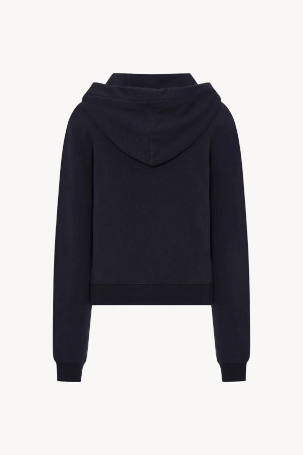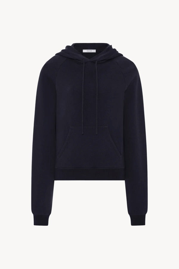 The Row Timia Top is part of the Fall 25 Collection. Slim hooded sweatshirt in cotton and cashmere French terry with raglan sleeves, front pouch pocket, and ribbed cuffs and hem.