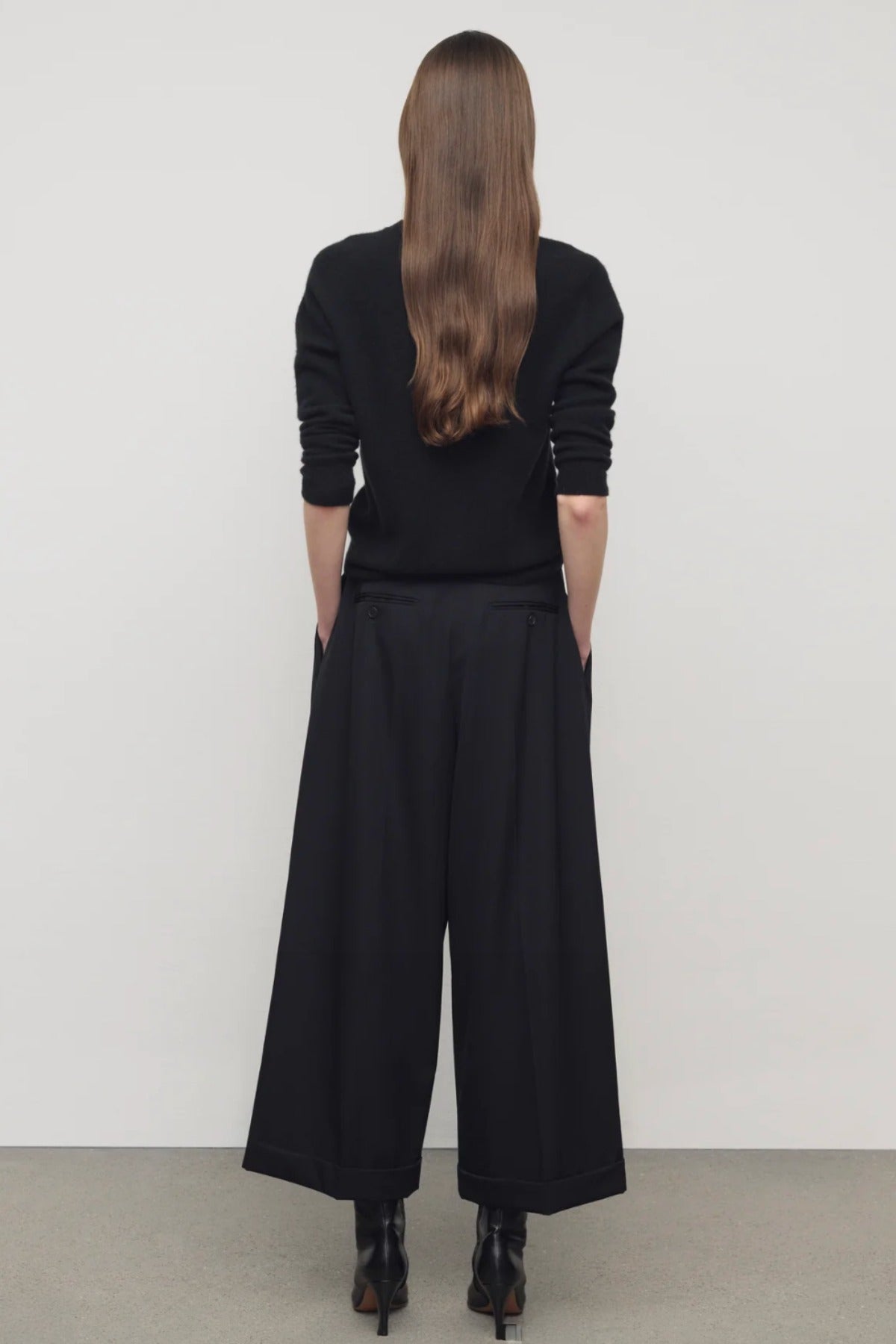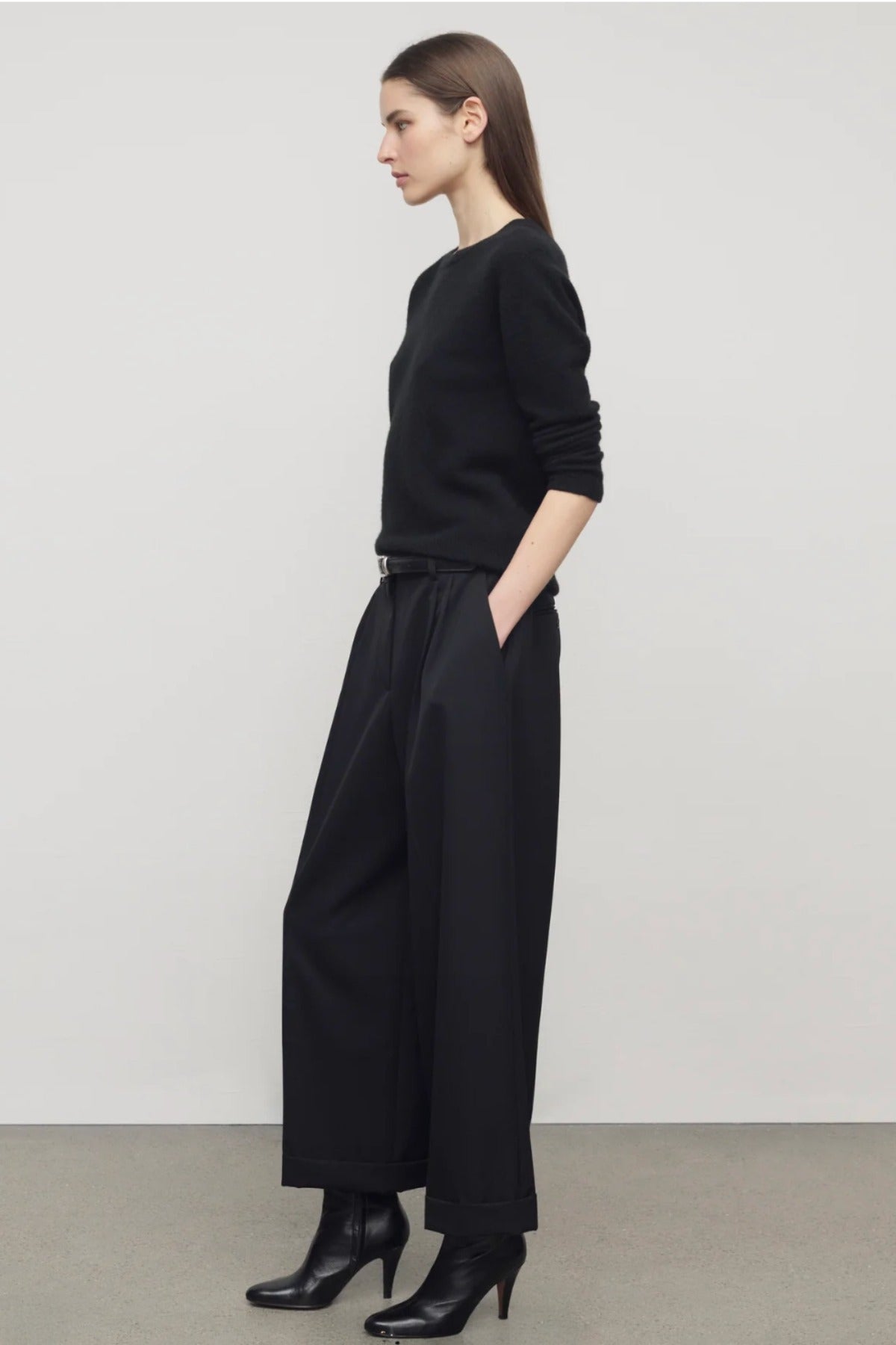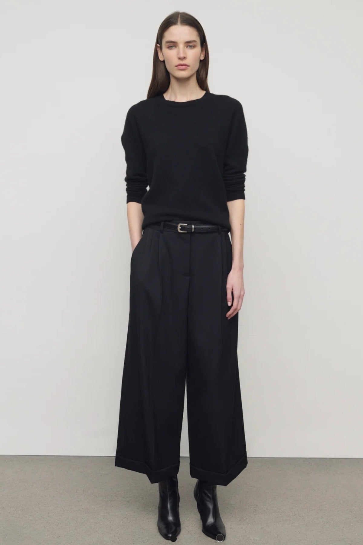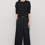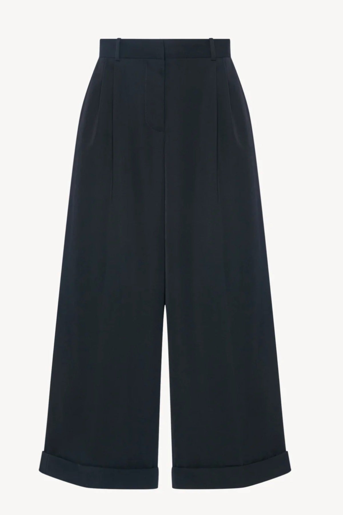 The Row Lior Pant is part of the Spring 26 Collection. Tailored low-rise trouser in fluid Japanese wool gabardine with wide cuffed leg, front double pleats, and side slash pockets.