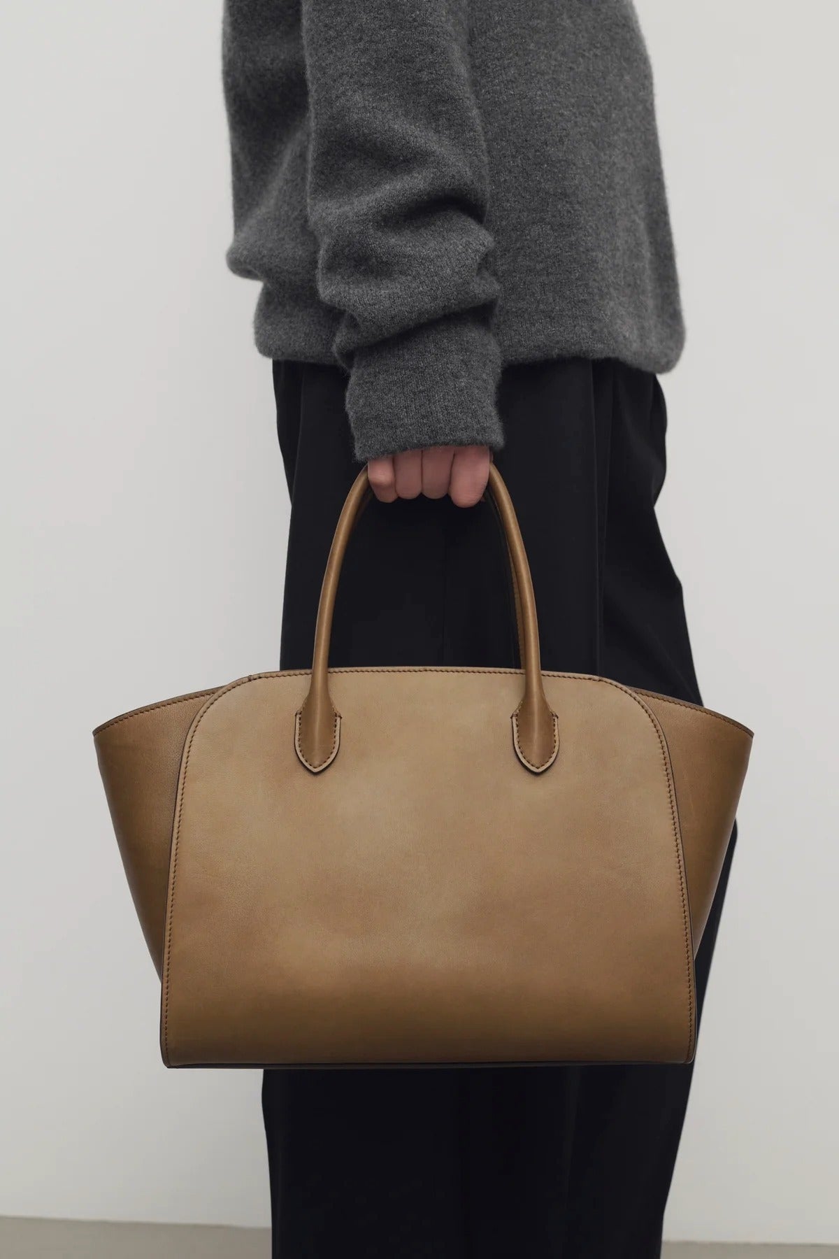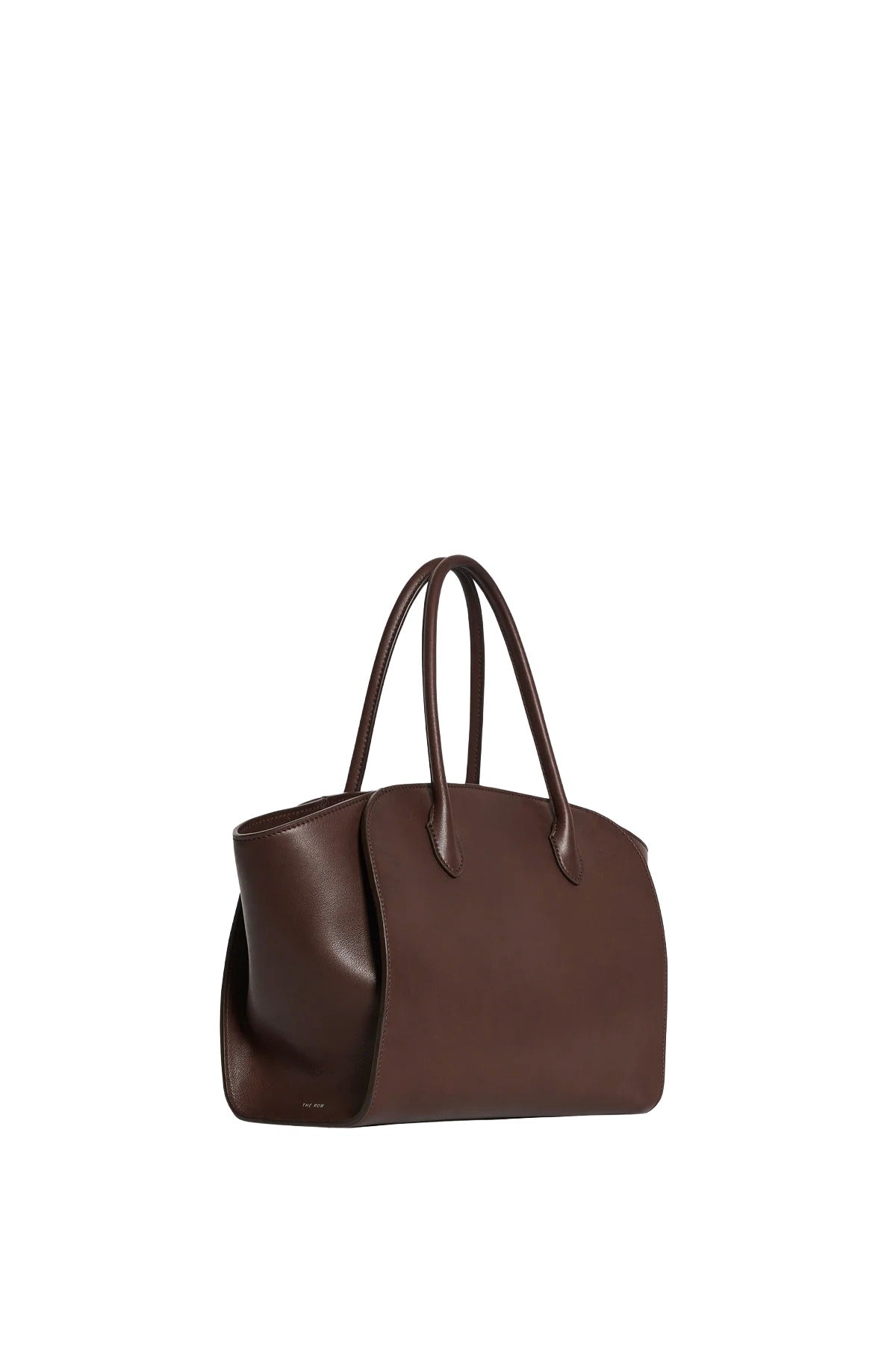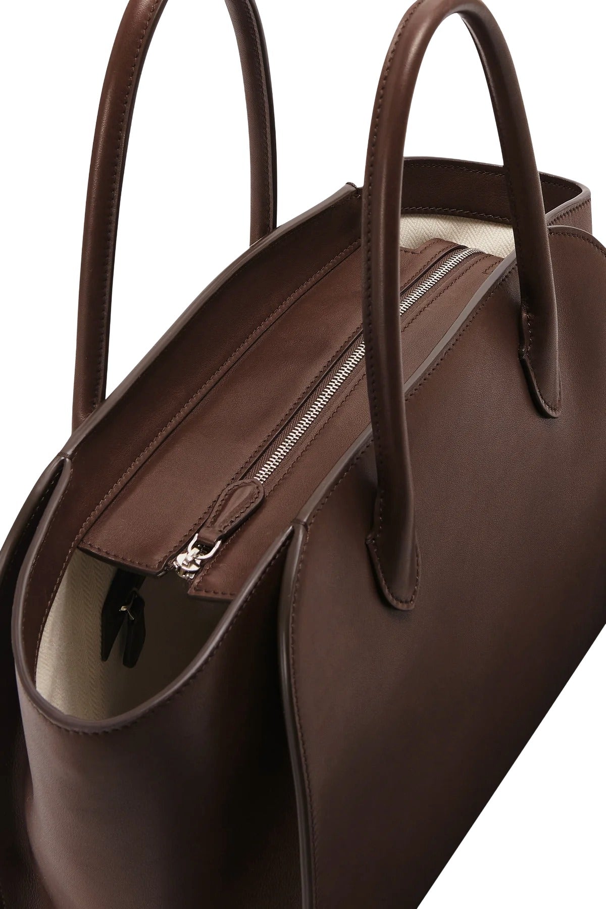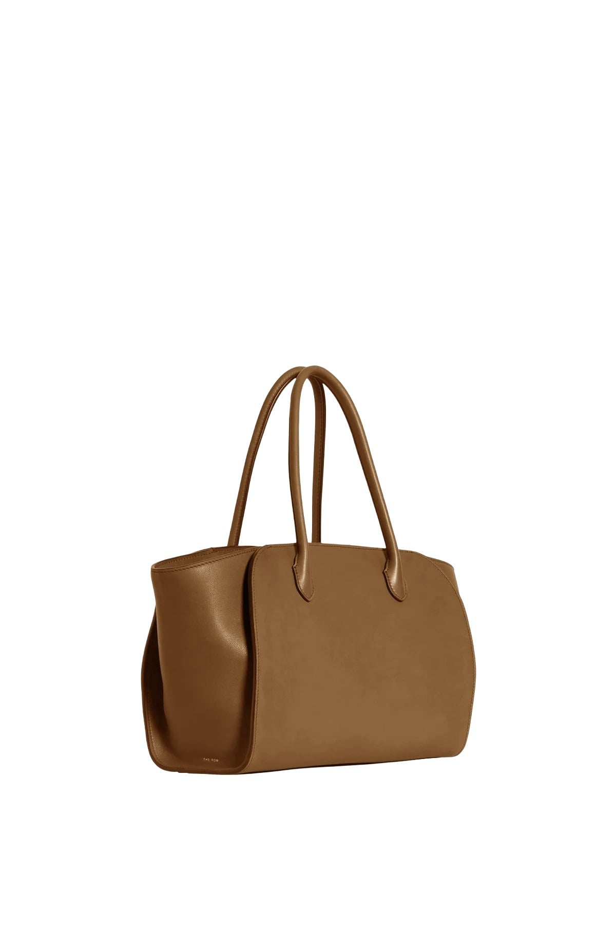 The Row Marlo 12 Bag in Saddle Leather is part of the Winter 25 Collection. Softly structured tote bag in polished saddle leather with tubular handles, gusseted side panels, and top zipper closure. Untreated and drum-dyed, the leather develops character with time and use.