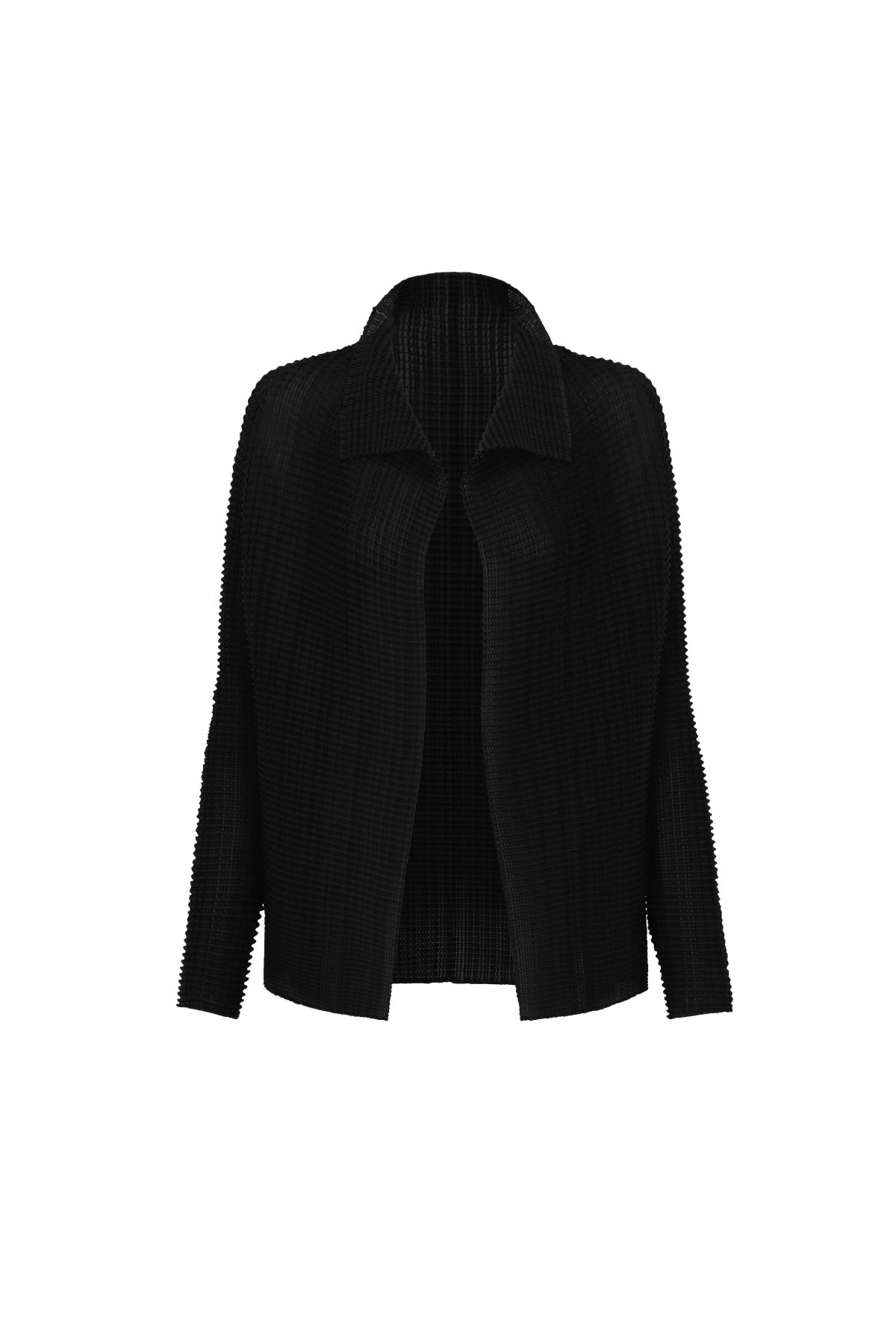 Issey Miyake Open Wooly Pleats Shirt is part of the Spring 25 Collection. This stretchy long-sleeved cardigan features vertical and horizontal pleats on recycled polyester material.
