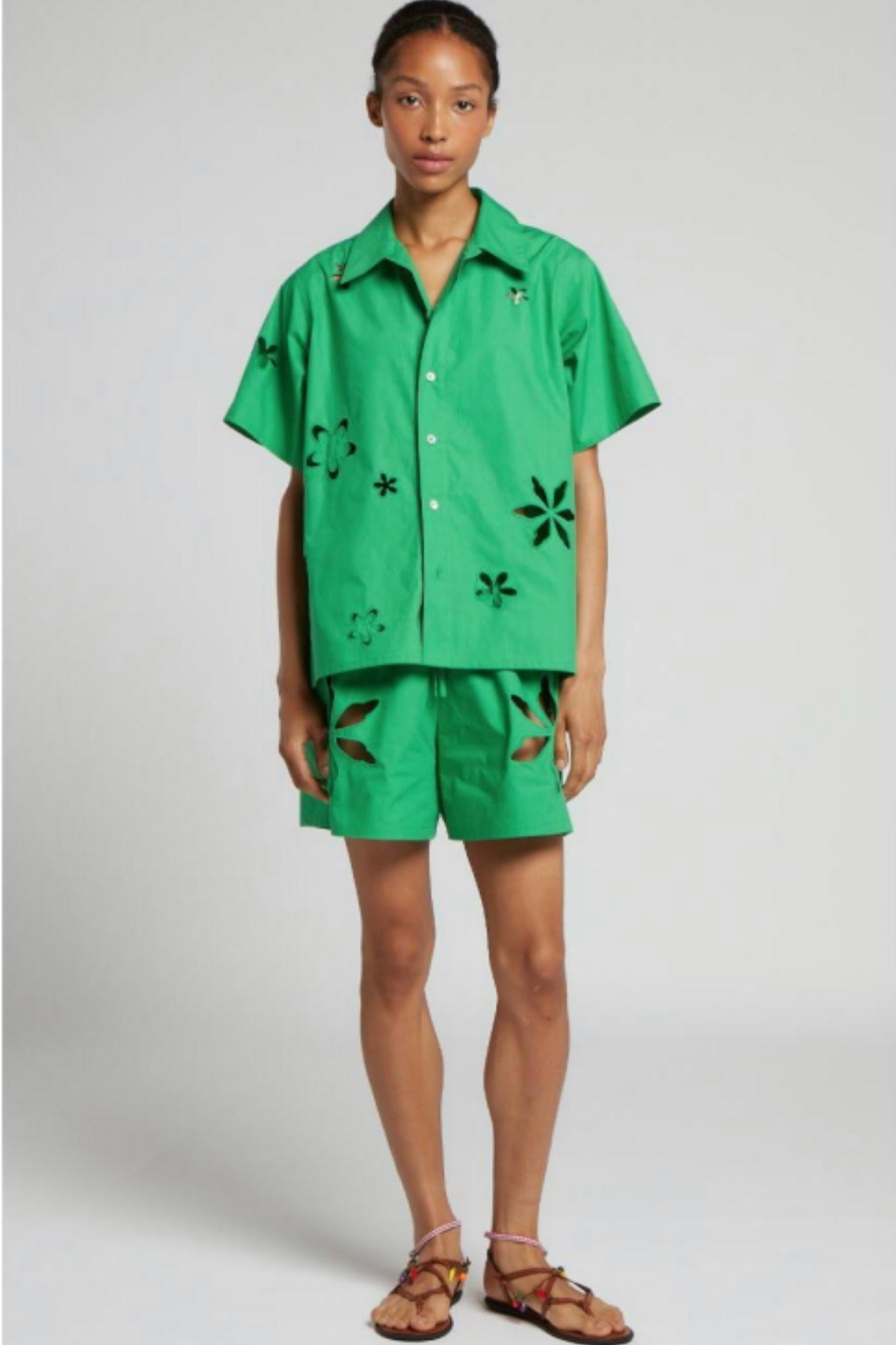 Mira Mikati Cut Out Short Sleeve Shirt is part of the Spring 26 Collection. A lightweight co-ord makes summer dressing a breeze. Pair this crisp cotton poplin shirt with its matching shorts or trousers in this bold green for effortless impact this season. It features branded mop buttons, side slits and cut-out florals — a nod to Mira’s love of nature.