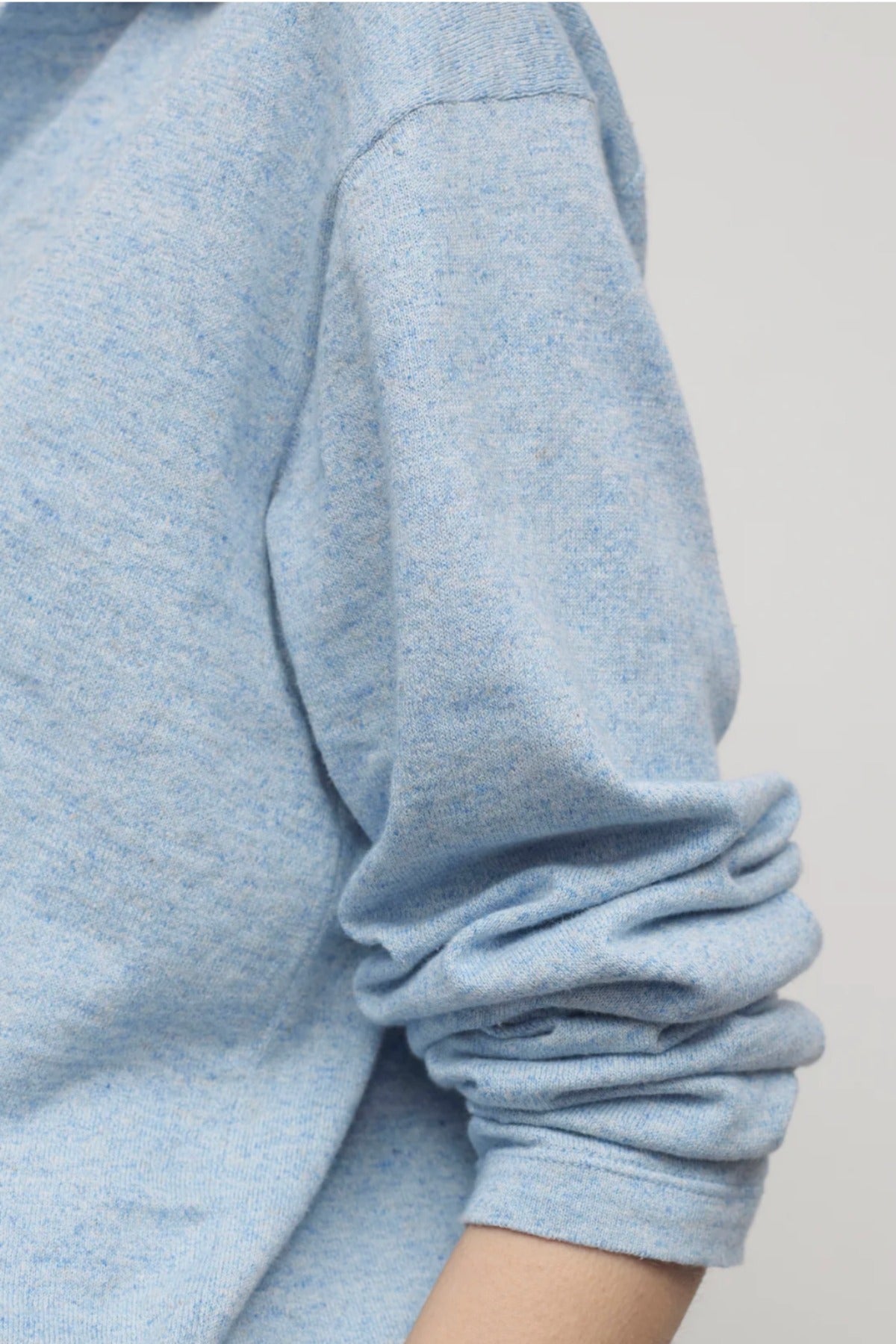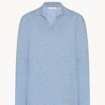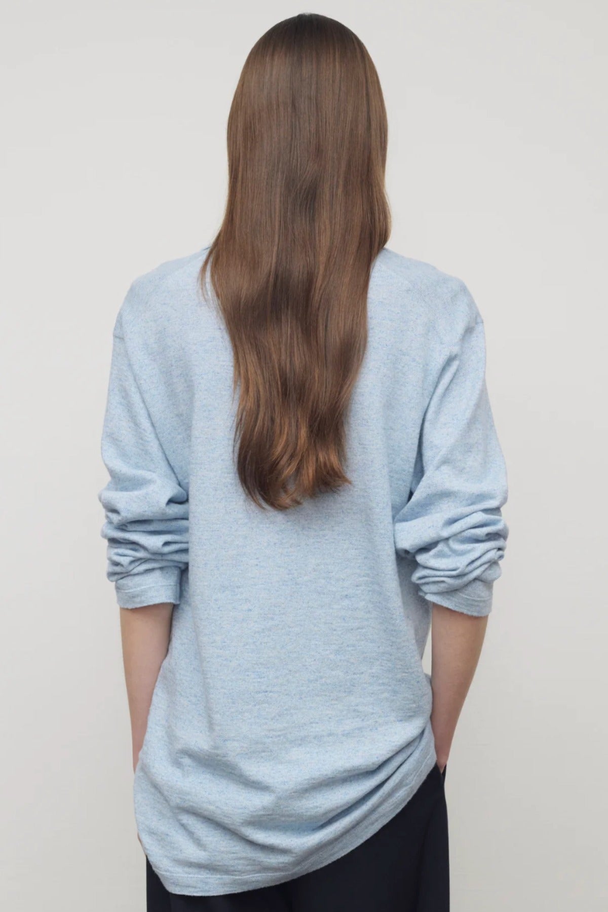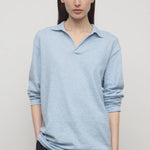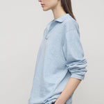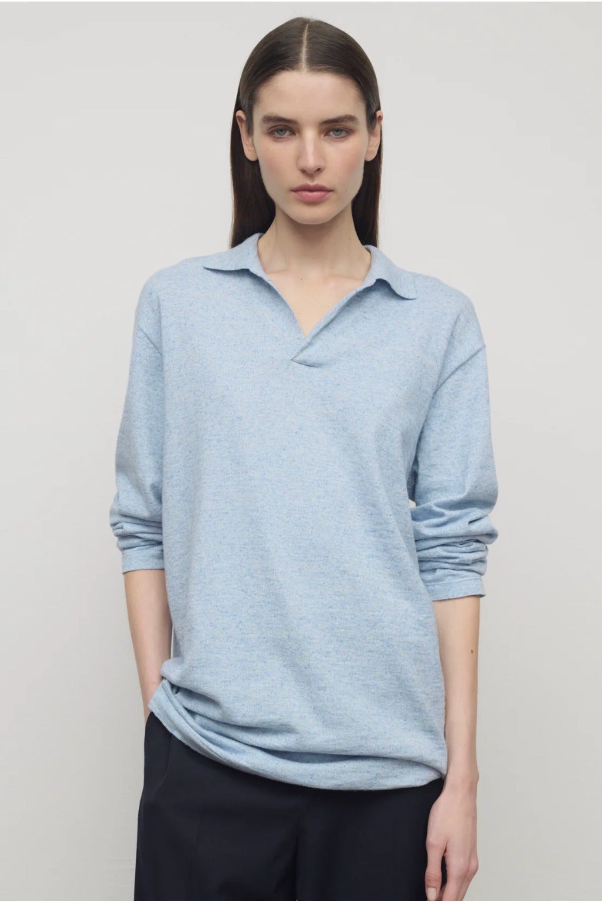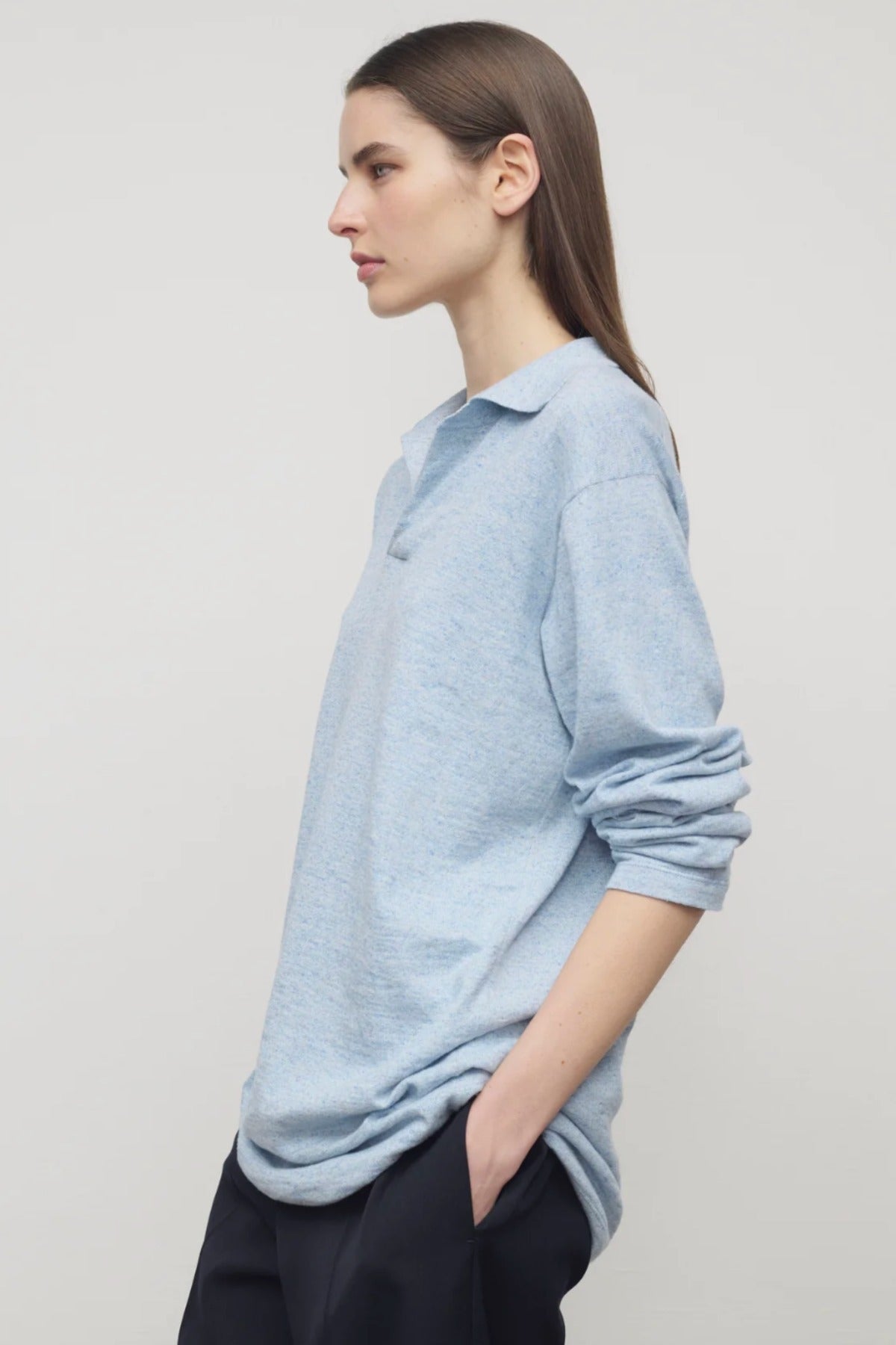 The Row Niosa Top is part of the Spring 26 Collection. Long-sleeved polo top in lightly textured melange cotton with oversized fit, buttonless front tab, and clean edge finish with covered stitch detailing. Crafted from organic cotton and natural linen, the fabric offers a lightweight yet structured hand and casually refined feel.