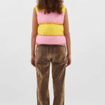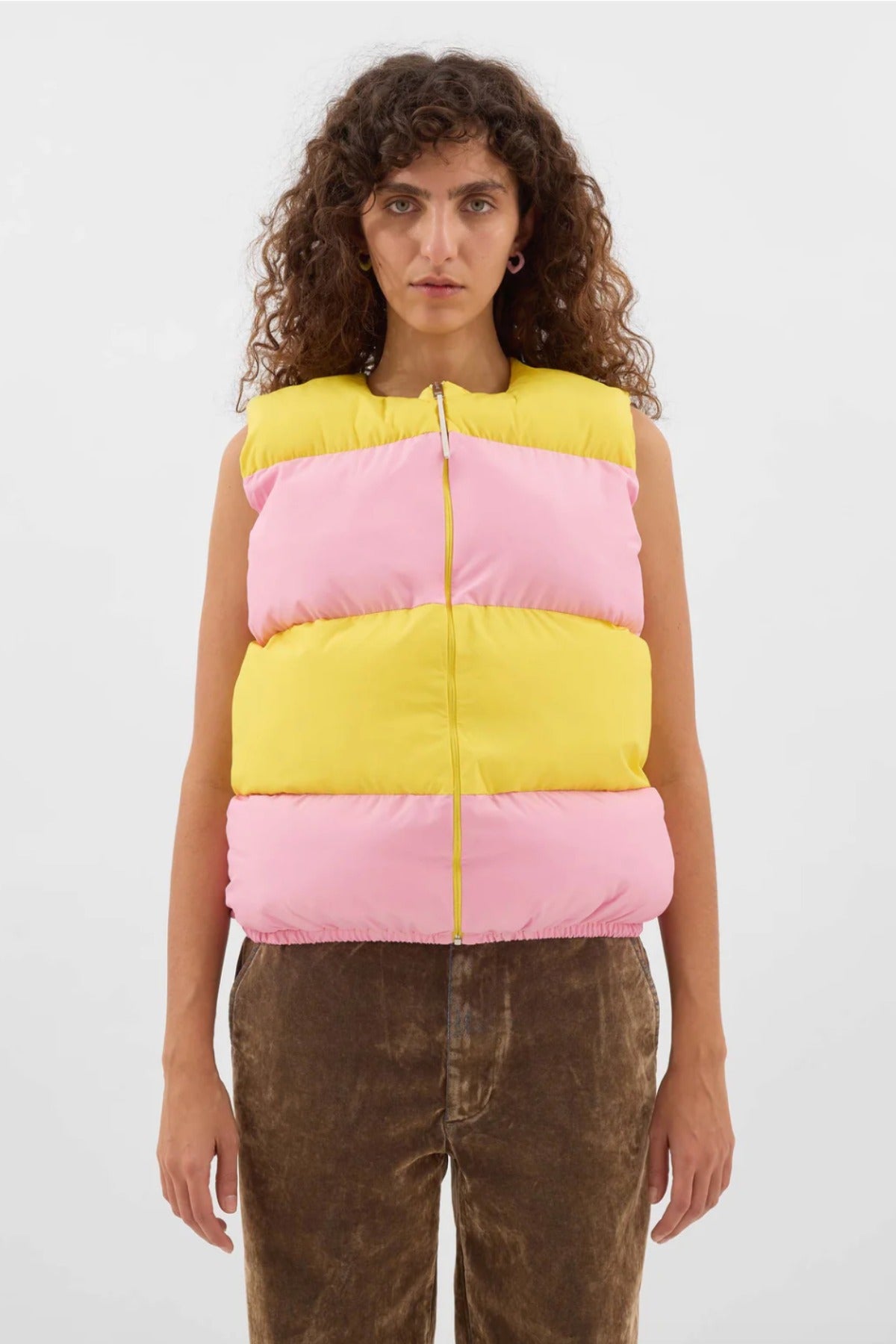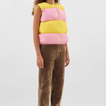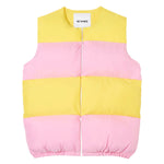 Sunnei Puffy Gilet is part of the Fall 25 Collection. Puffy gilet made with a linen blend and 100% recycled polyester filling featuring stripes with intarsia cut, adjustable hem, and SUNNEI branded silicon puller at zip closure.