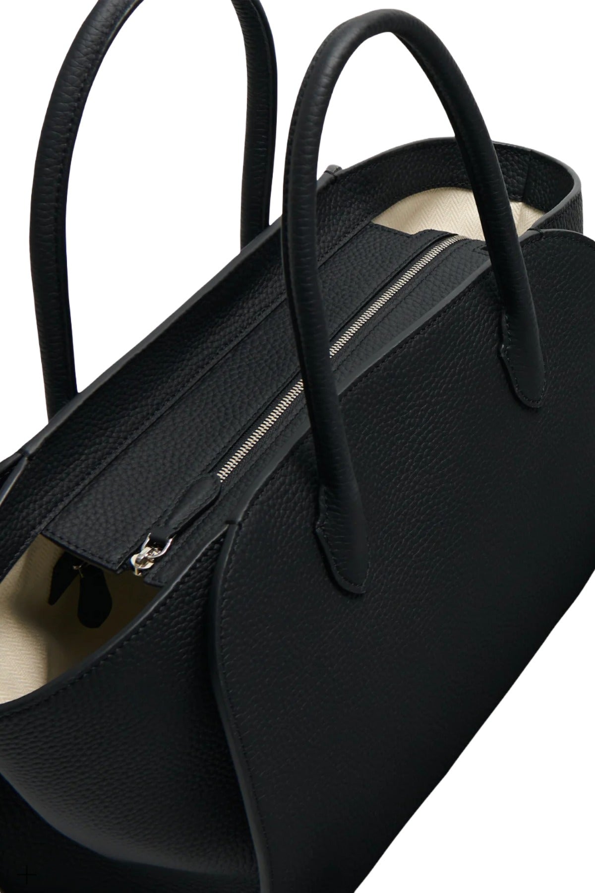 The Row Marlo 14 Bag in Matte Grain Calf Leather is part of the Winter 25 Collection. Softly structured tote bag in matte grained calfskin leather with tubular handles, gusseted side panels, and top zipper closure.