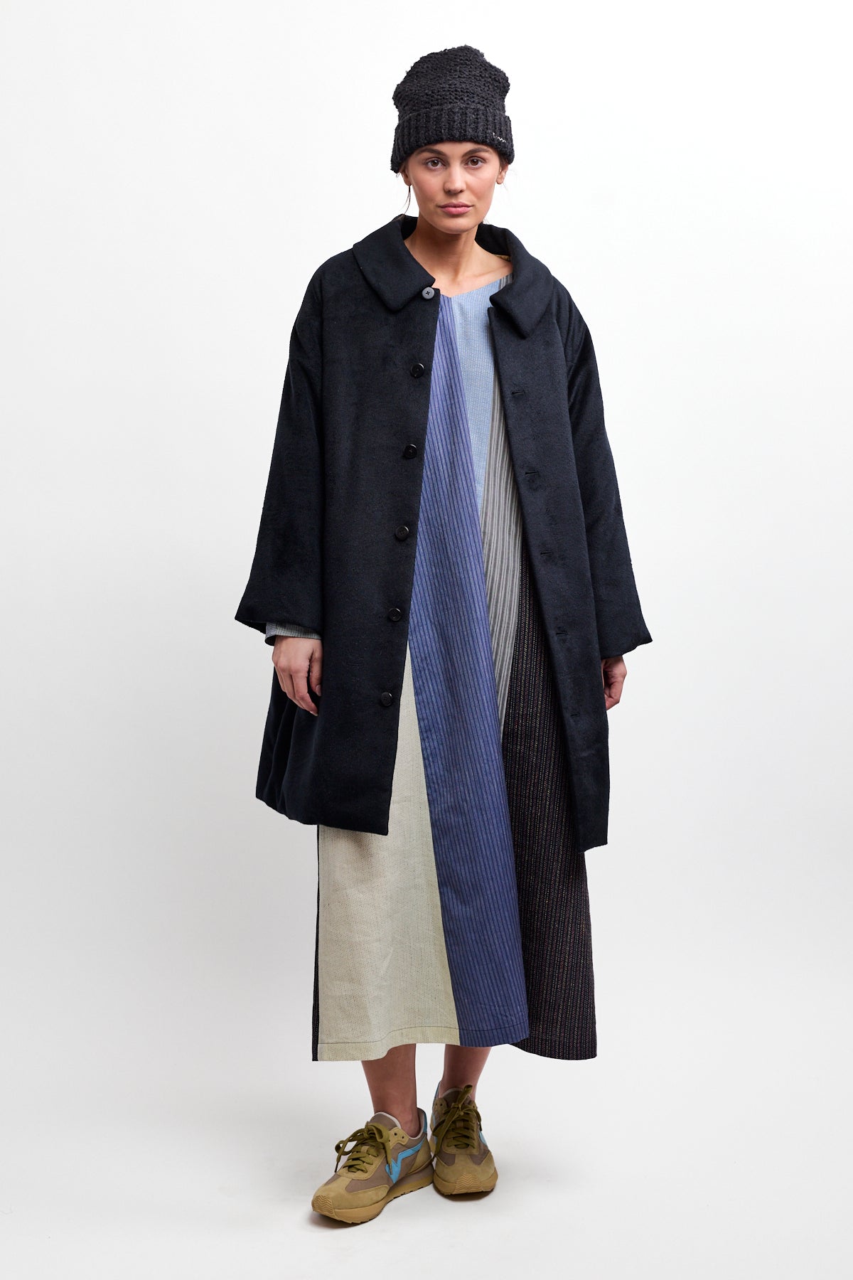 Front view of black bonnet drivers down coat on white background, with no model shown.