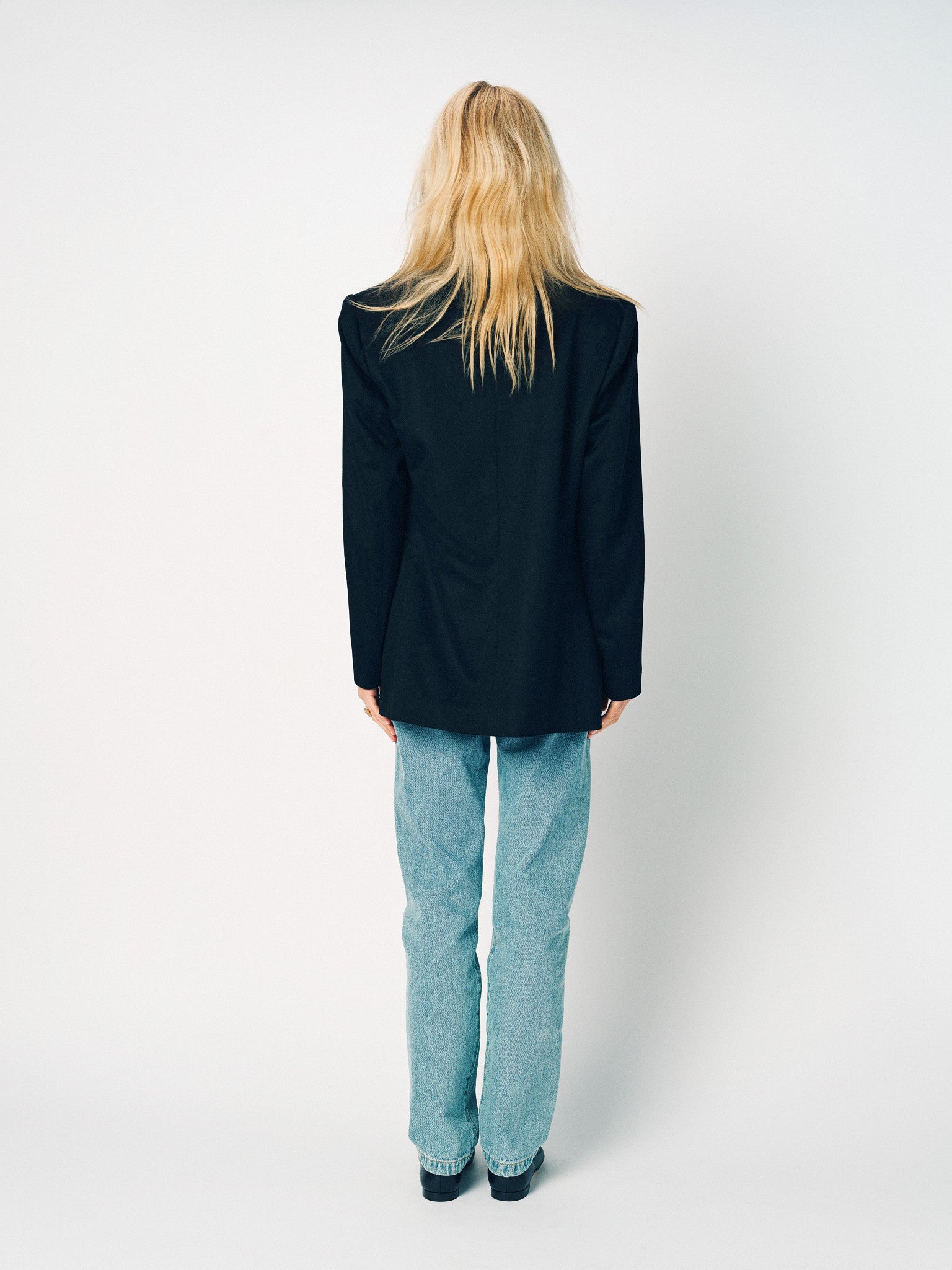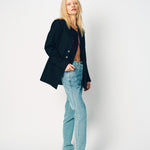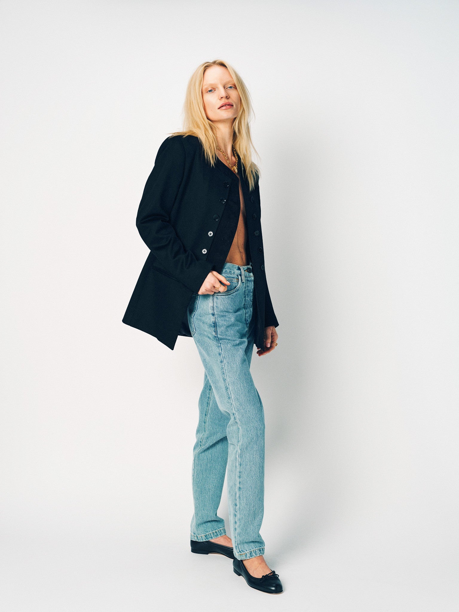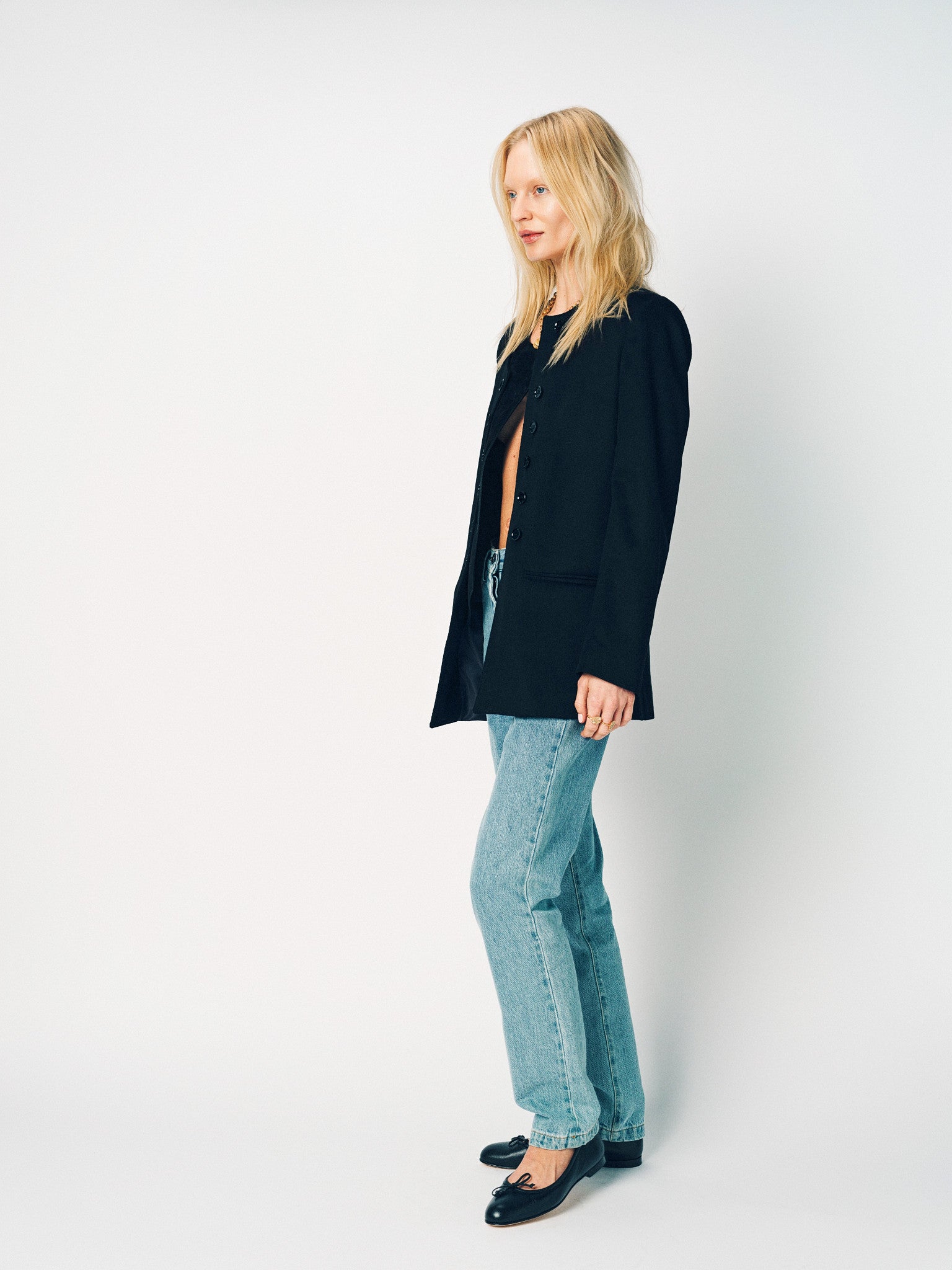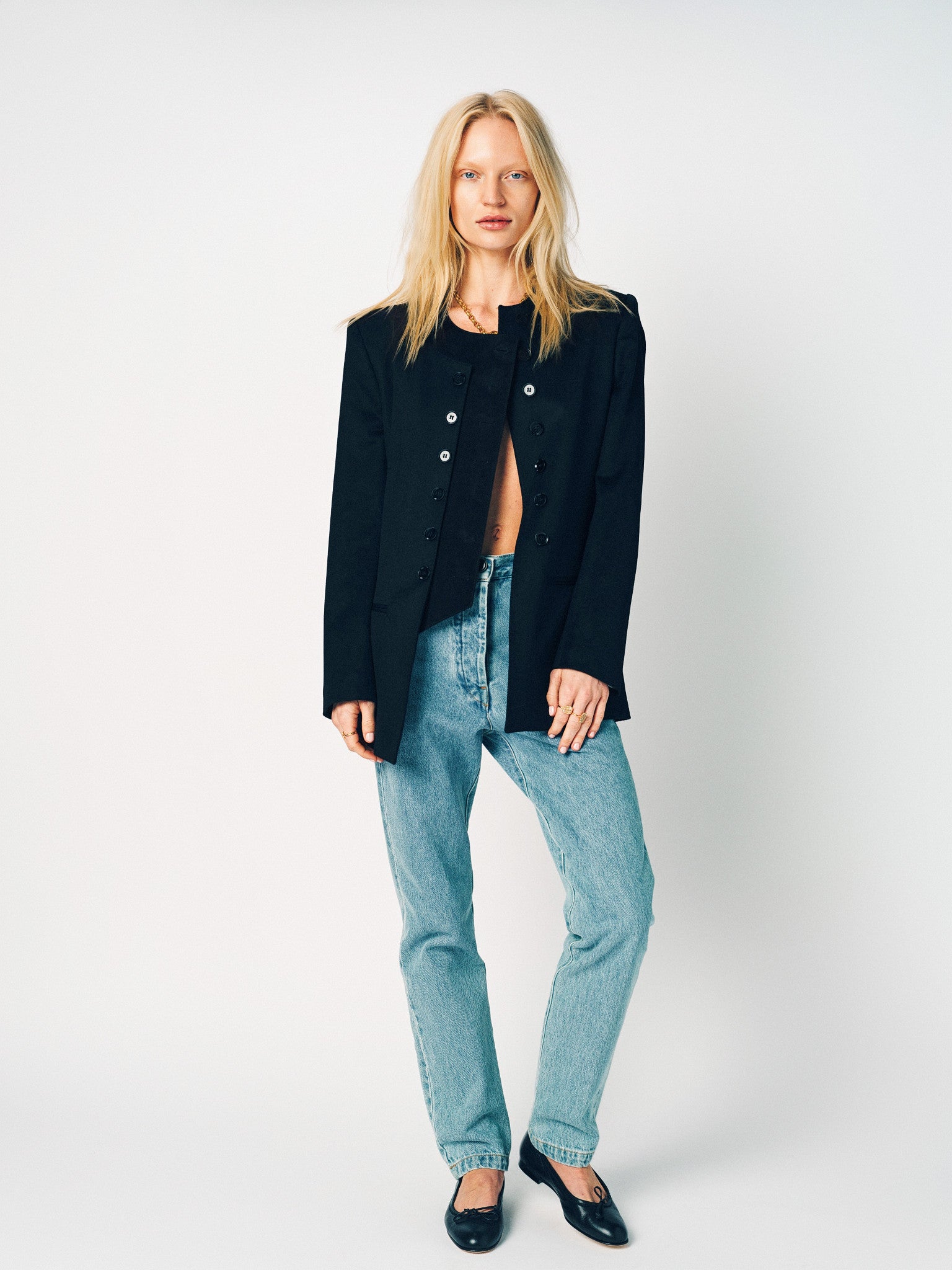 Giuliva Heritage Lara Blazer is part of the Fall 25 Collection. The Lara Blazer is tailored from pure cashmere and features a sharp, collarless silhouette with a clean, structured shoulder. Its defining detail is the asymmetric front placket in tonal suede, fastened with a row of covered buttons. An understated yet distinctive piece, elegant on its own, or styled open as a layering element.