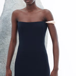 INFO The clean slim column form of the Anica strapless dress creates a flattering sharp ease in sponge wool crepe. Punctuated with a sculptural rose-gold upper armband. Complete with center-back skirt slit for ease of movement. Details: