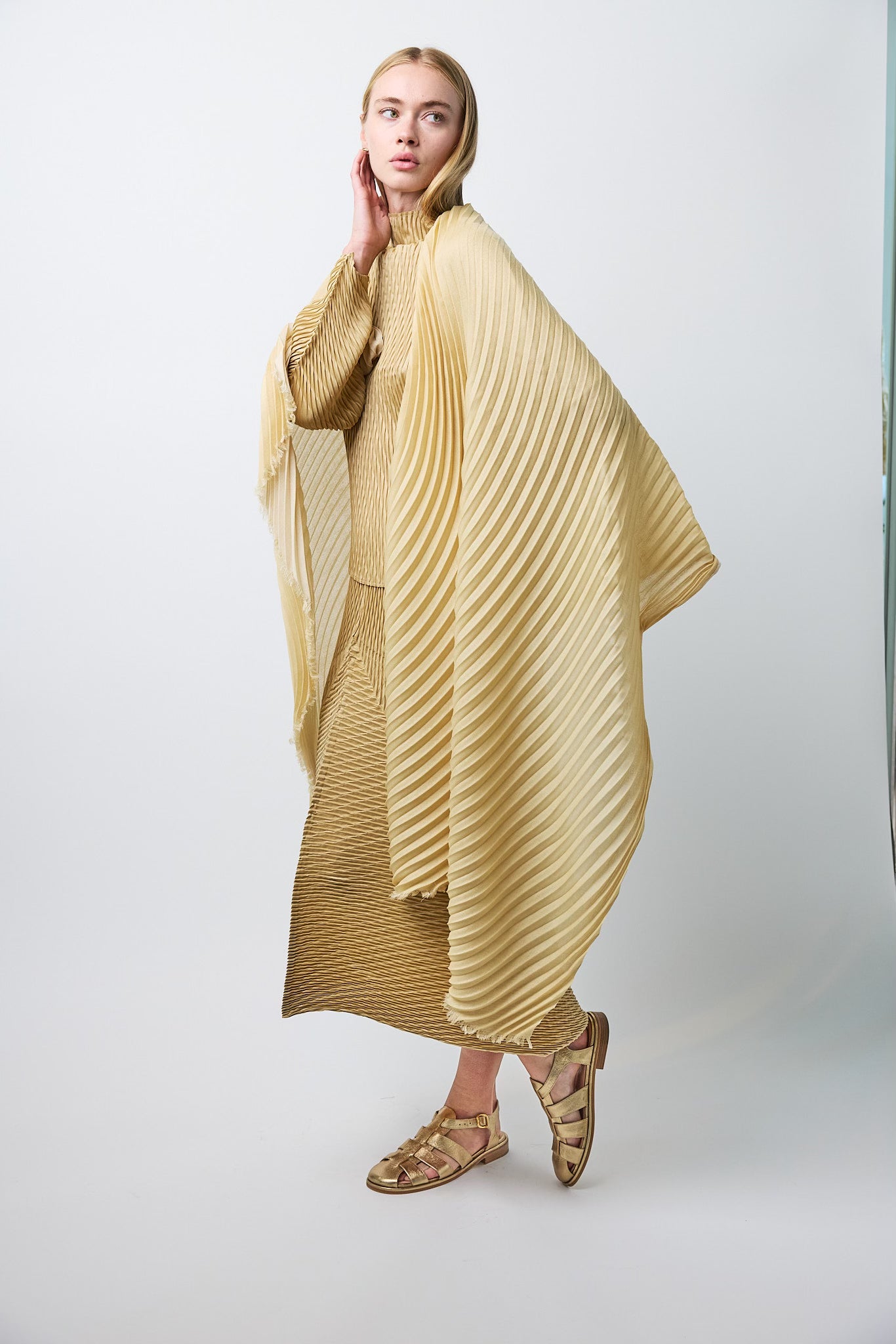 Double Pleats Stole Made from a soft silk and wool blend, DOUBLE PLEATS STOLE is an hand-pleated scarf series with a bicolor reversible design. Material: 70% Polyester, 20% Silk, 10% Wool (Woven) |