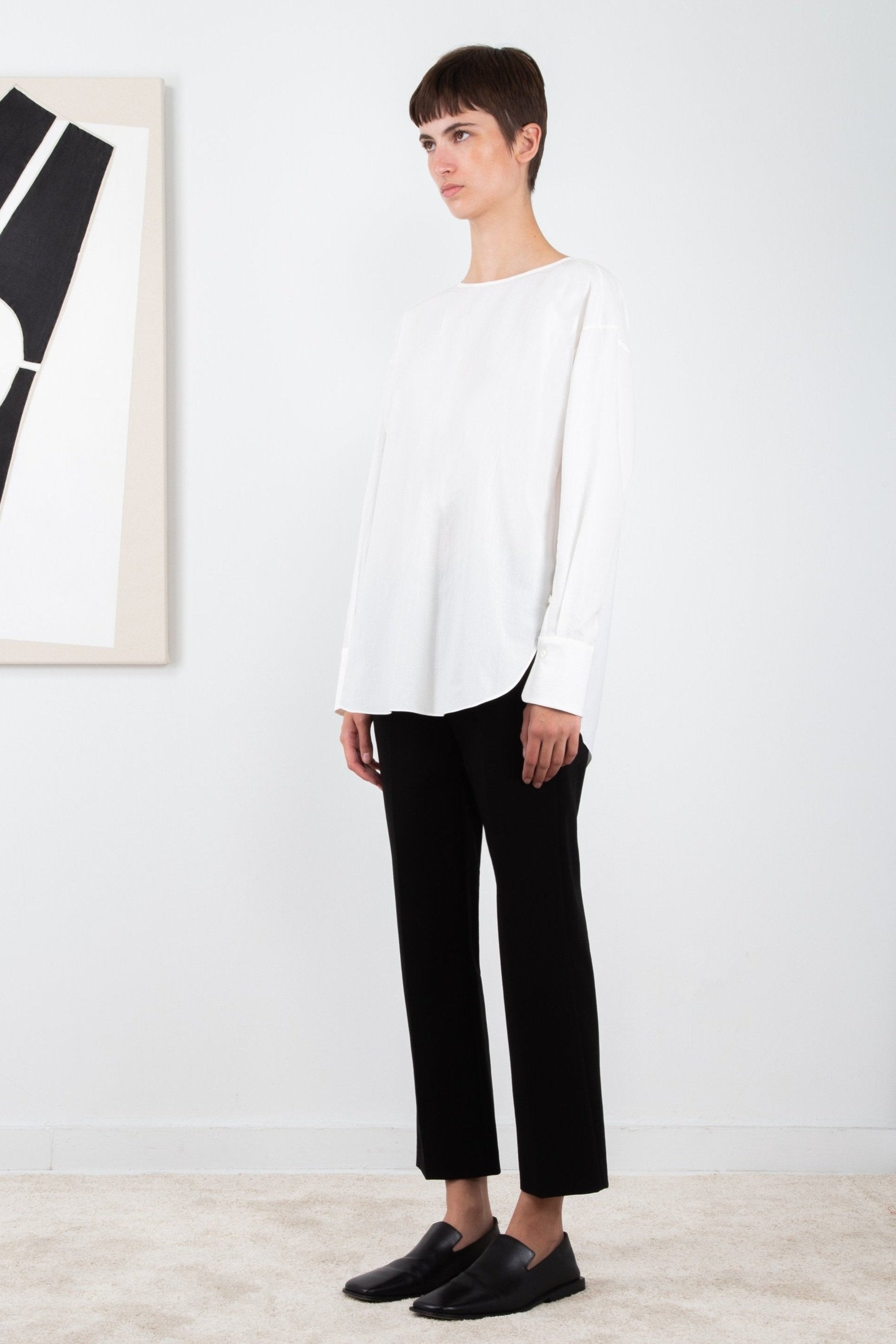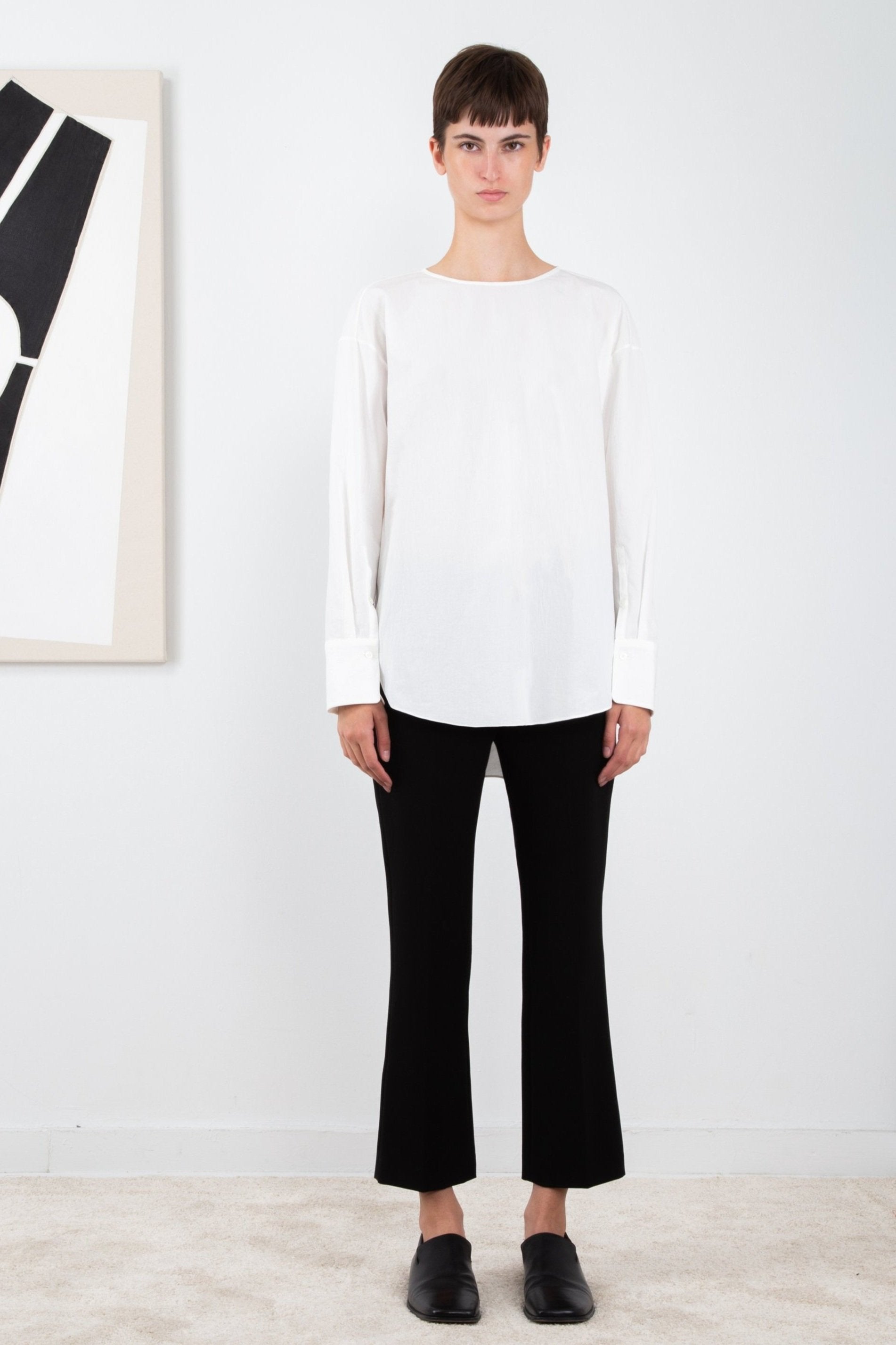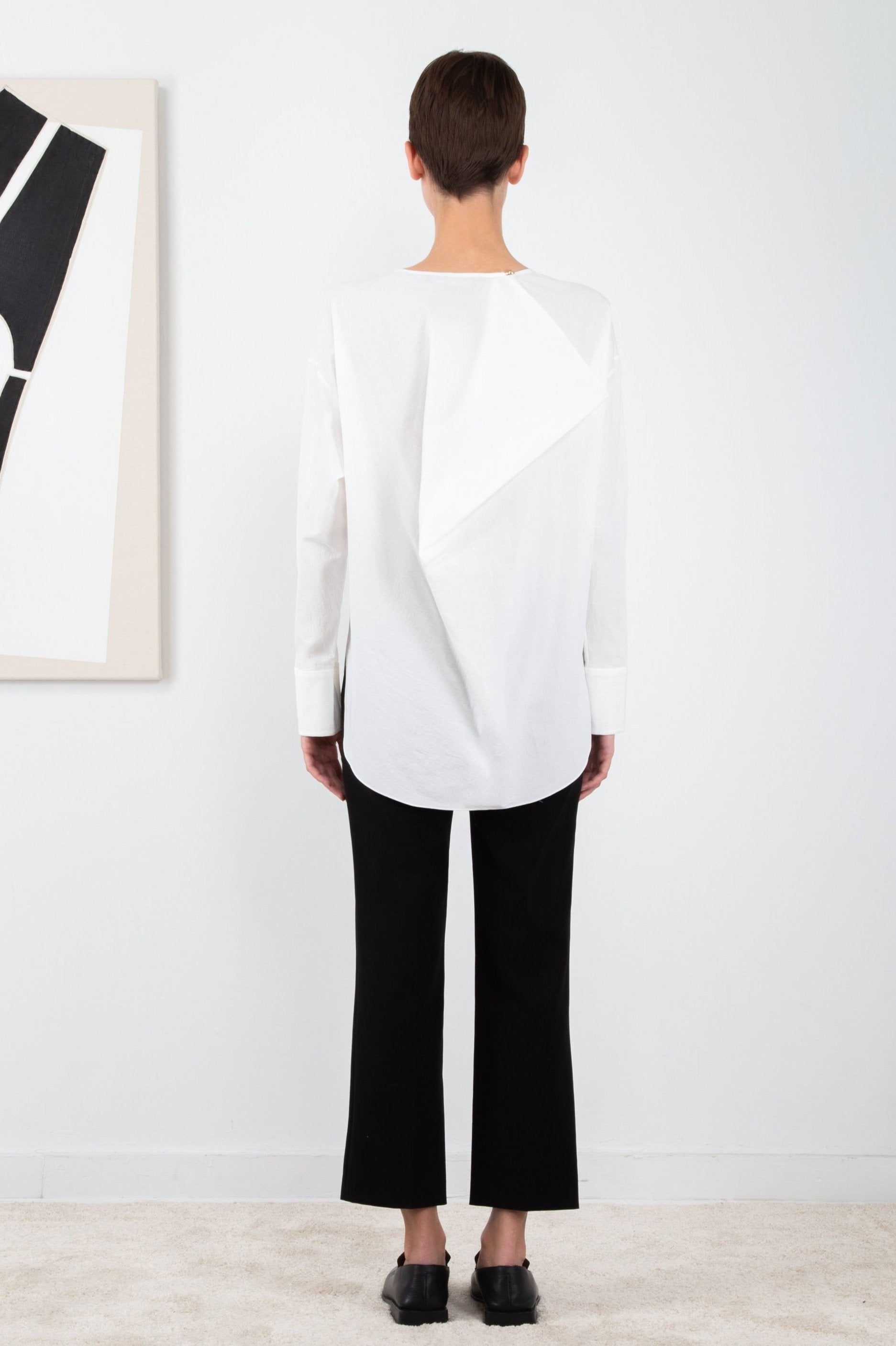 Crafted in a textured organic cotton, the Elena Shirt has a clean, relaxed silhouette with minimal front details and a delicately draped back.