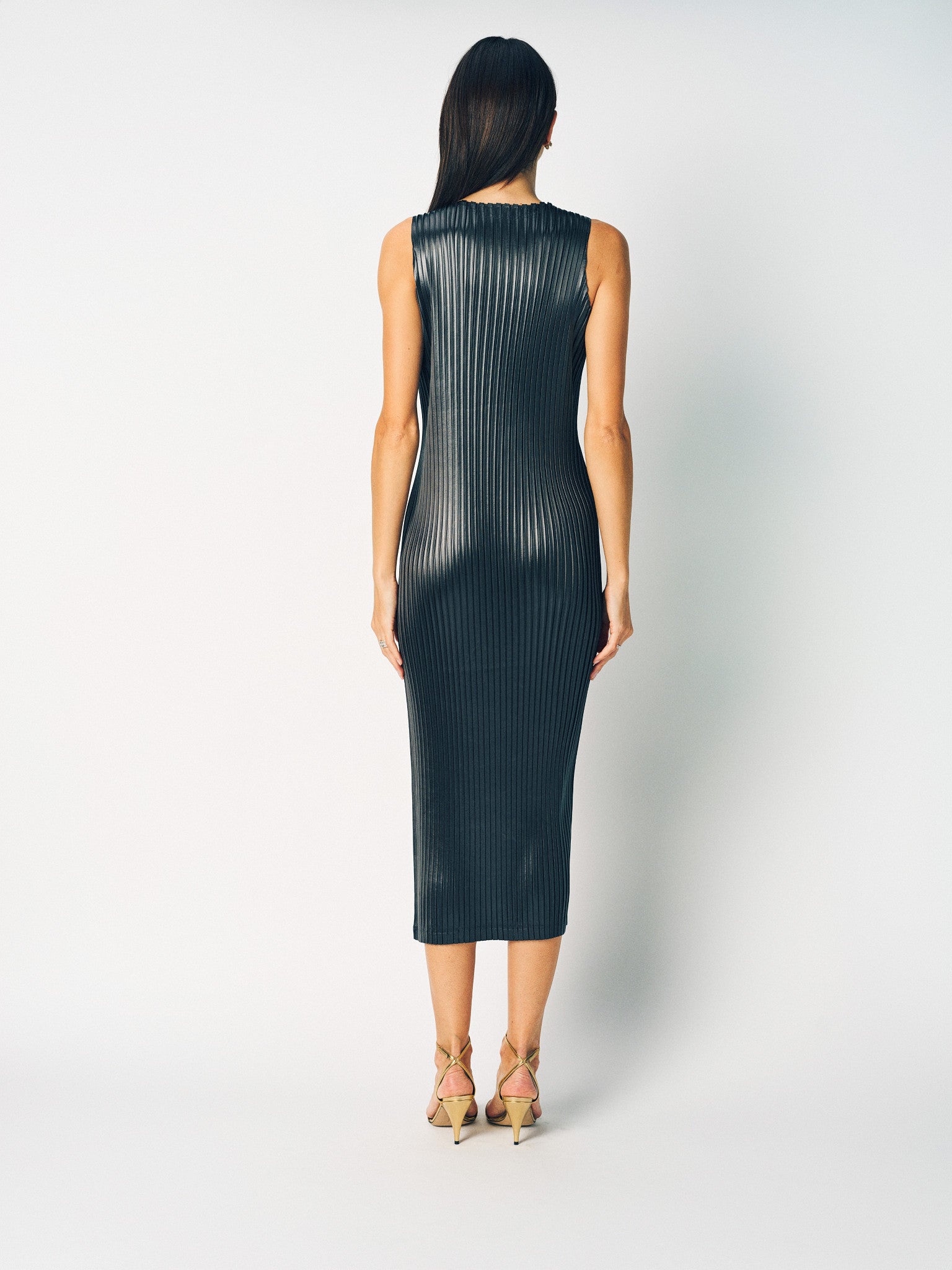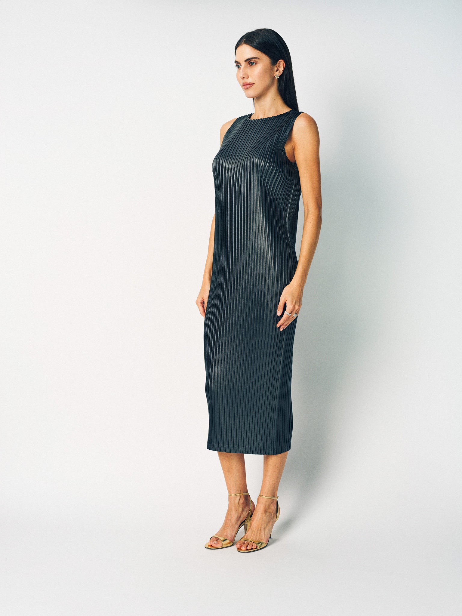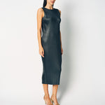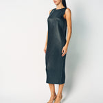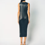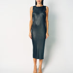 Issey Miyake Glossed Metal Pleats Dress is part of the Fall 25 Collection. This sleeveless dress is characterized by its texture that shines just like metal. After applying a vintage finish to polyester satin to create a soft texture and wrinkling, a calendering process is used to add luster to the fabric, resulting in a unique shine and depth. Designed with a slim silhouette, the dress lets you simply enjoy the unique feel of the material.