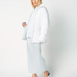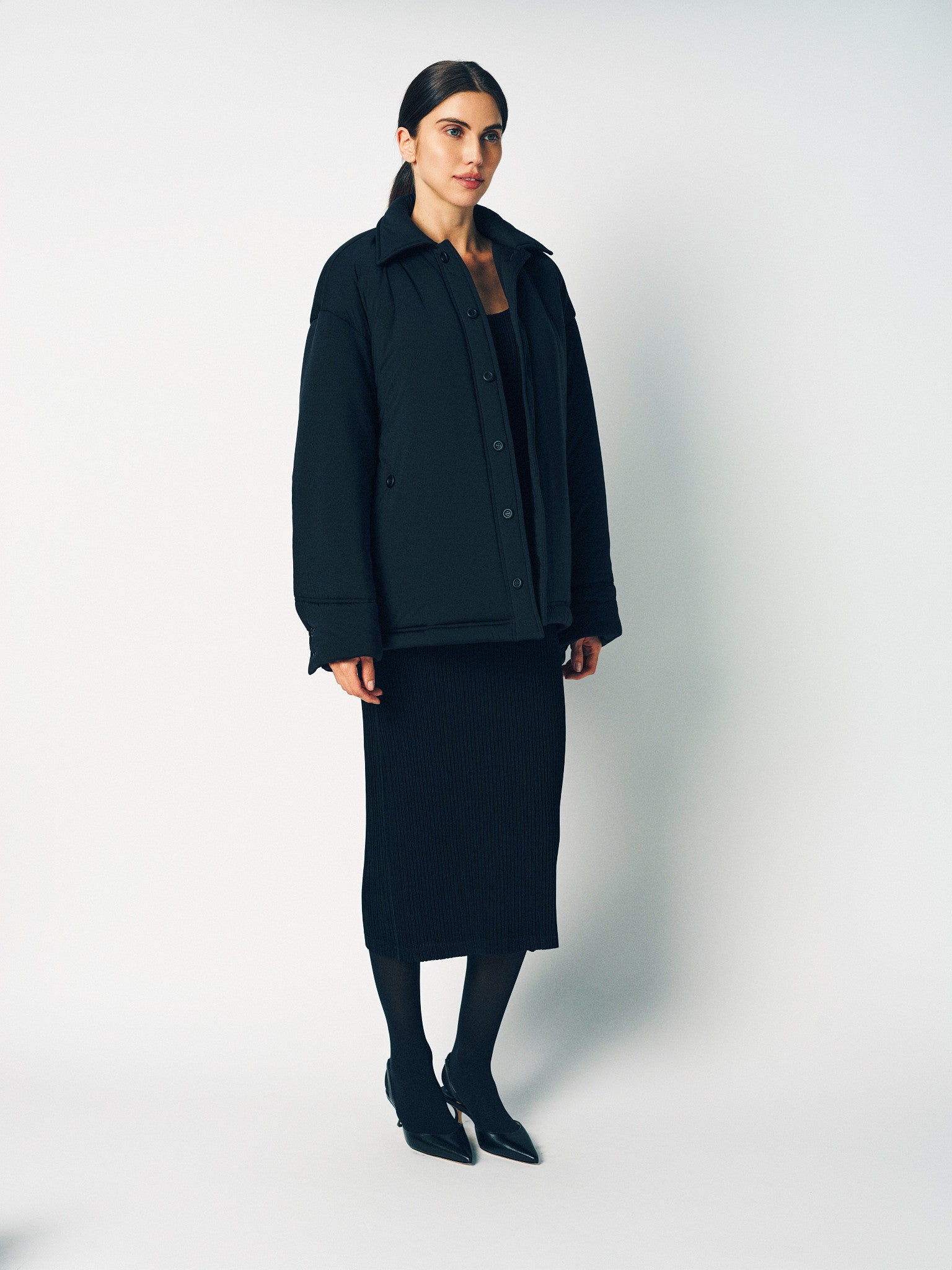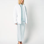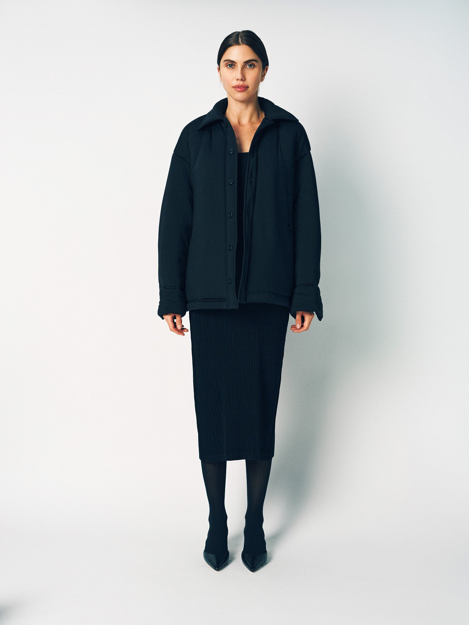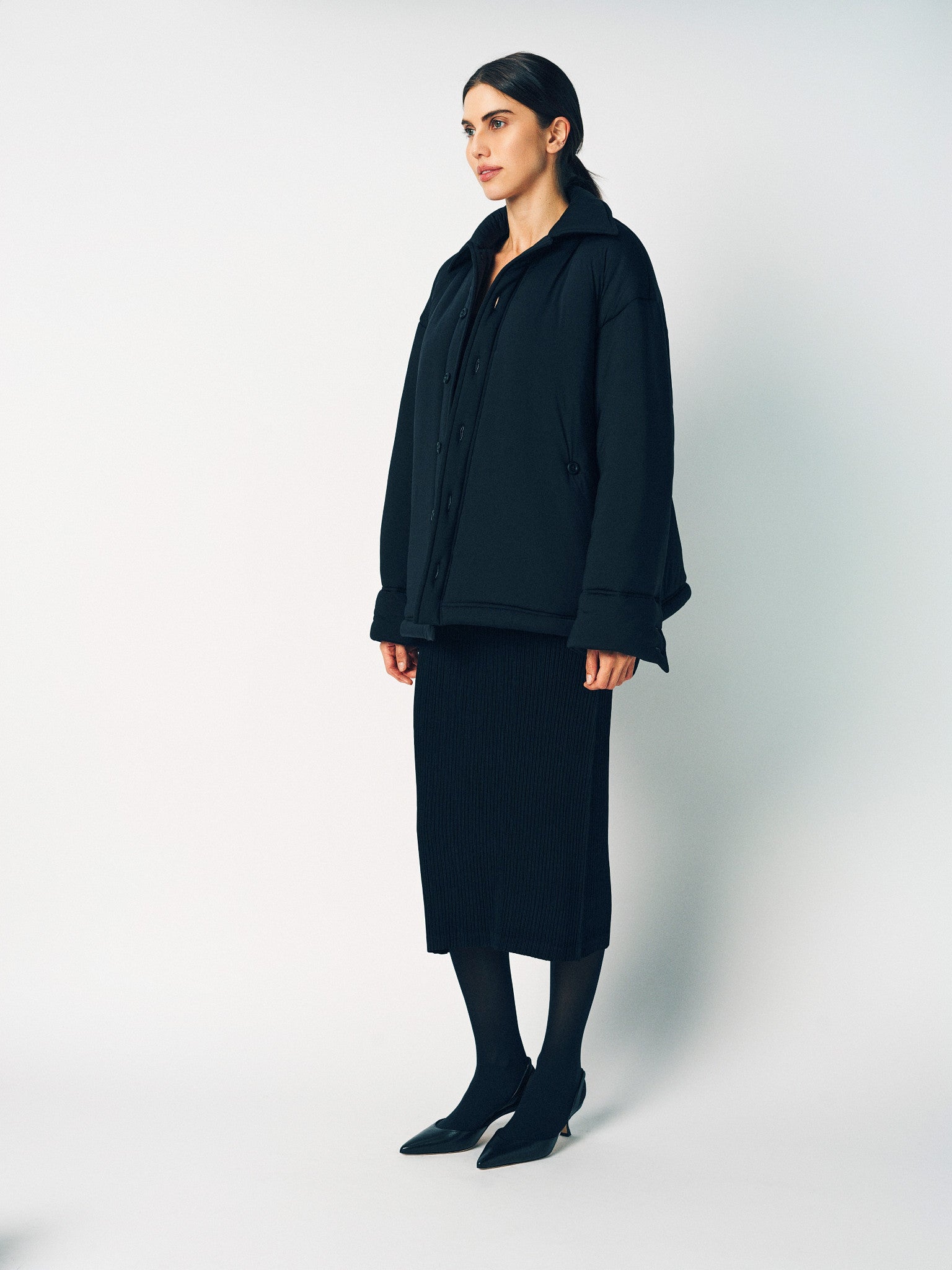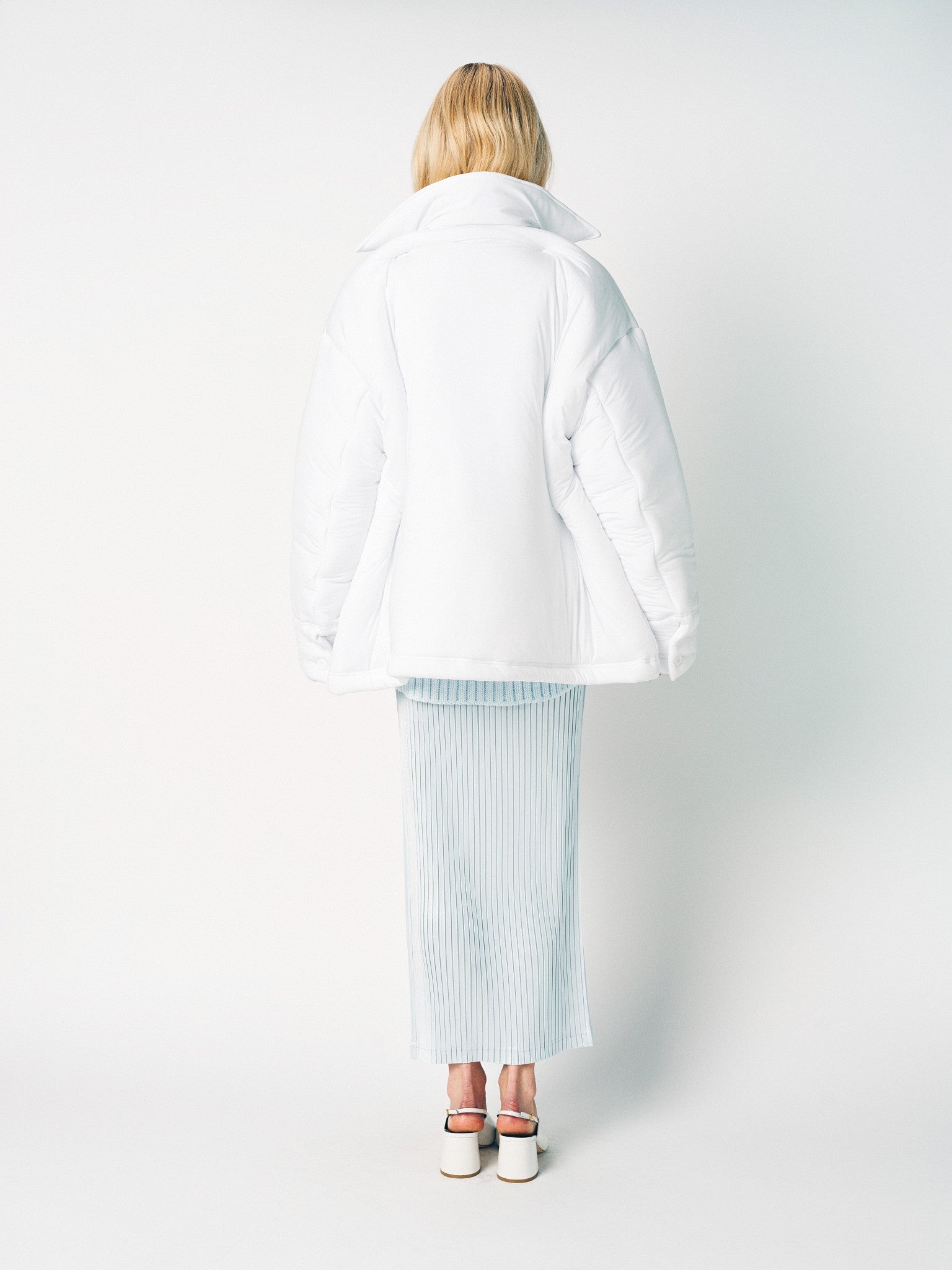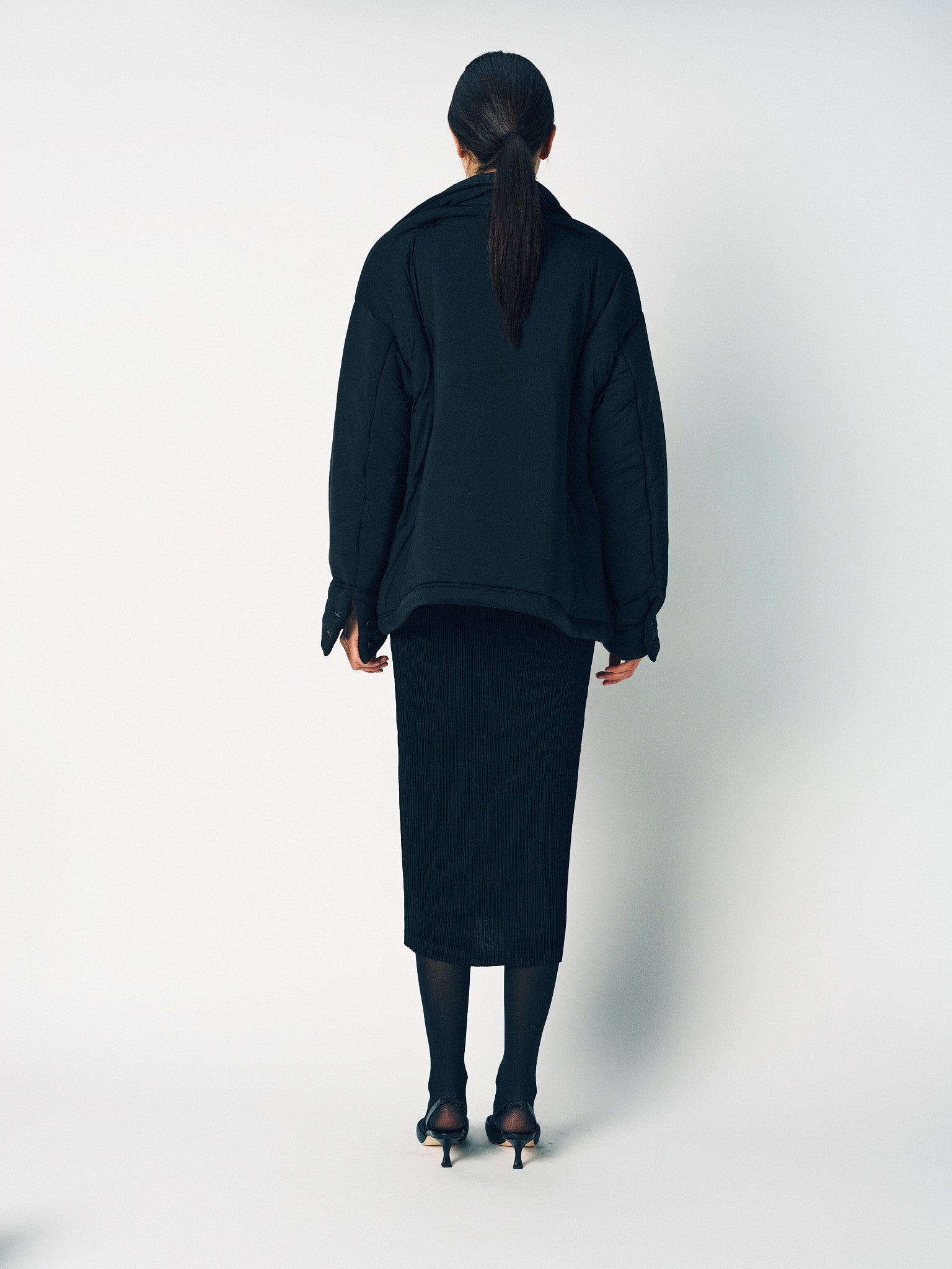 Issey Miyake Pumped T Jacket is part of the Fall 25 Collection. This jacket features inner padding. The unique, billowing form and soft, comfortable feel are achieved by inserting a sheet of padding between layers of ultra-high-density (46-gauge) stretch jersey material. While maintaining a basic silhouette, the added padding gives the jacket a distinctive presence.