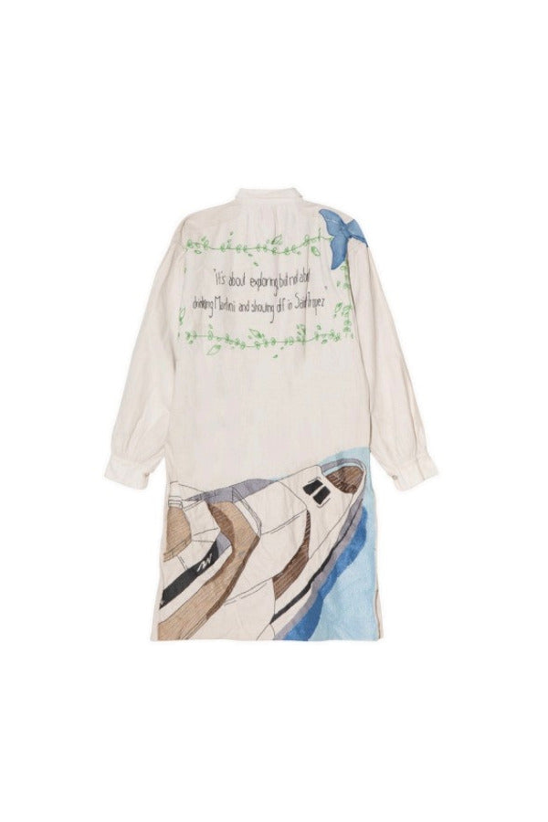 Kilometre's Piece Unique is not just crafted but creatively reborn. These distinctive pieces begin their life as 19th-century French linen shirts, originally designed for workwear, and are transformed through the skilled hands of artisans in Mexico City into stunning displays of heritage and craftsmanship.
