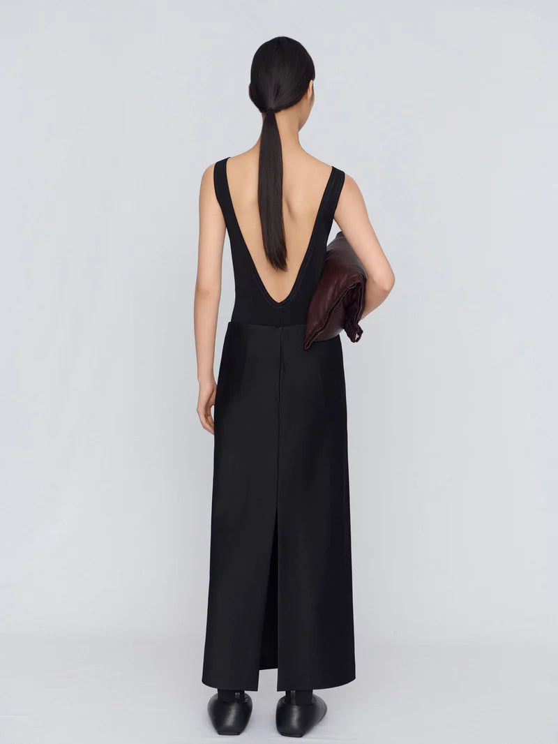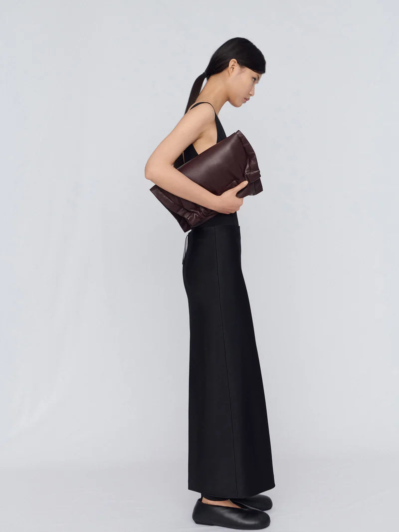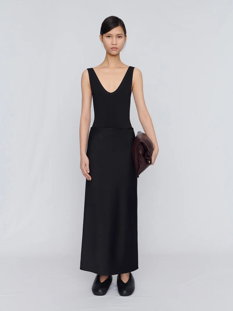 Long skirt in black double satin. The skirt is cut on the bias and has a centre back vent.