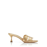 INFO Nappa leather open toe mules featuring circular geometric toe strap and stiletto low heel. |