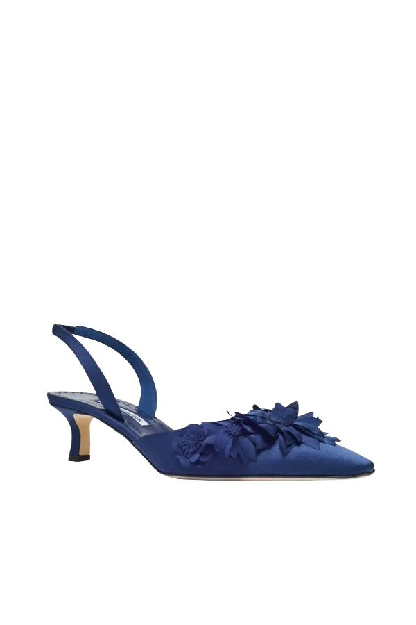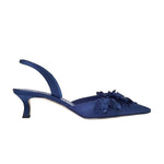 Manolo Blahnik Moislifa Slingback Pumps from the Fall 25 Collection feature a refined crepe satin construction with a pointed toe that enhances elegance. The elasticated slingback ensures a secure, comfortable fit, while the laser-cut floral design adds intricate detail. Finished with an angular low heel, these pumps balance modern style with everyday wearability, making them a sophisticated choice for any wardrobe.