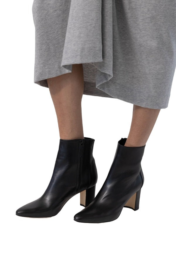 INFO Black nappa leather pointed toe ankle boots featuring side zip closure and block mid heel. |